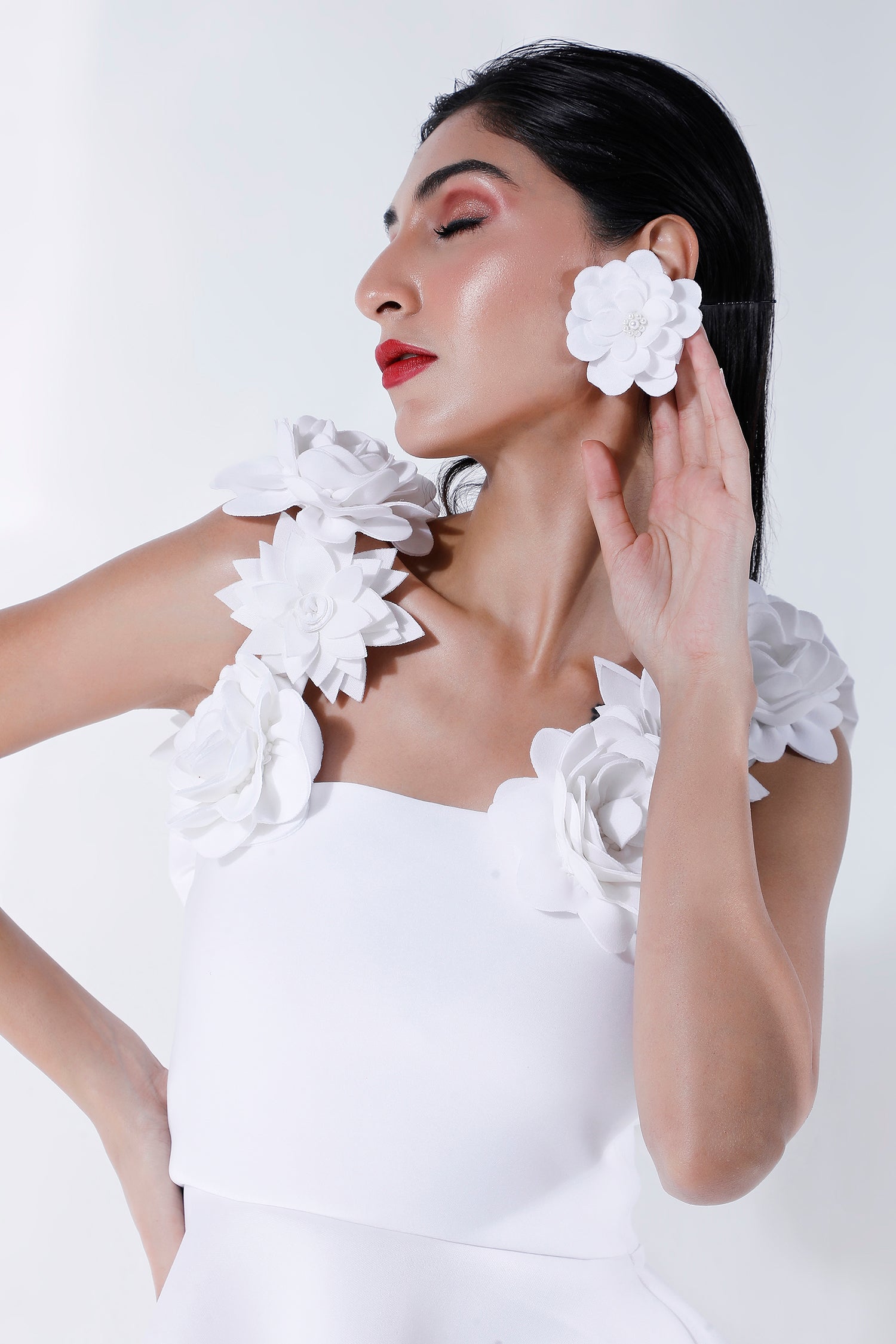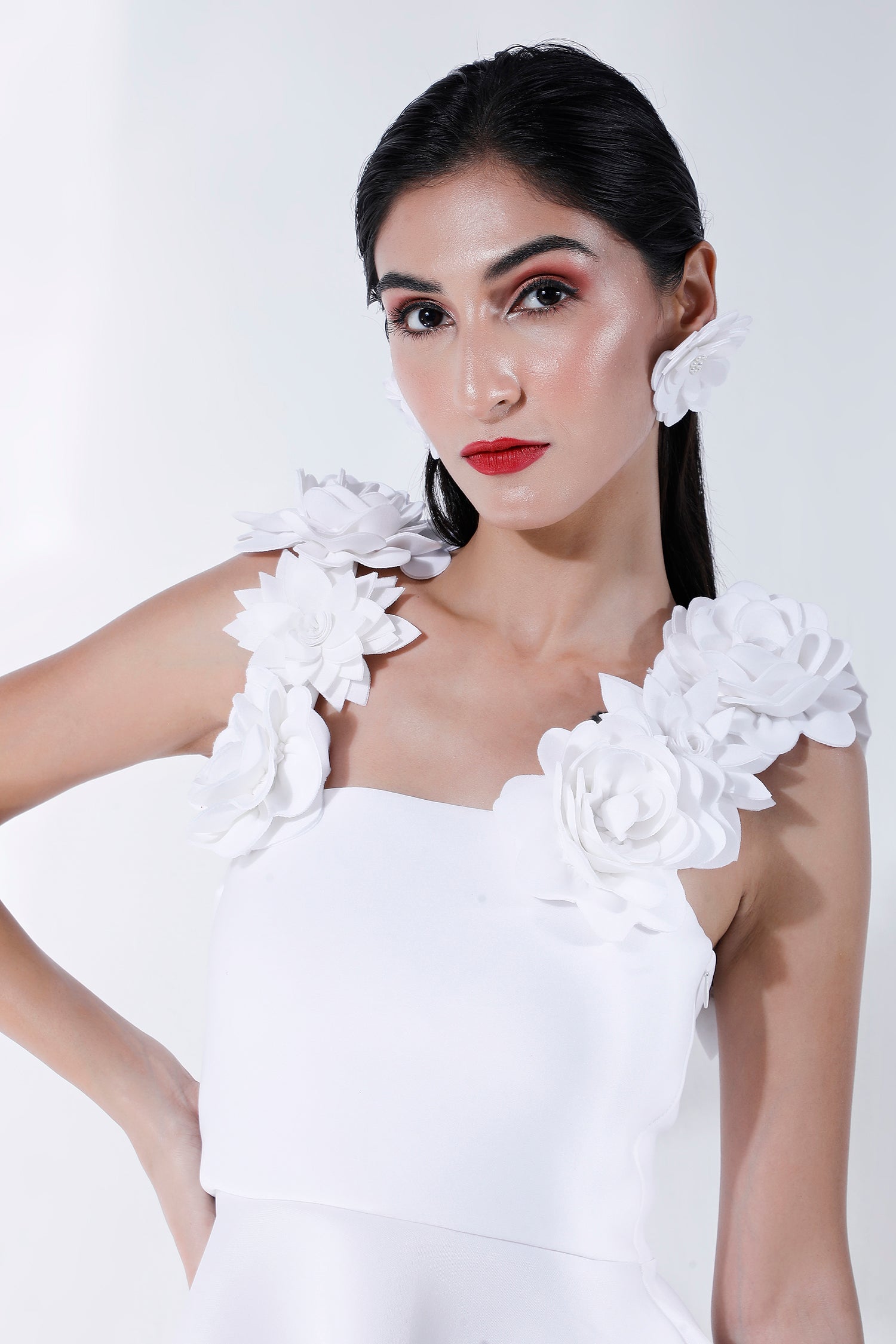 The detachable straps feature handmade flowers which elevate the look of the dress.