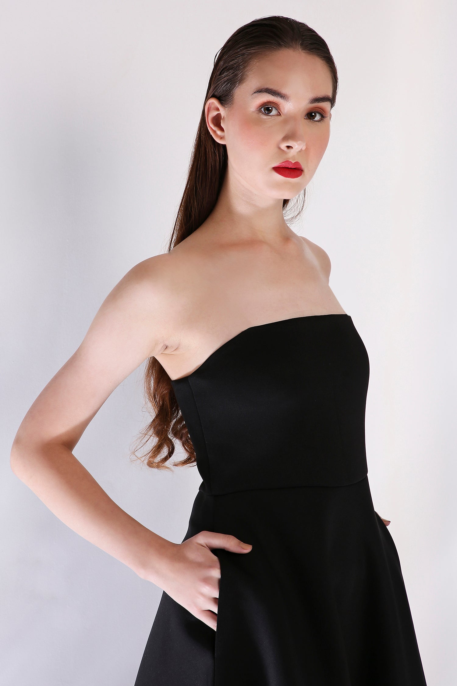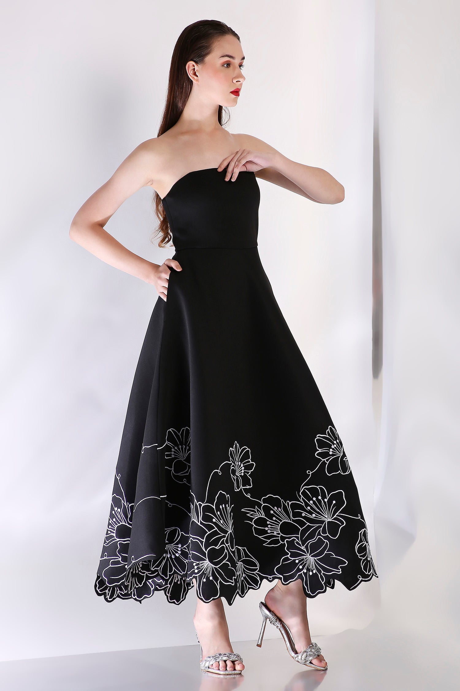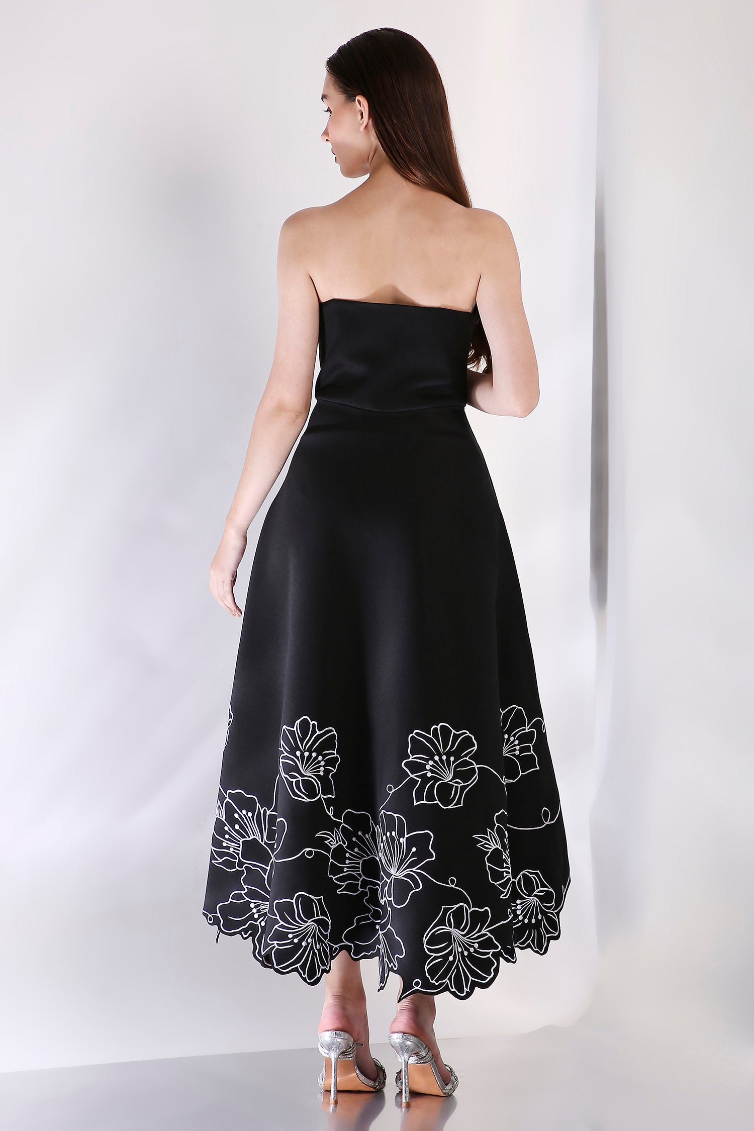 A stunning strapless fit-and-flare mid-calf length dress, crafted from premium neoprene fabric, featuring intricate floral embroidery motifs that elegantly adorn the entire silhouette. The delicate floral details elevate the dress, offering a sophisticated balance of modern design and timeless elegance—perfect for any formal occasion.