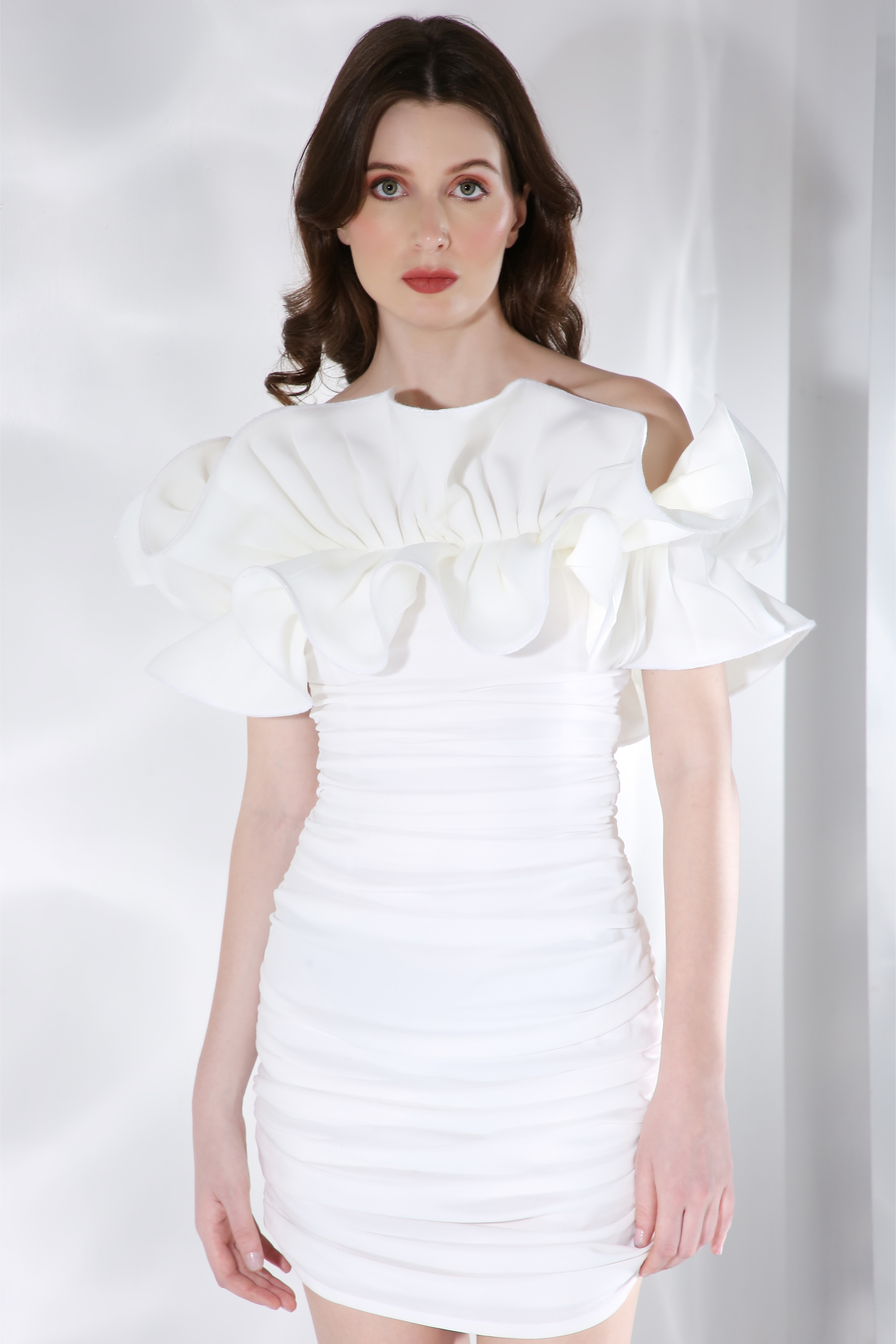 Featuring a gathered bodycon dress with a detachable feather wrap. You can also wear the wrap as a standalone crop. The wrap comes with hand embroidered feathers at the front and back.