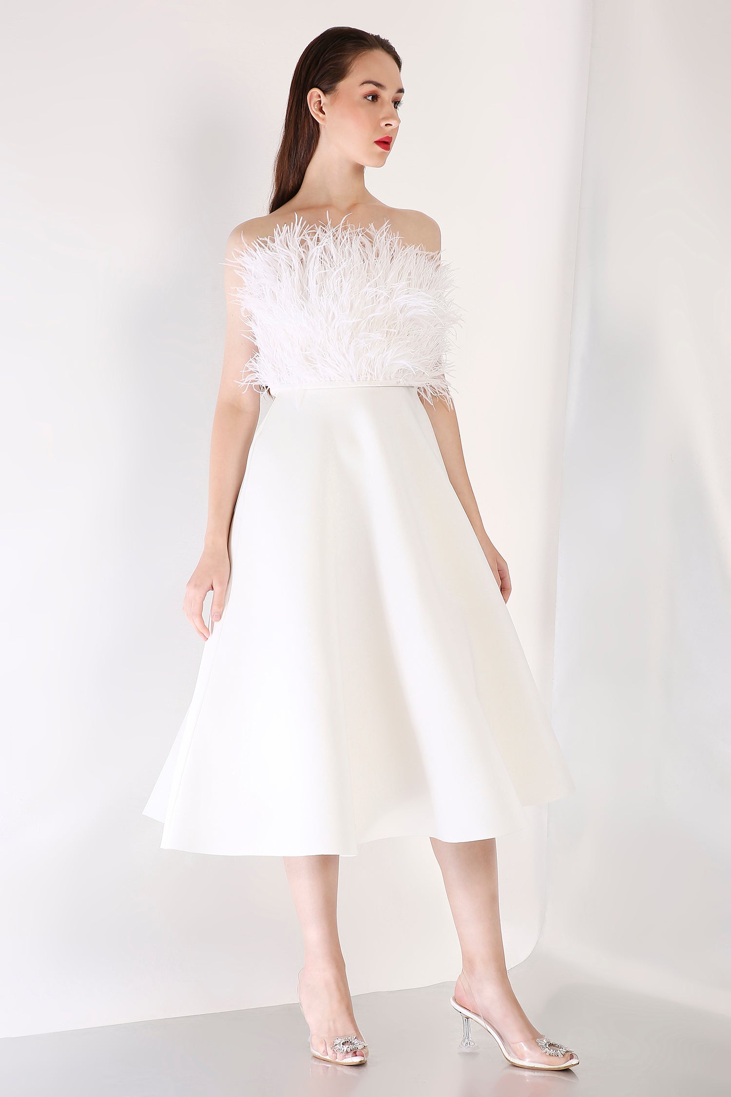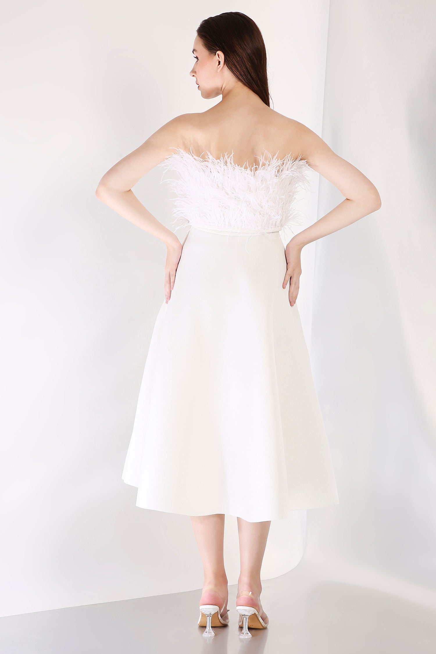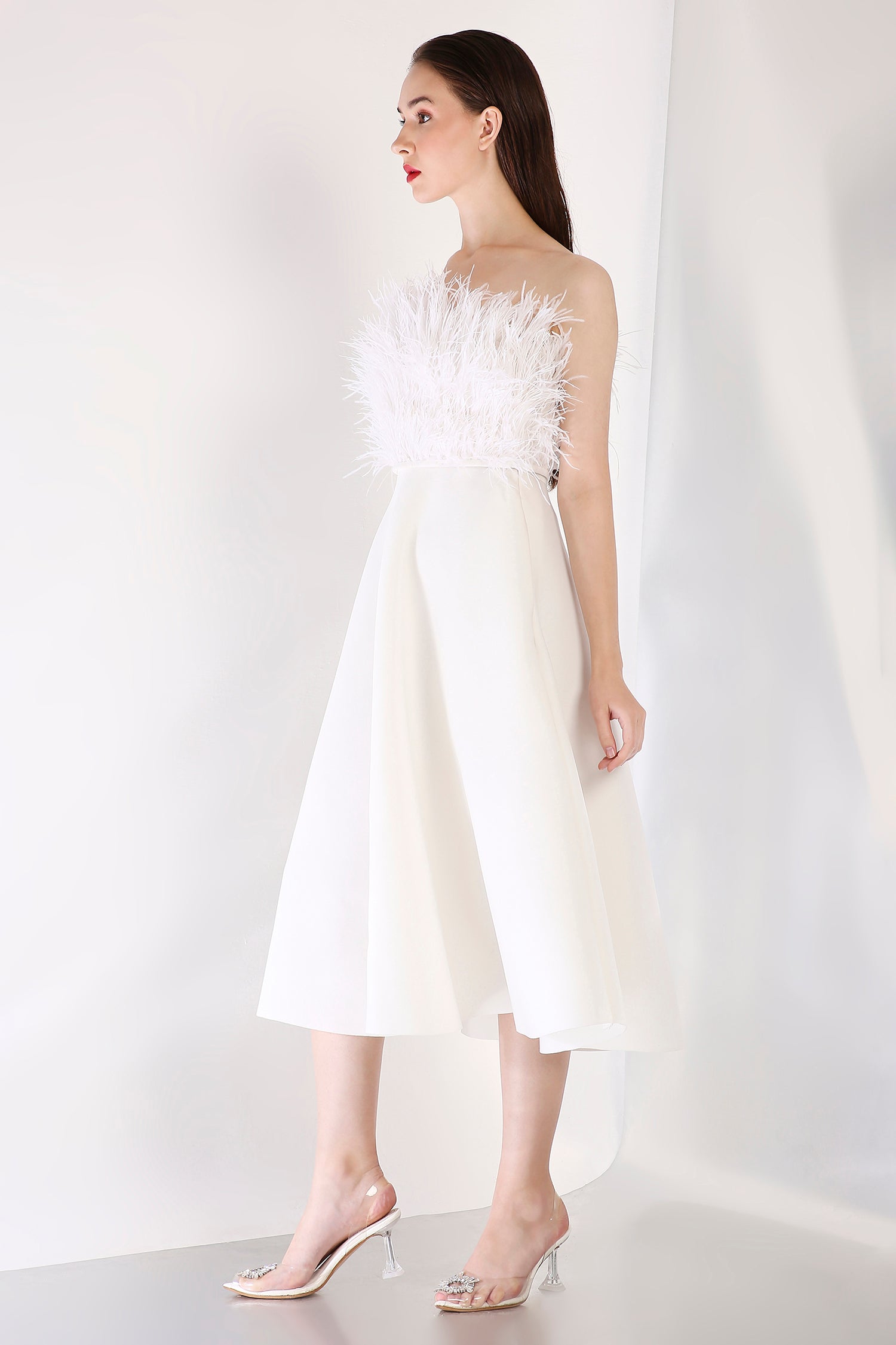 This luxurious strapless midi dress features a flattering fit-and-flare shape and is paired with a stunning feather wrap in a tube style. Perfect for those seeking a bold, yet refined look, the feather detail adds a touch of drama and elegance, ideal for any high-profile event.