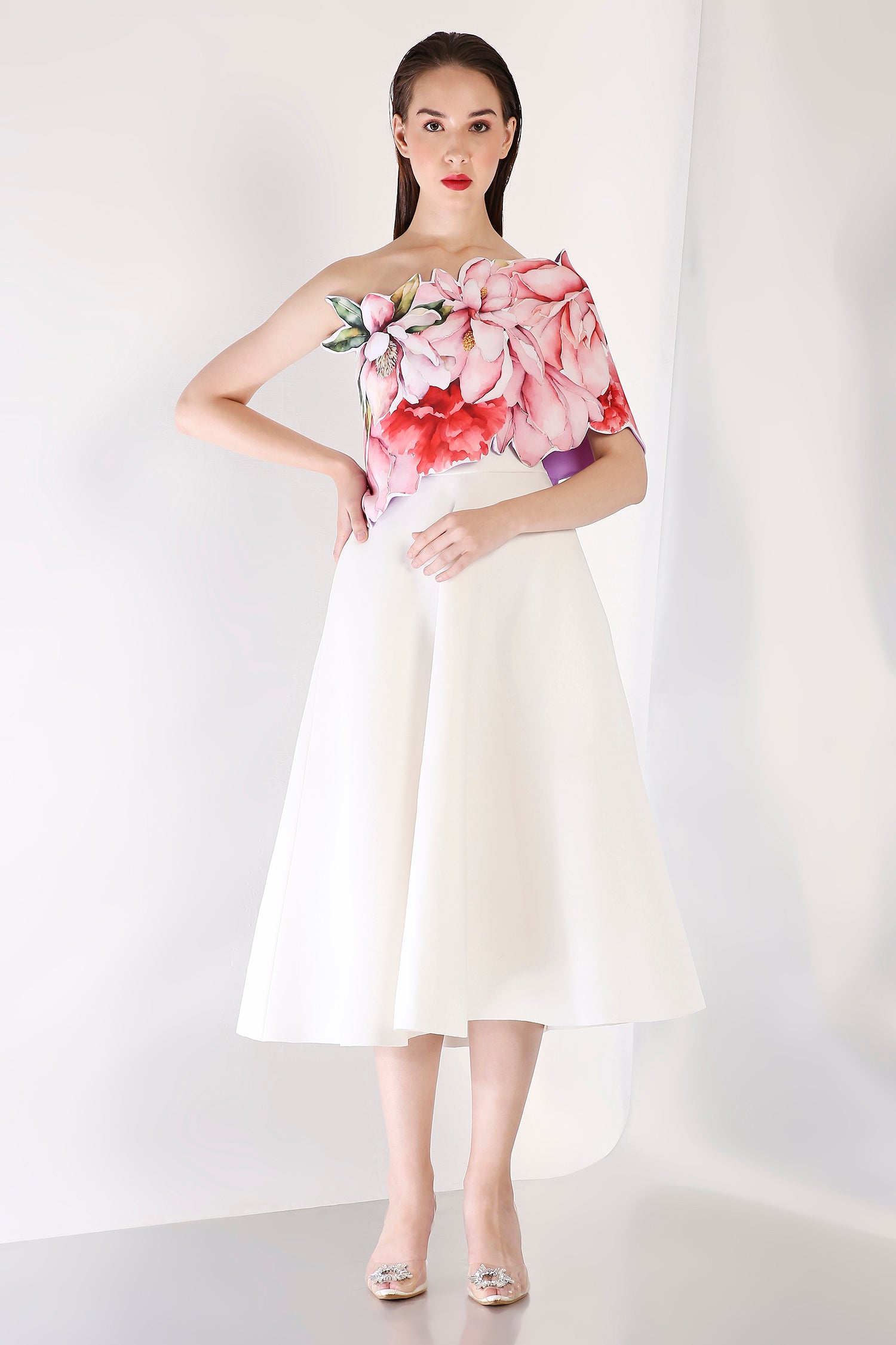 Refined femininity defines this strapless midi dress, beautifully complemented by a floral printed wrap. Styled one-shoulder or off-shoulder, it adds an enchanting touch to the silhouette.