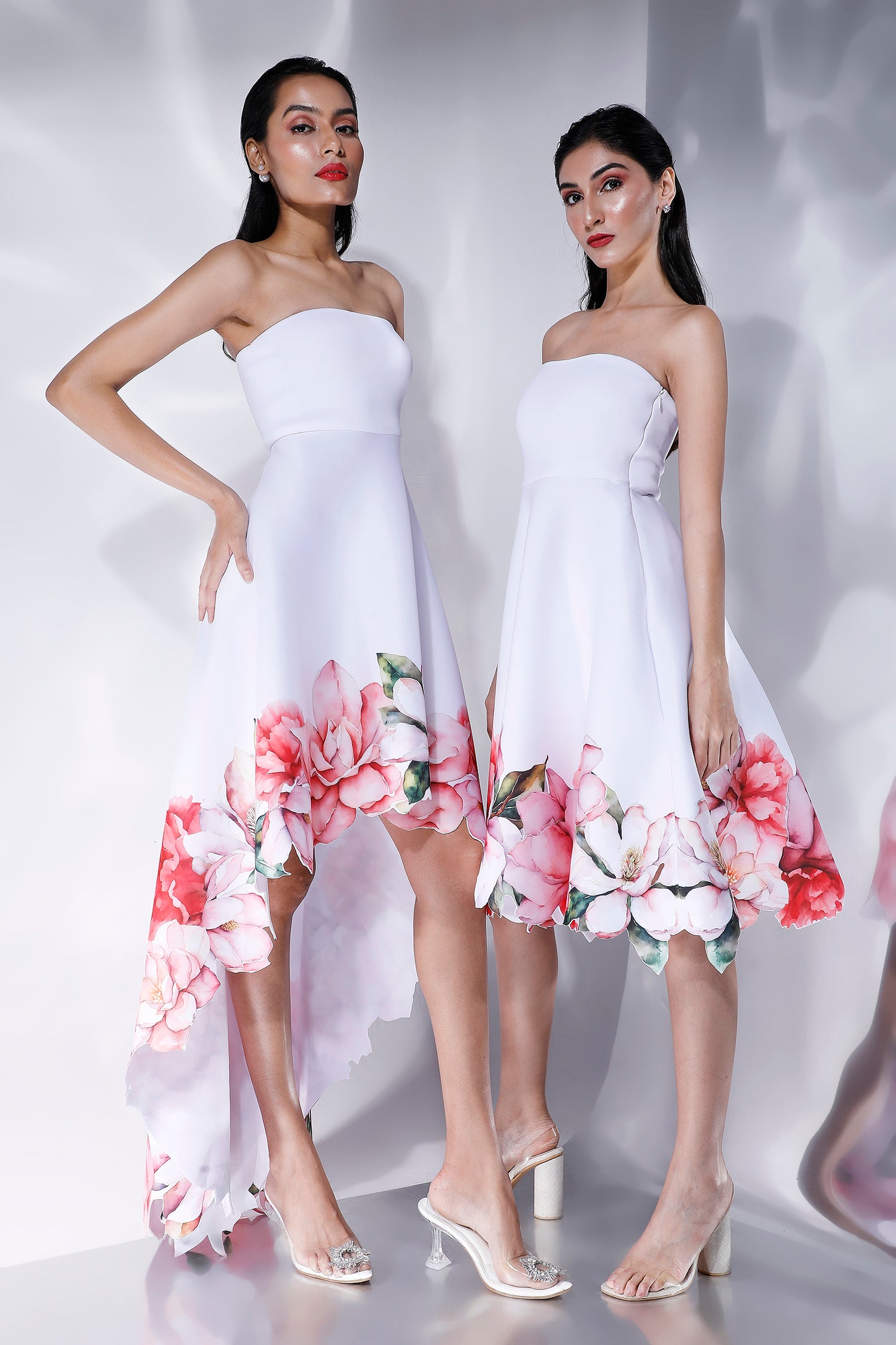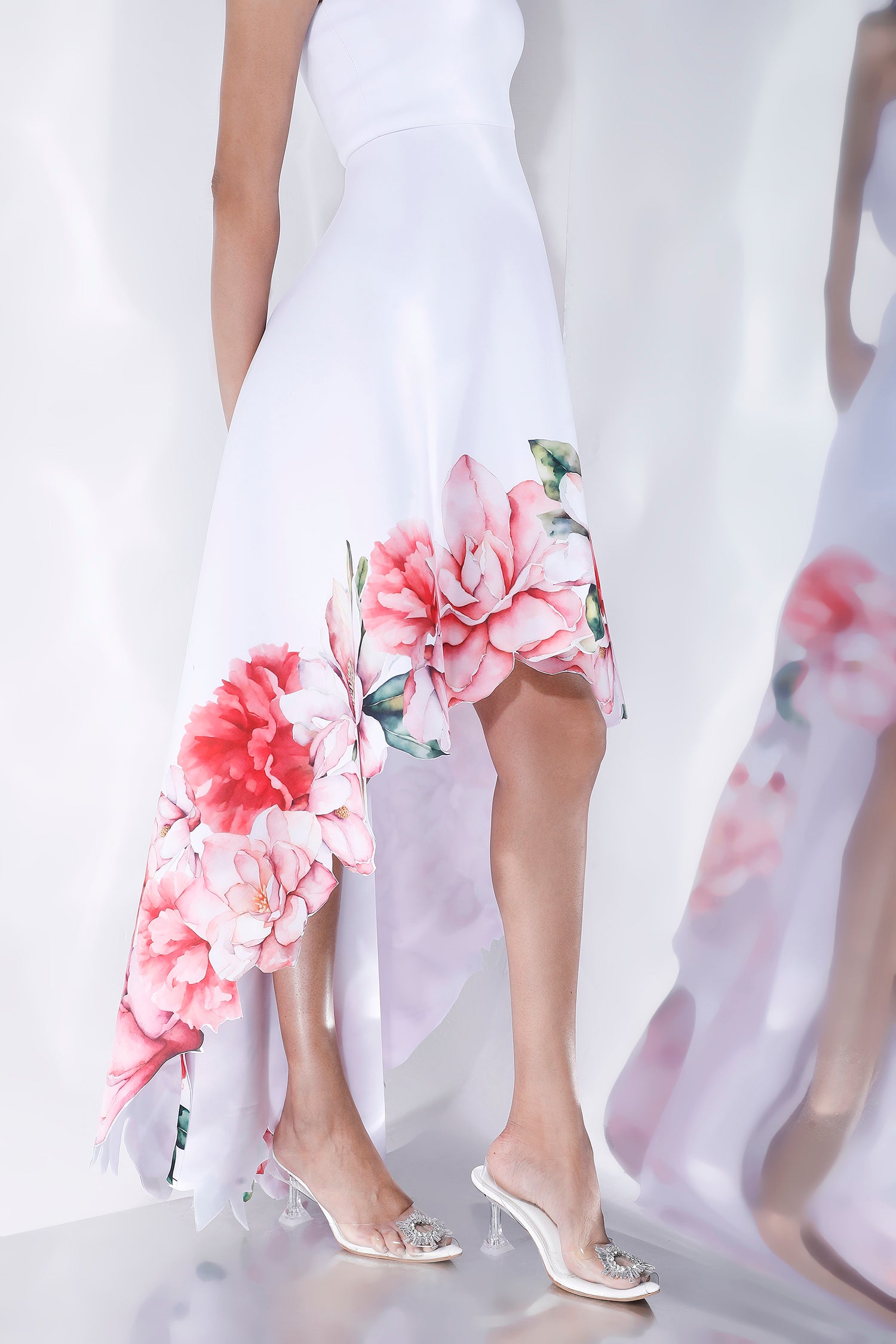 The Giselle dress embodies subtle elegance with its intricate floral design, emphasised with cutwork around the hem and a flowing high-low silhouette.