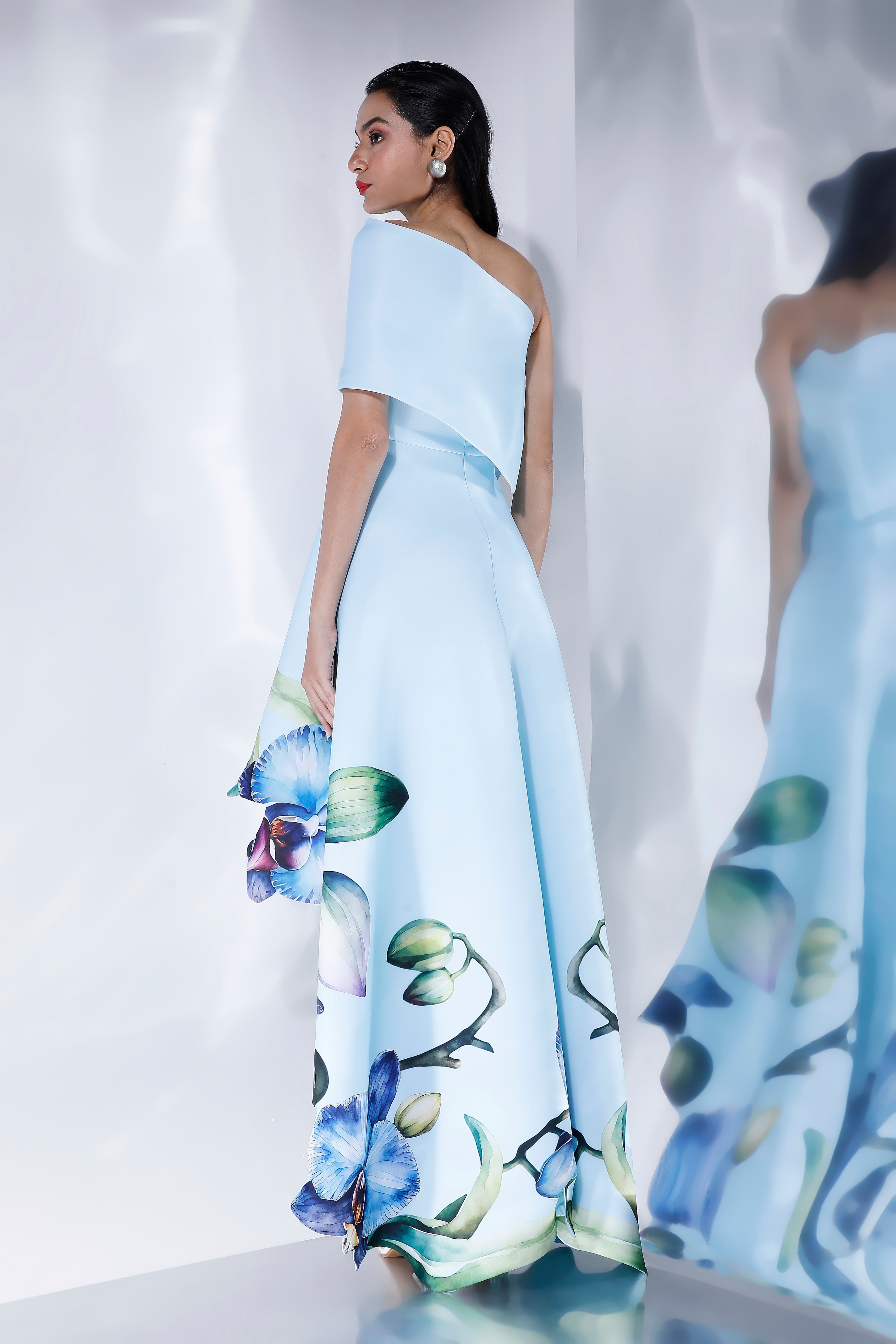 The Oriana dress embodies elegance with its intricate floral design, emphasised with cutwork around the hem and a flowing high-low silhouette.