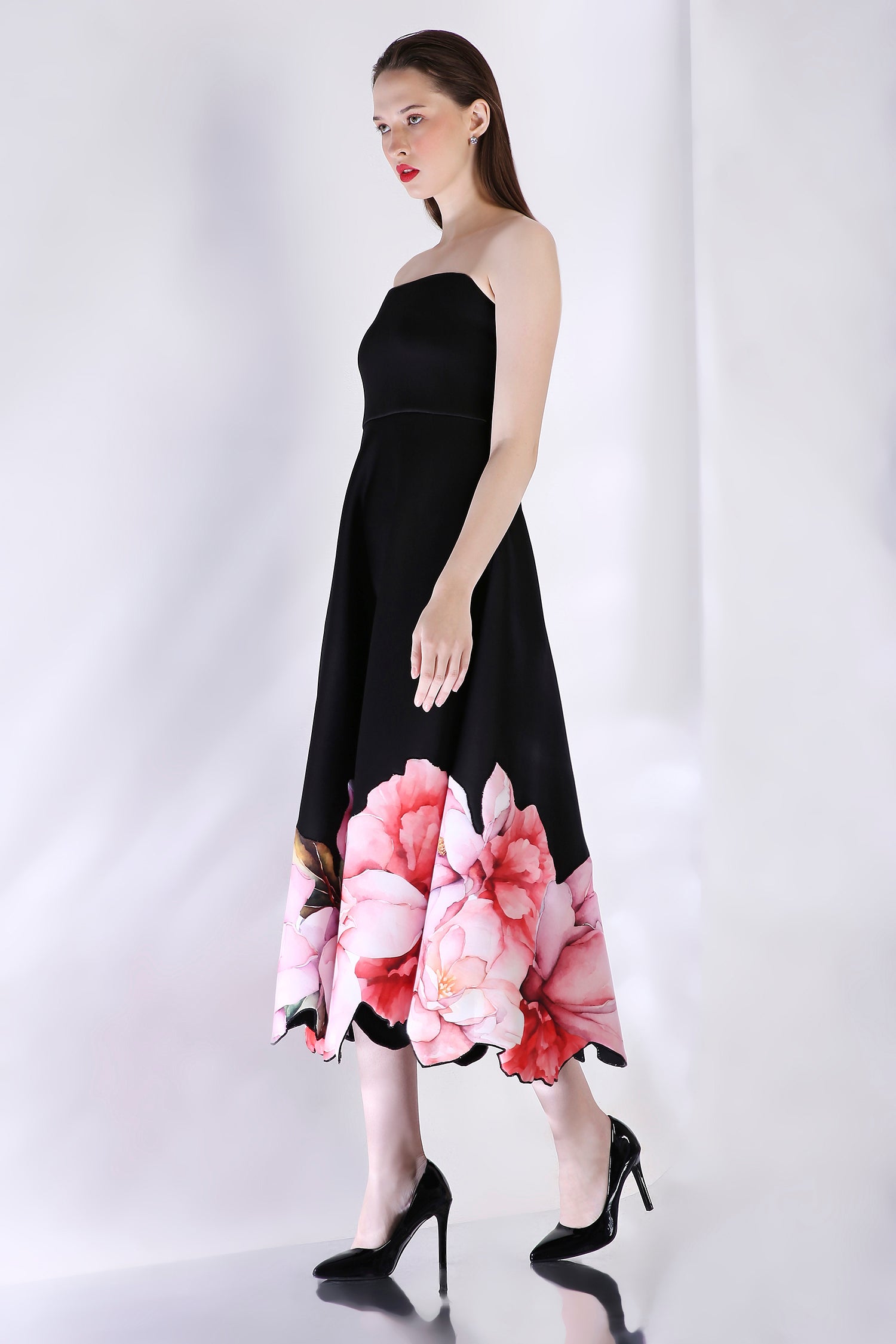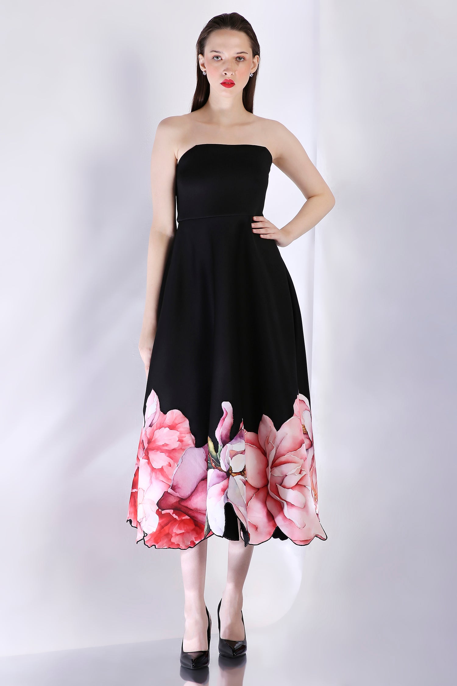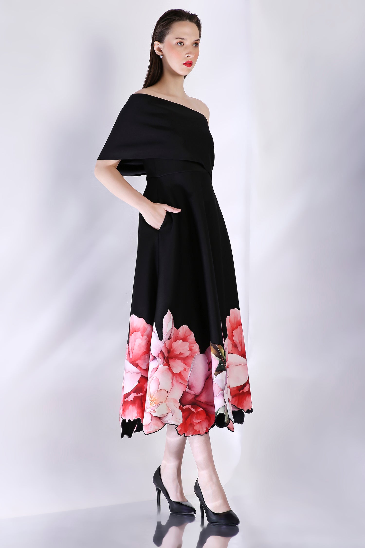 The base garment is strapless and has attached noodle straps. Pair this with the versatile detachable wrap for a one shoulder or off-shoulder look.
