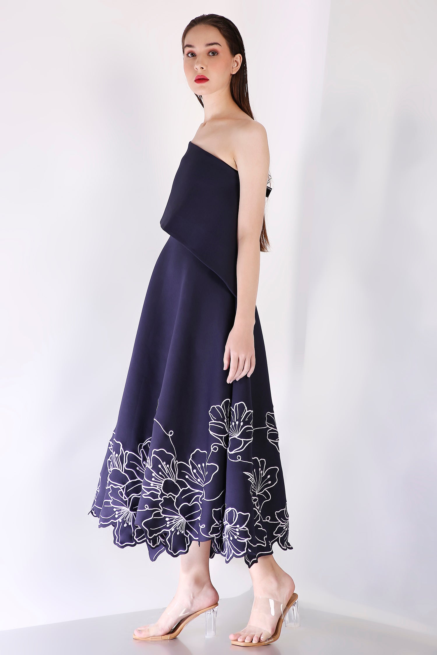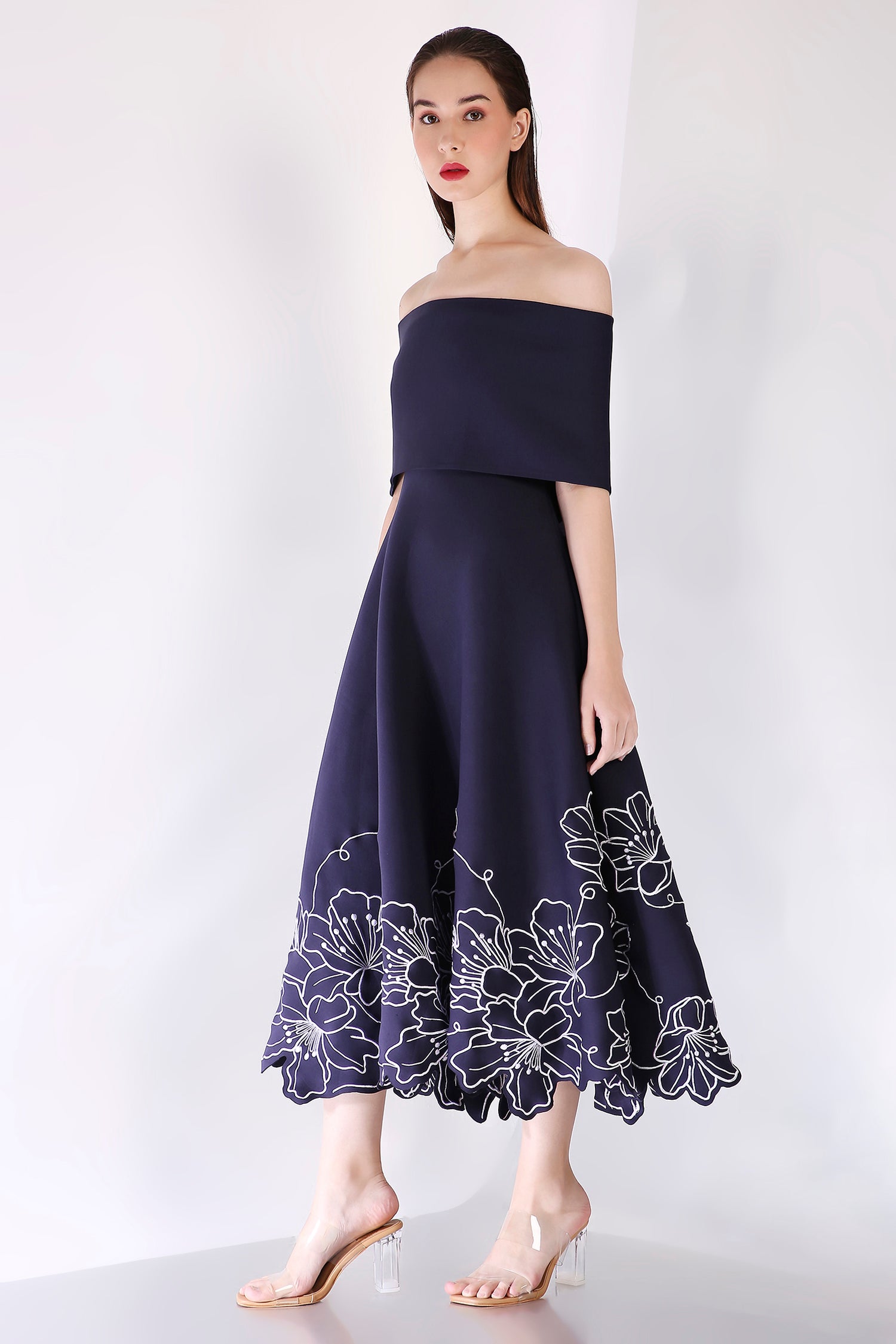 A strapless fit-and-flare mid-calf dress in premium neoprene, adorned with intricate floral embroidery motifs that elegantly cover the entire silhouette.