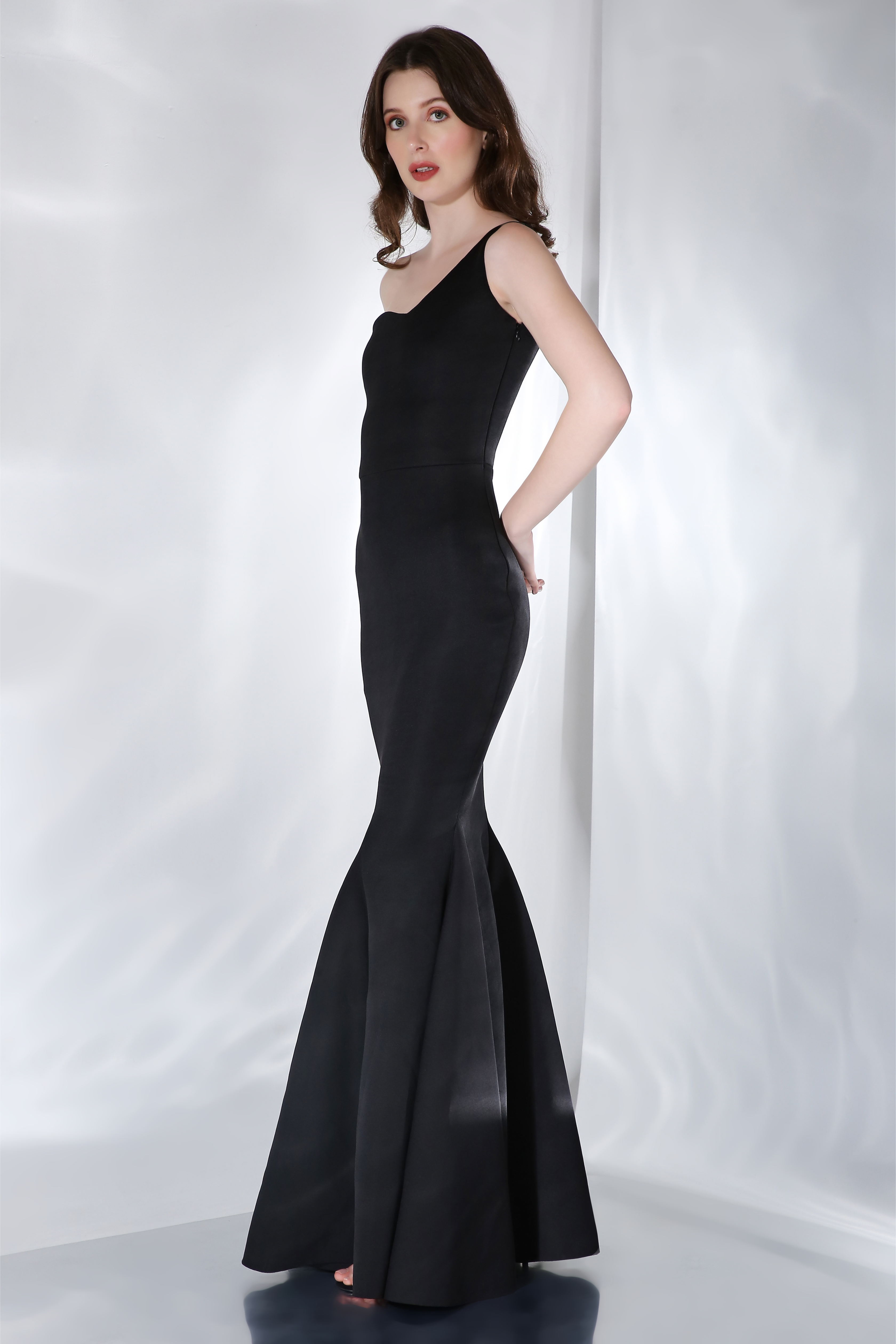 Featuring a one shoulder panelled gown which accentuates your body in a fish cut silhouette. Hugging all your curves perfectly with a flattering fit, since is a made-to-measure product, you can also specify the exact length desired by you.