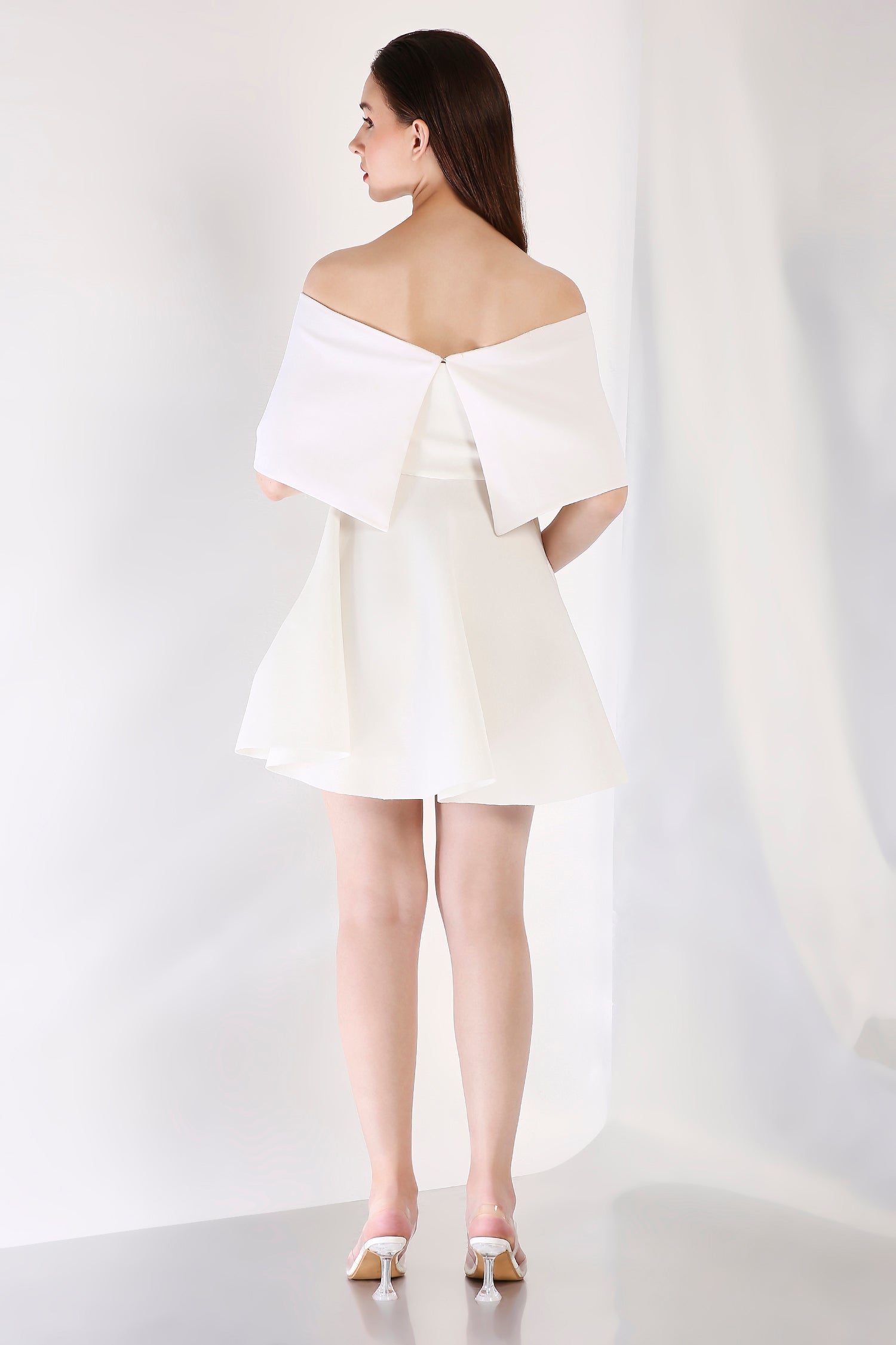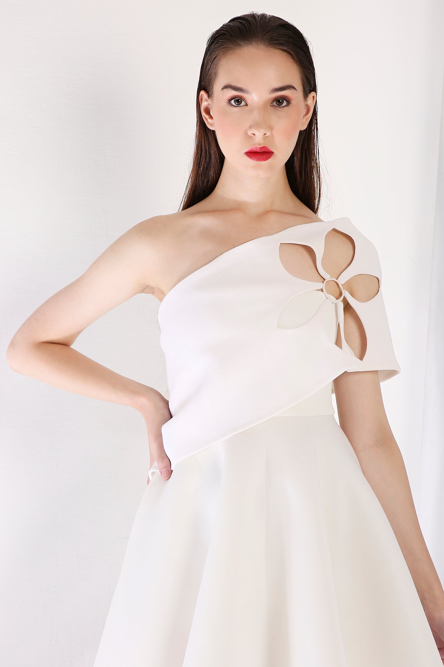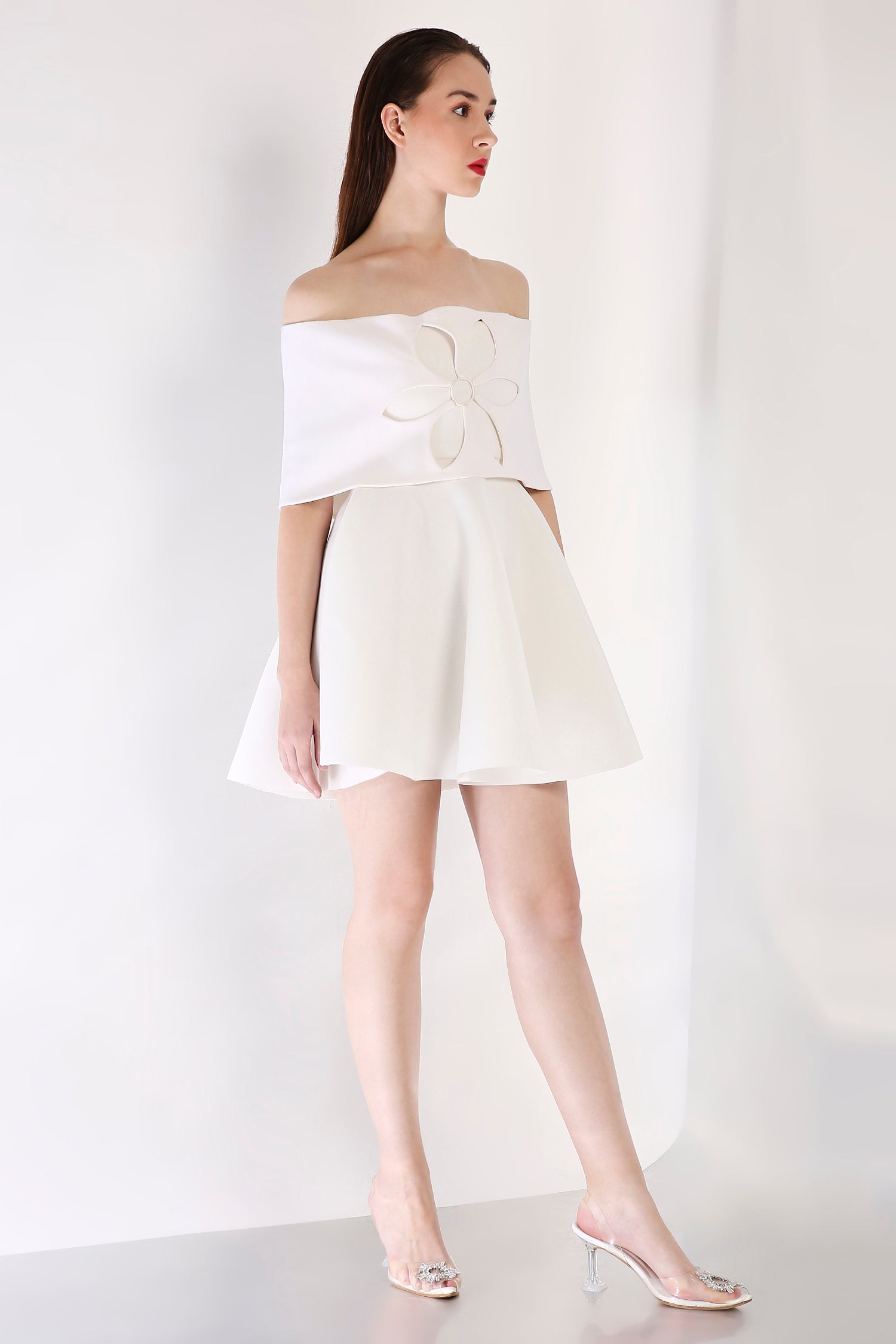 An ode to effortless sophistication, this strapless fit-and-flare short dress is paired with a daffodil cutout wrap. Its versatile styling—one-shoulder or off-shoulder—adds a sculptural touch to this refined ensemble.