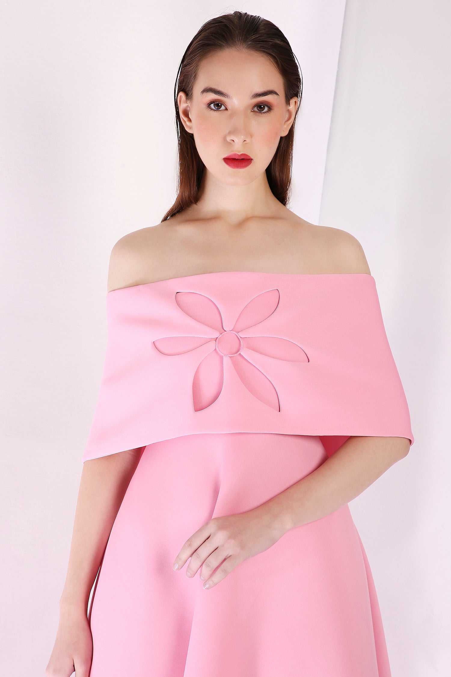 A strapless fit-and-flare dress in premium neoprene with a cutout floral motif on the hem, complemented by a cutout wrap that can be styled one-shoulder or off-shoulder. This ensemble offers chic versatility and refined elegance.