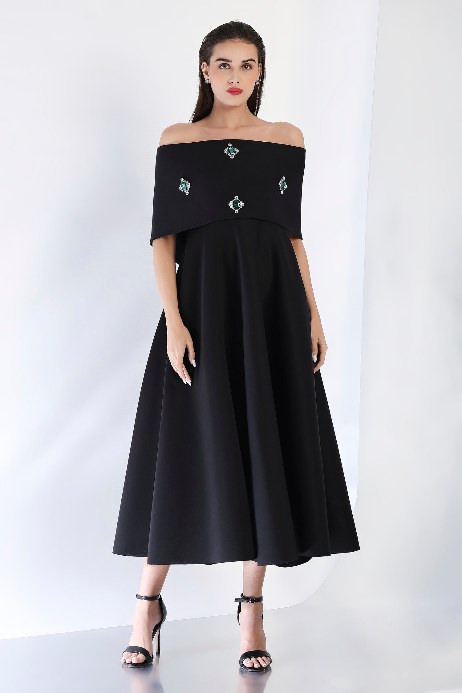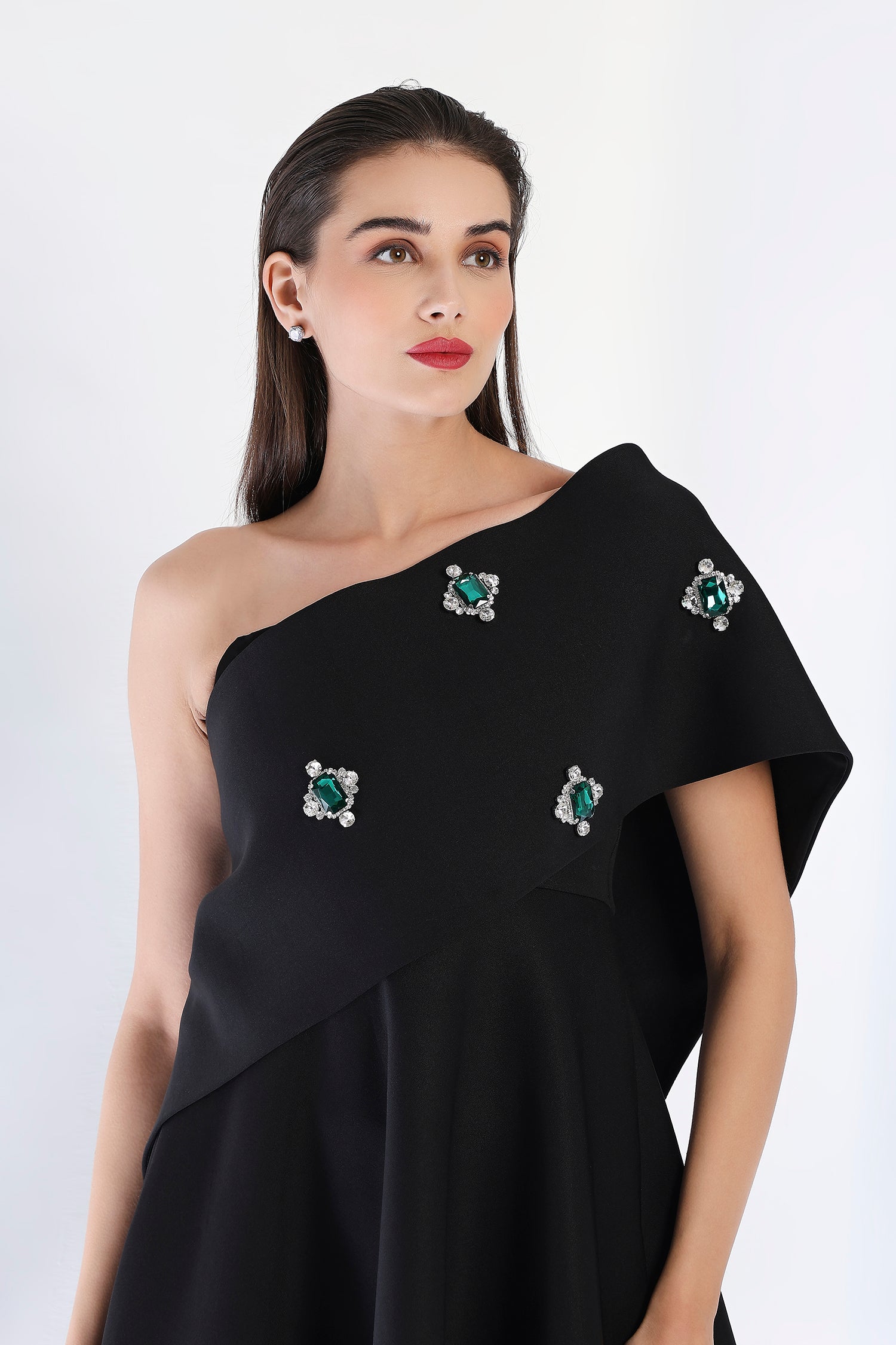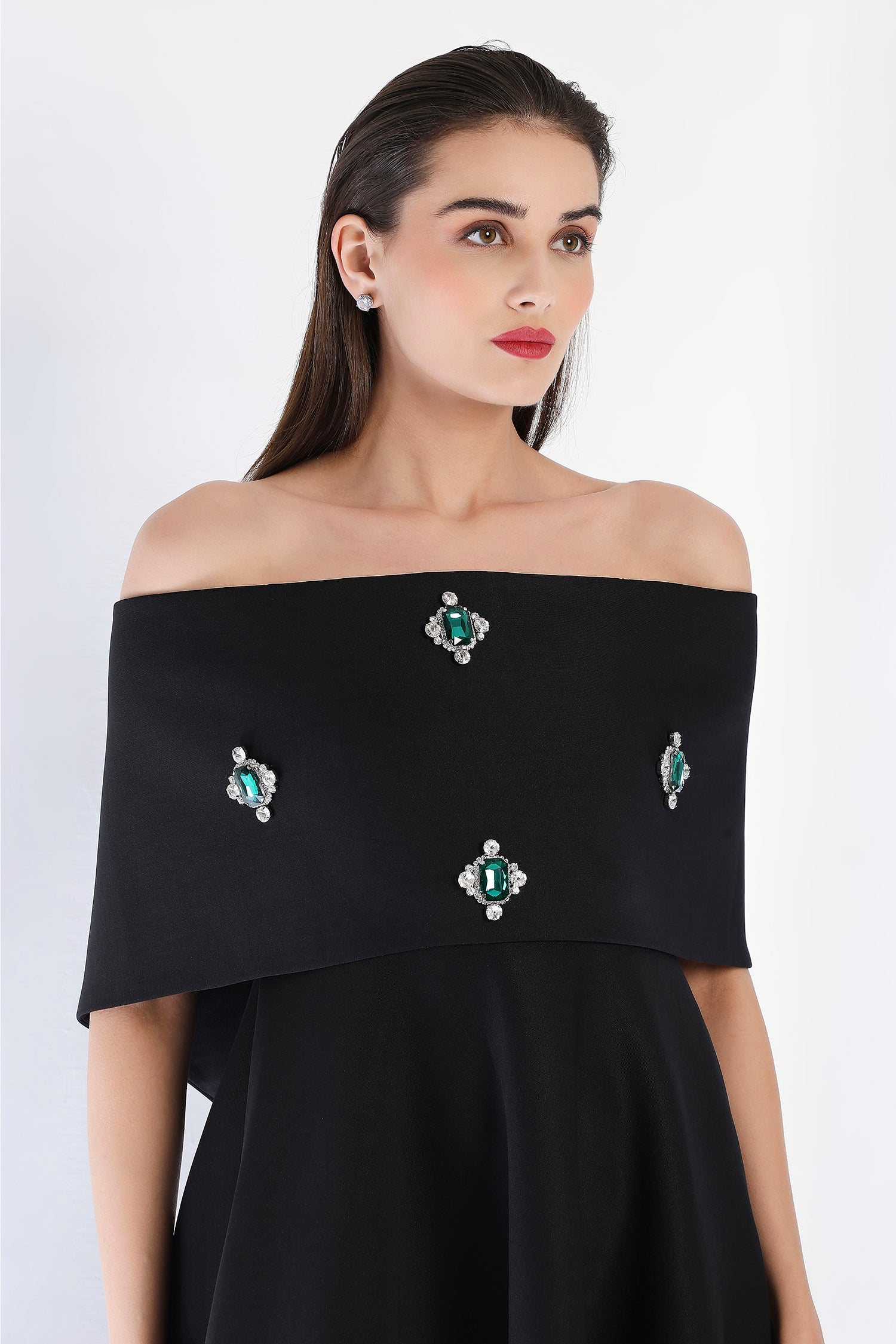 Paired with a luxurious emerald studded wrap, this ensemble is made for special moments. The wrap is versatile and can be styled two ways — draped off-the-shoulder for a graceful, romantic effect, or over one shoulder for a more sculptural, statement look.