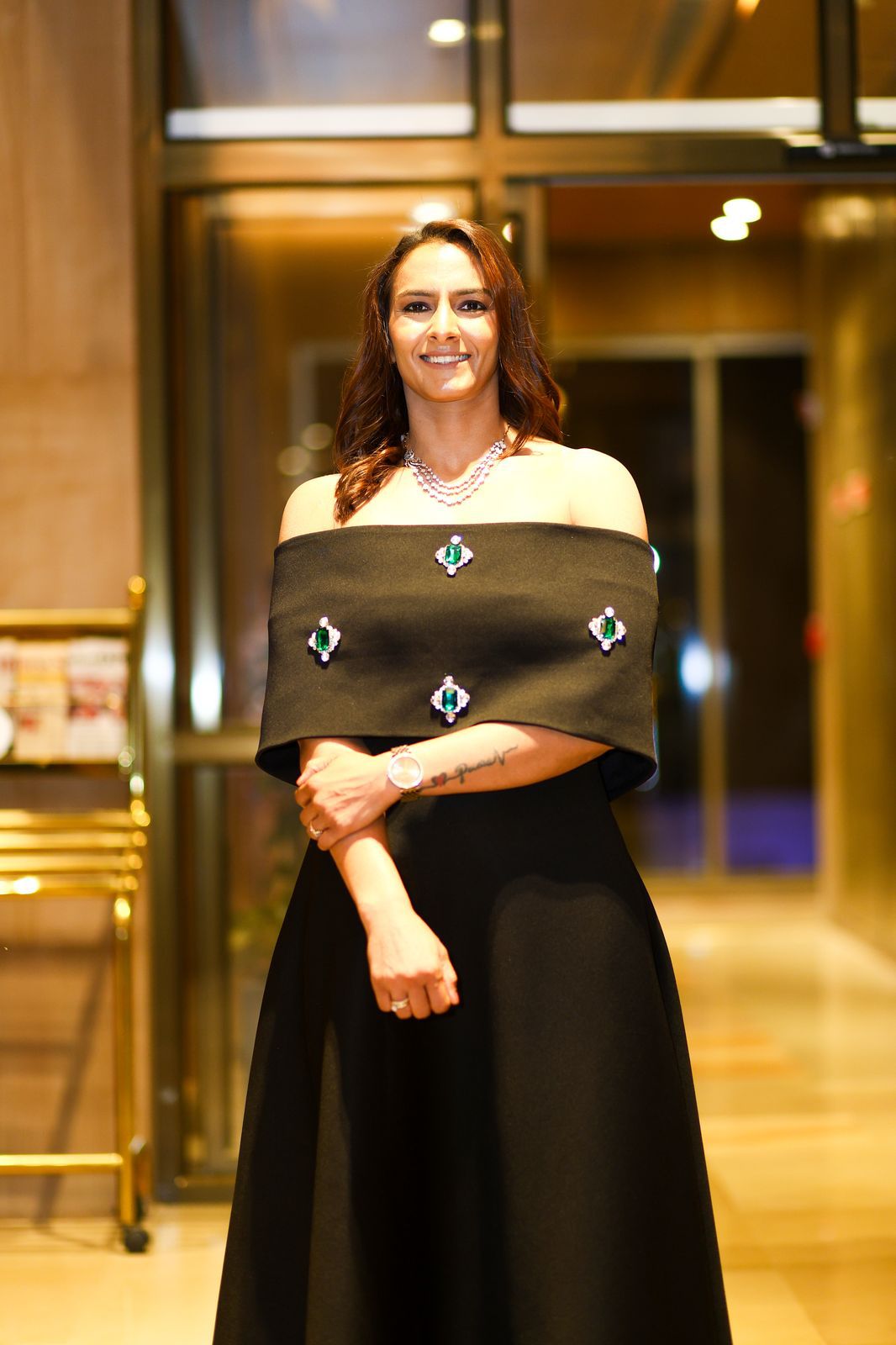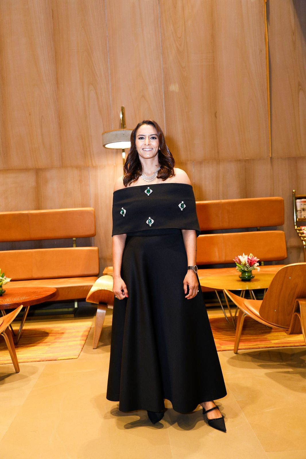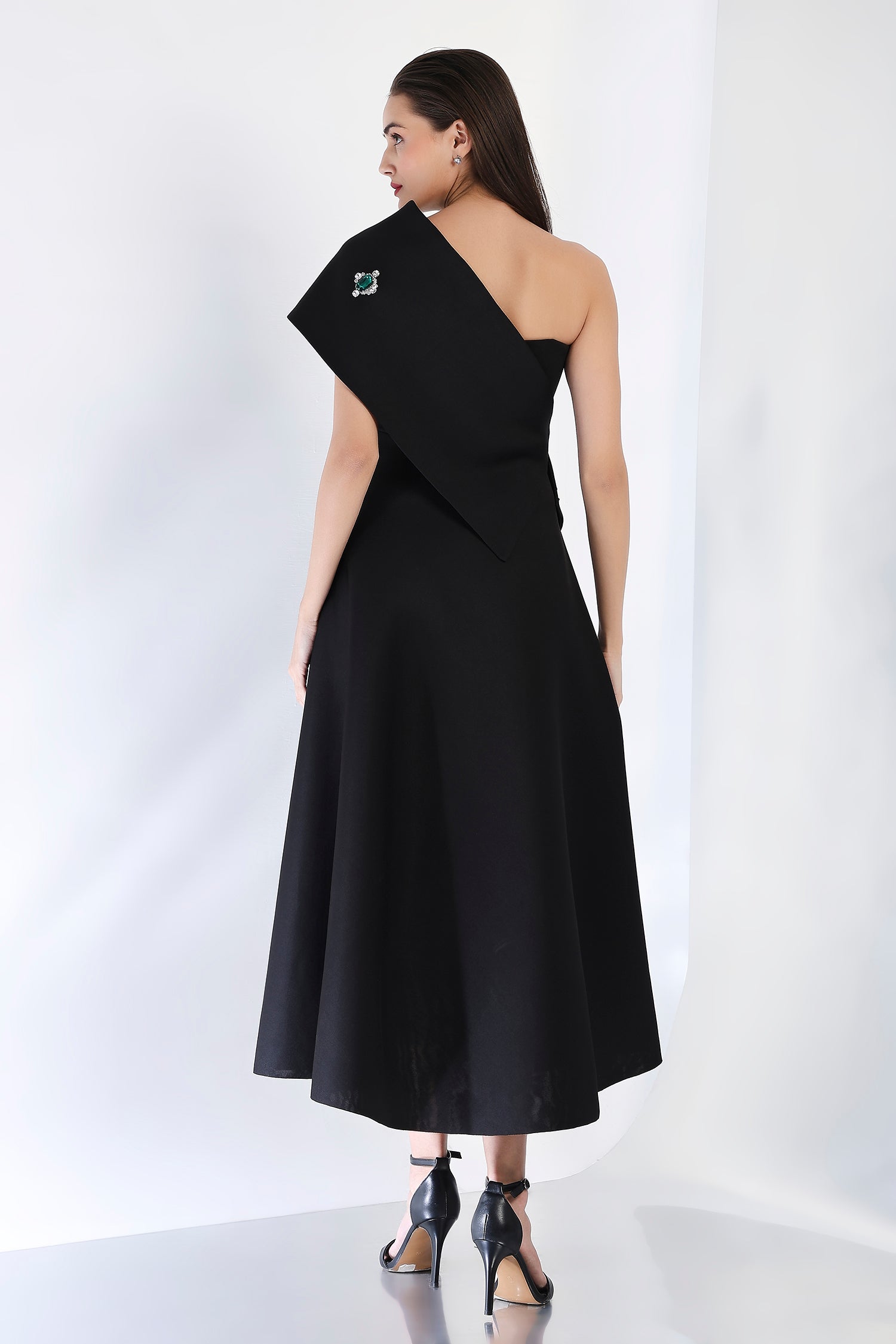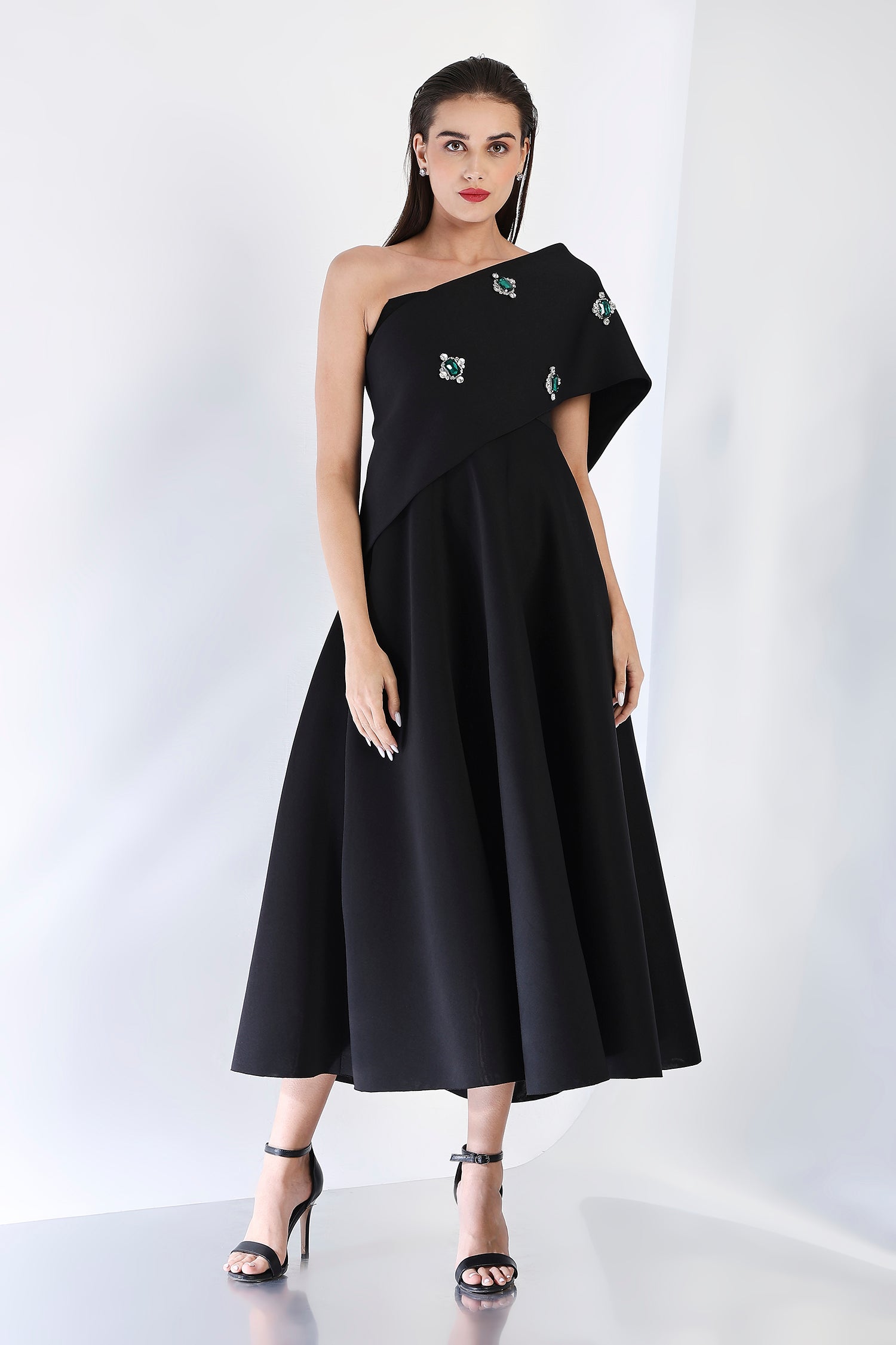 Paired with a luxurious emerald studded wrap, this ensemble is made for special moments. The wrap is versatile and can be styled two ways — draped off-the-shoulder for a graceful, romantic effect, or over one shoulder for a more sculptural, statement look.