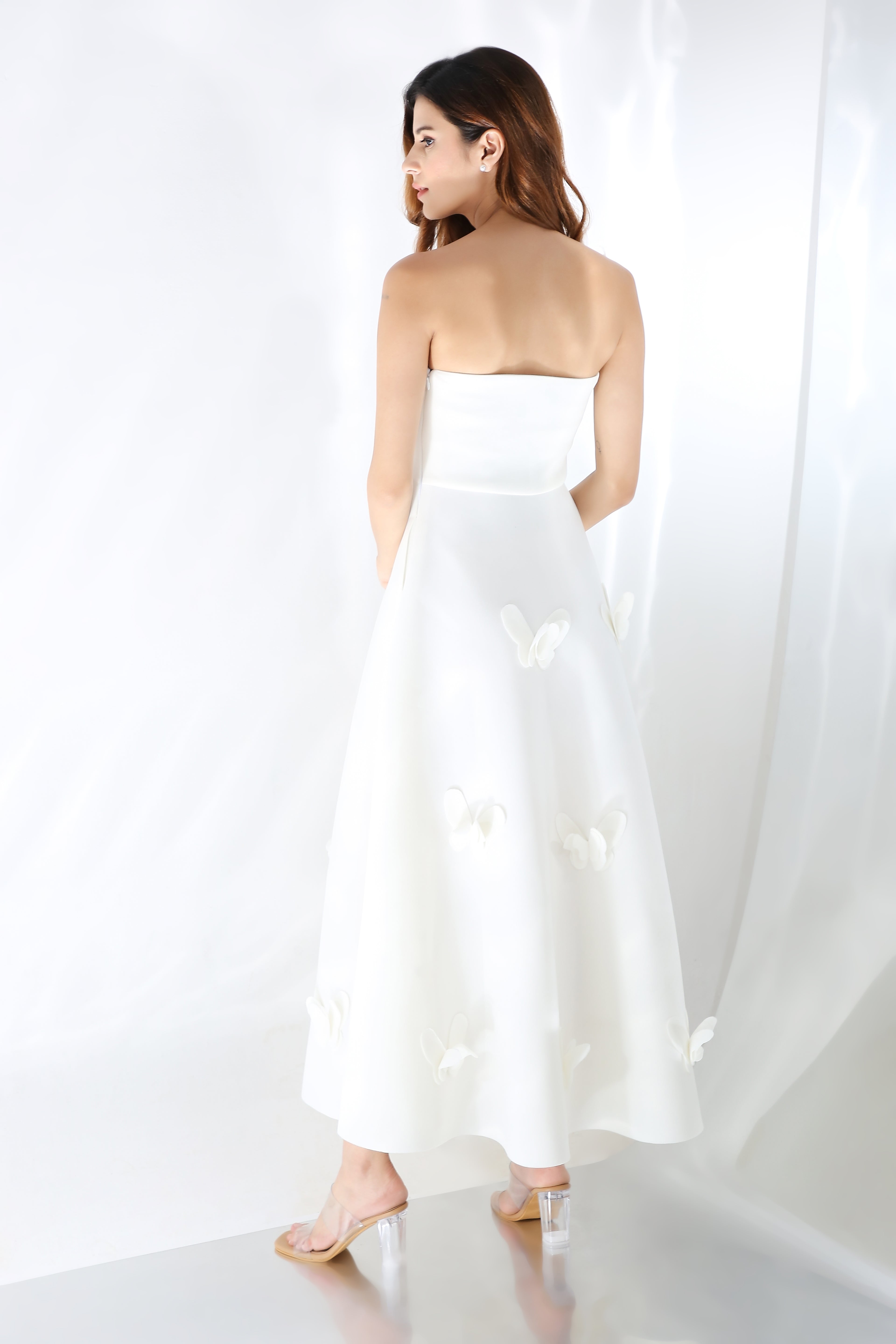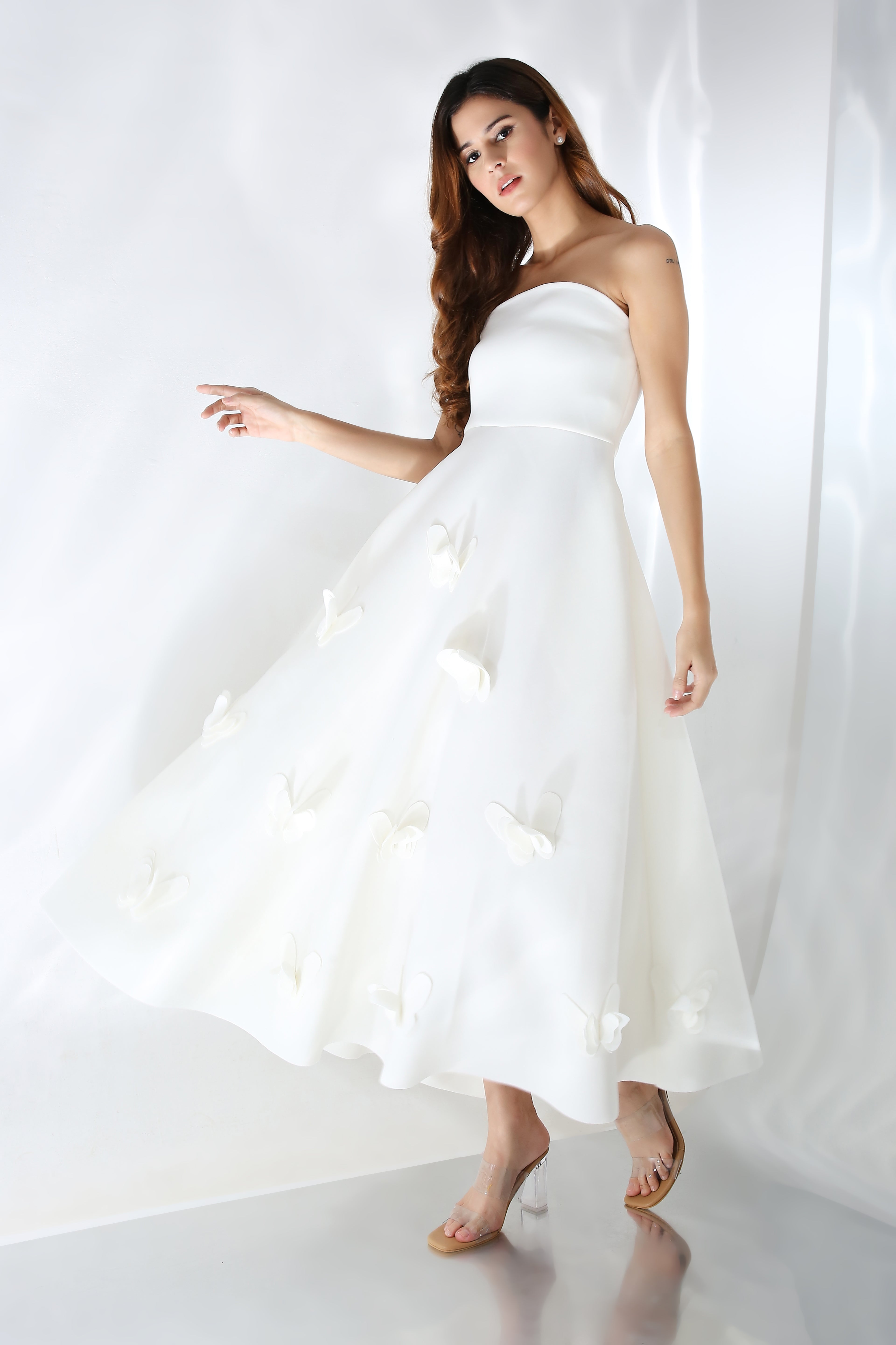 Amyra is a sculptural strapless dress crafted in smooth neoprene, designed to hold its shape while flattering yours. It features a structured flare that falls away from the body with elegance — and yes, it comes with pockets.