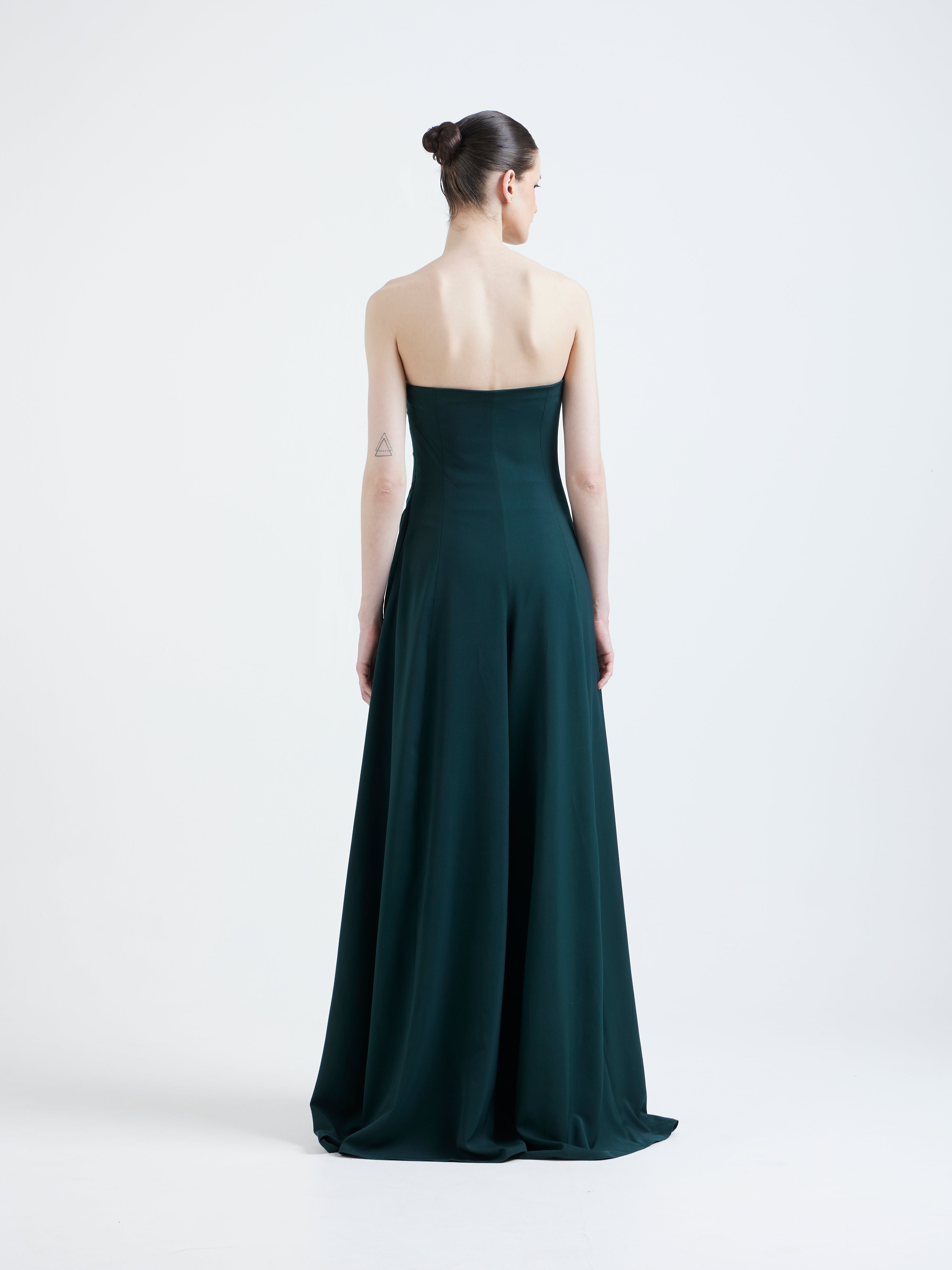 A fluid, strapless jumpsuit paired with a detachable studded wrap that instantly elevates the silhouette. The strapless base flows into wide, gown-like panels, creating effortless movement and a refined, elongated shape.