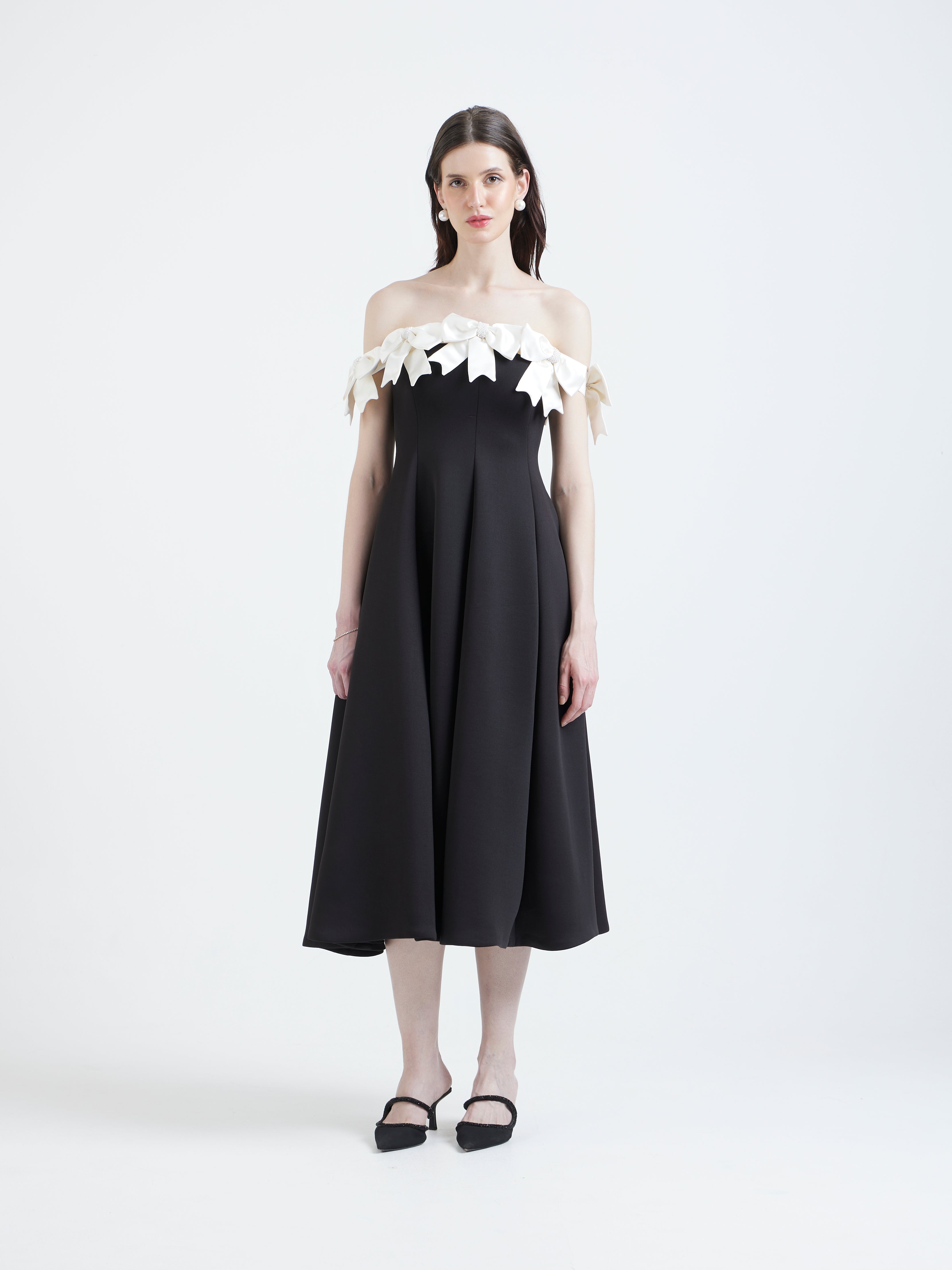 Featuring a flattering midi dress which has vertical panels giving a cinch at the upper waist and flowing in a structured manner thereon.