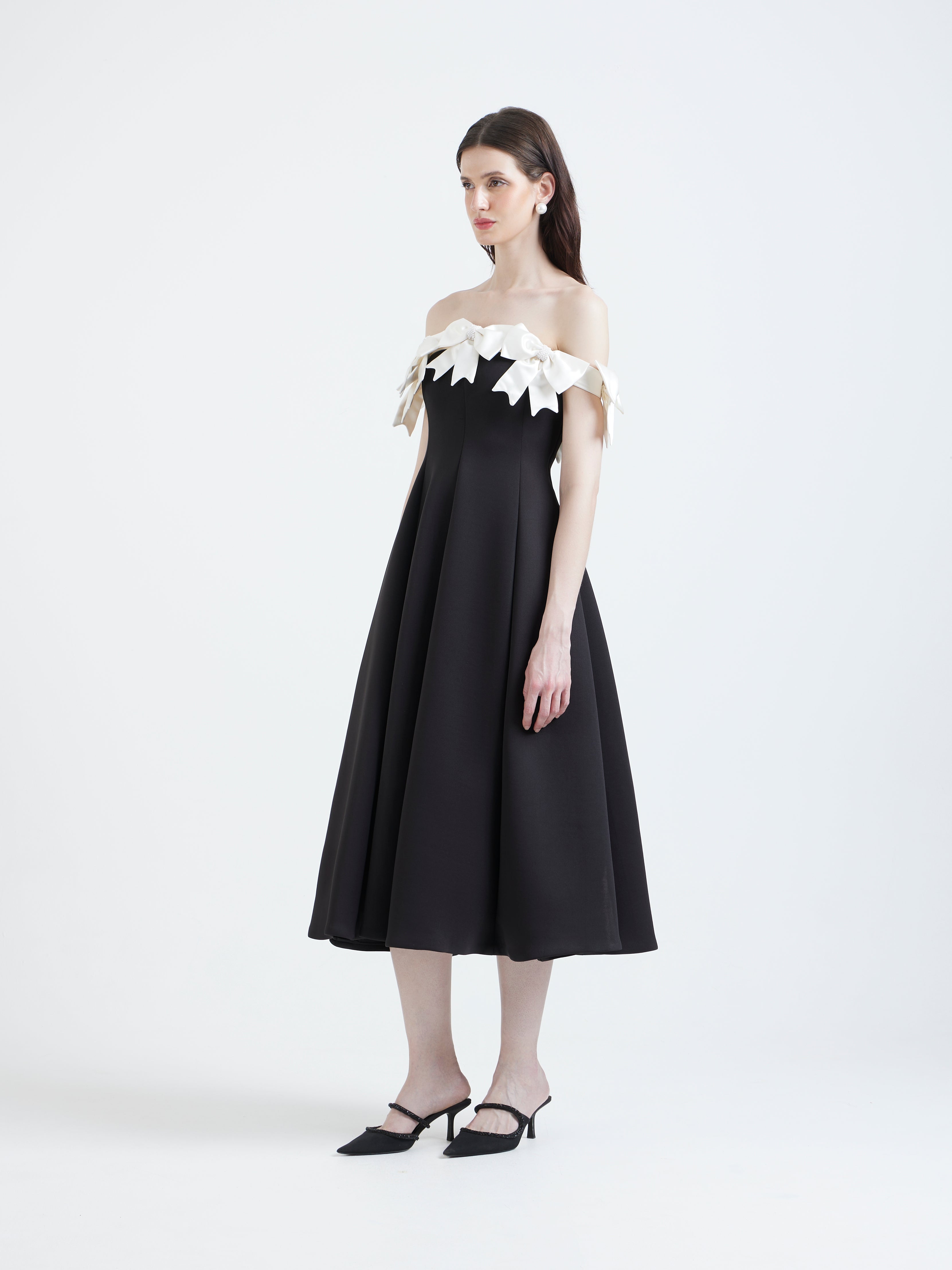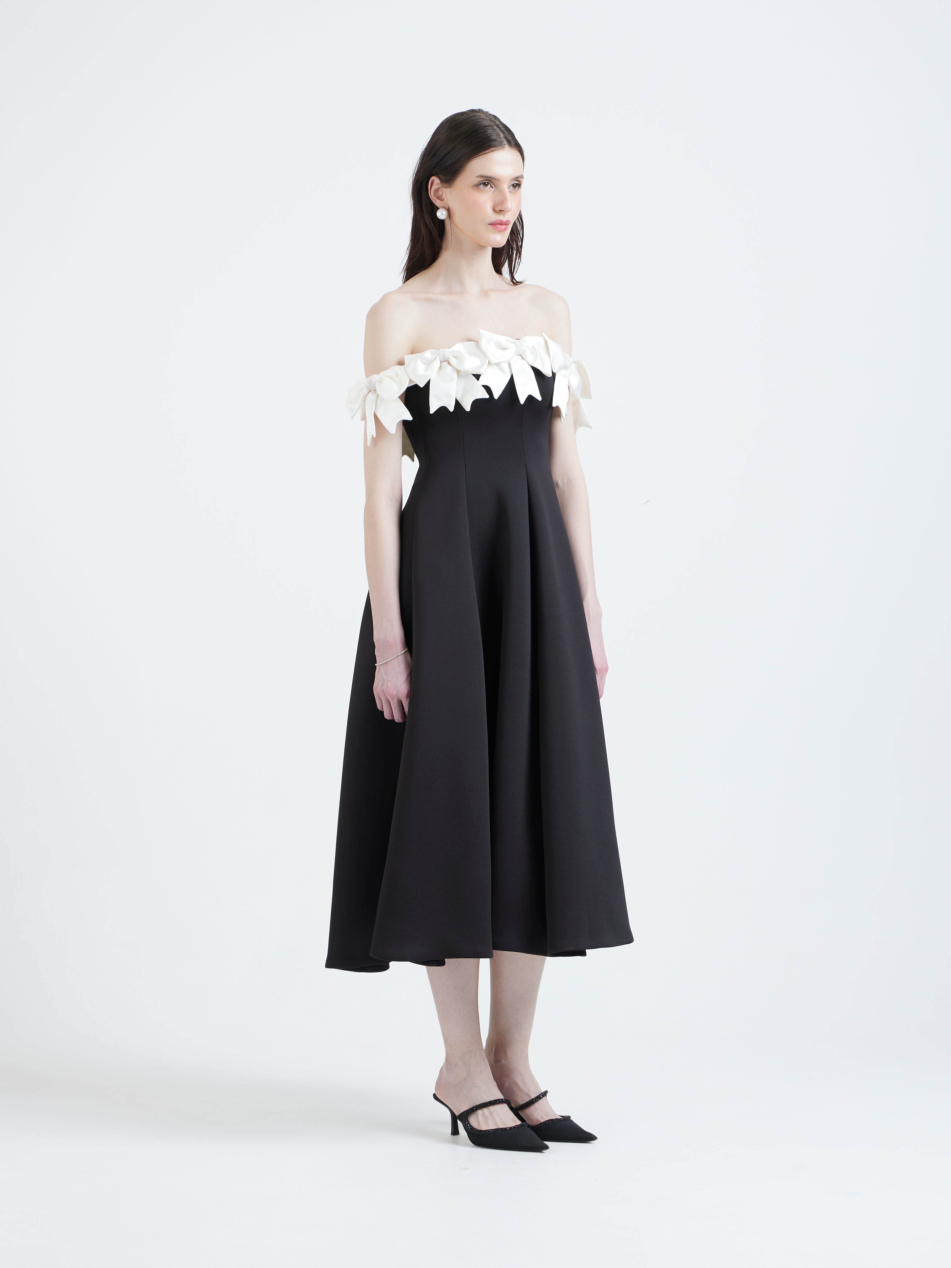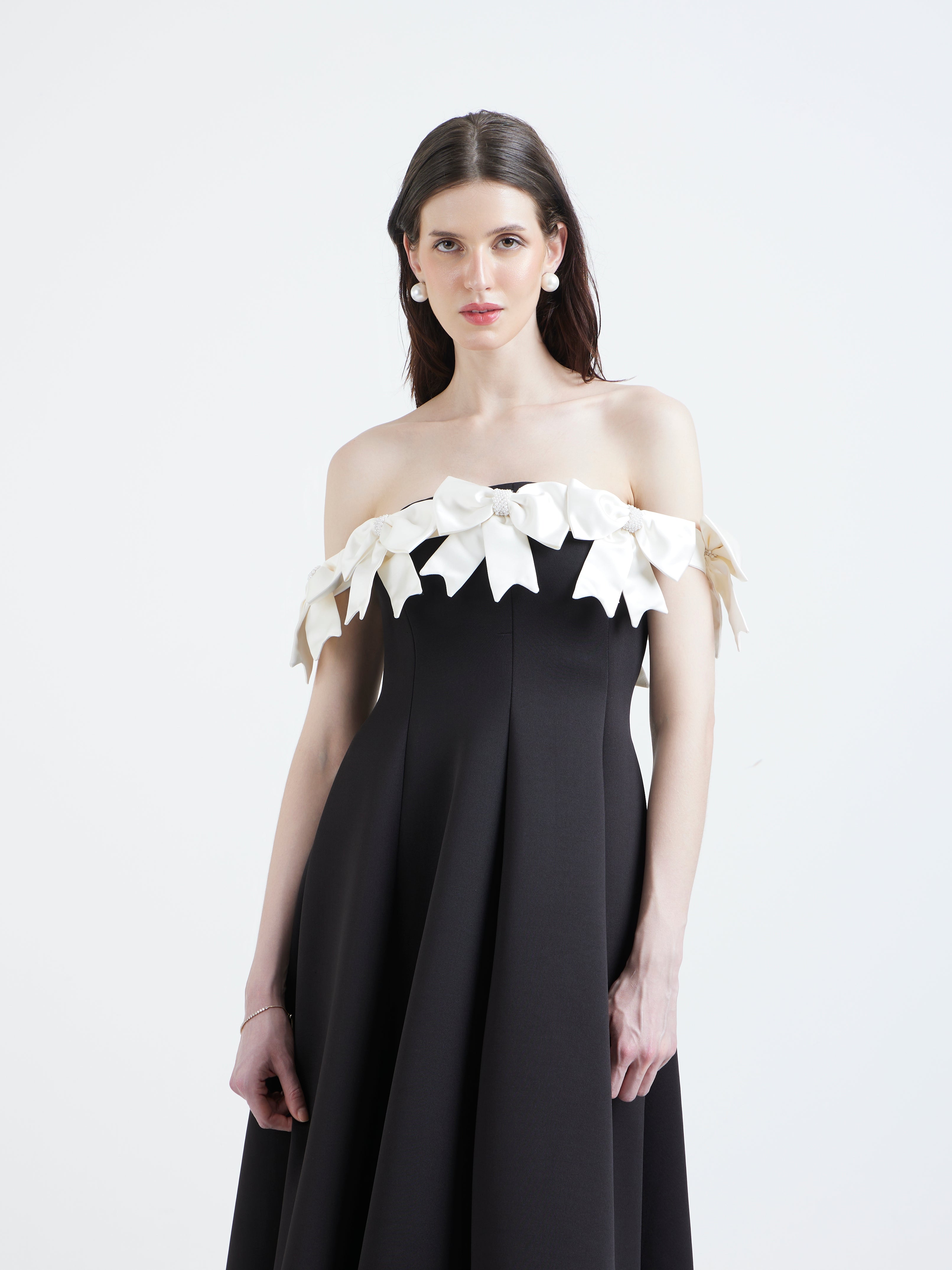 The detachable bow wrap is encrusted with pearls and small, elegant satin bows.