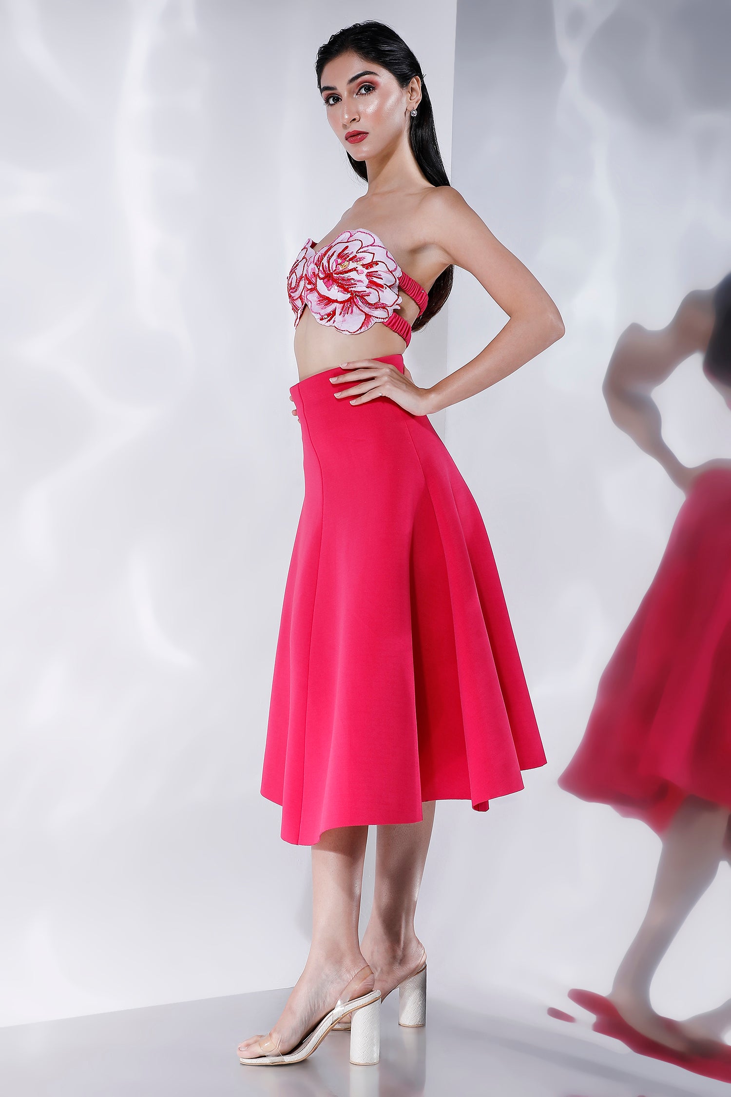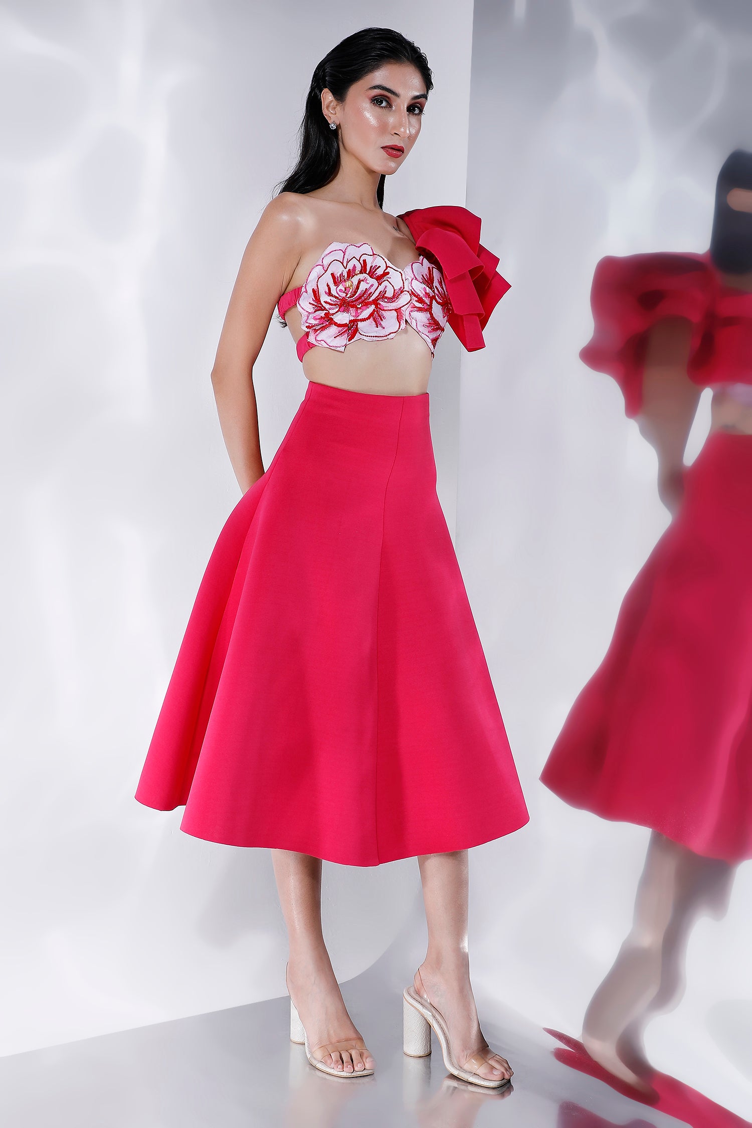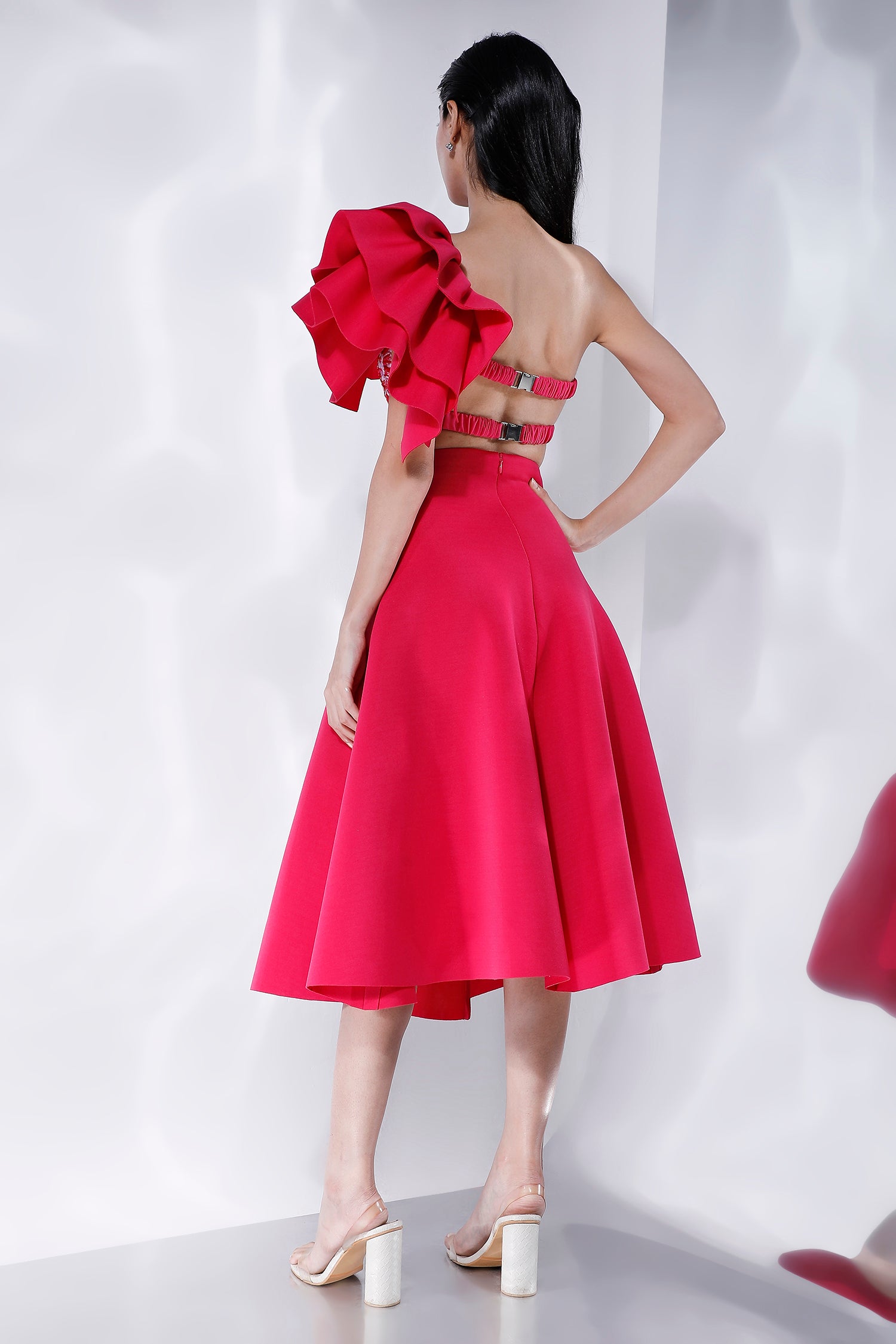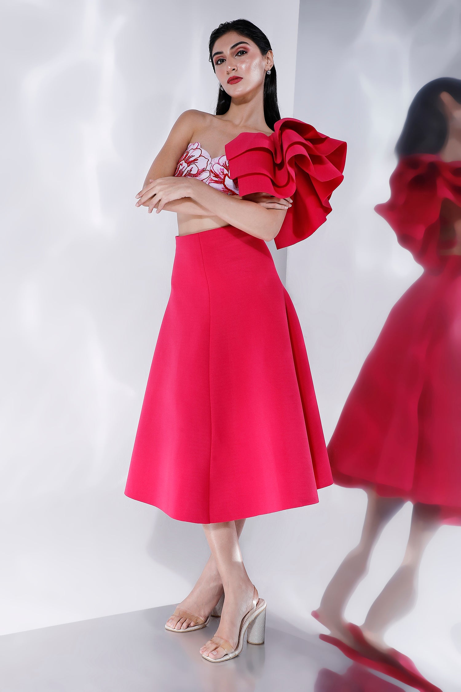 Featuring a set of a crop, structured skirt and detachable ruffles.