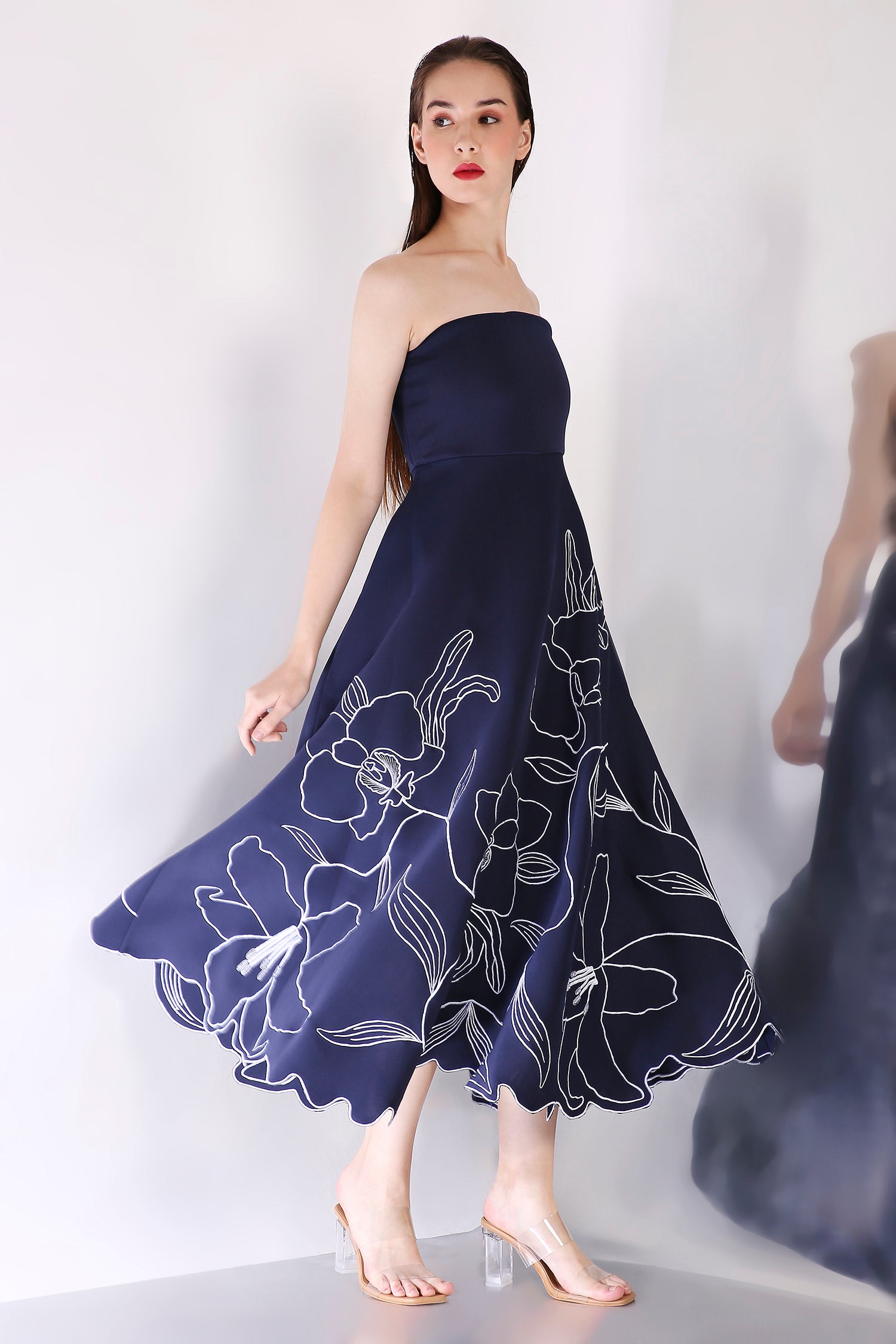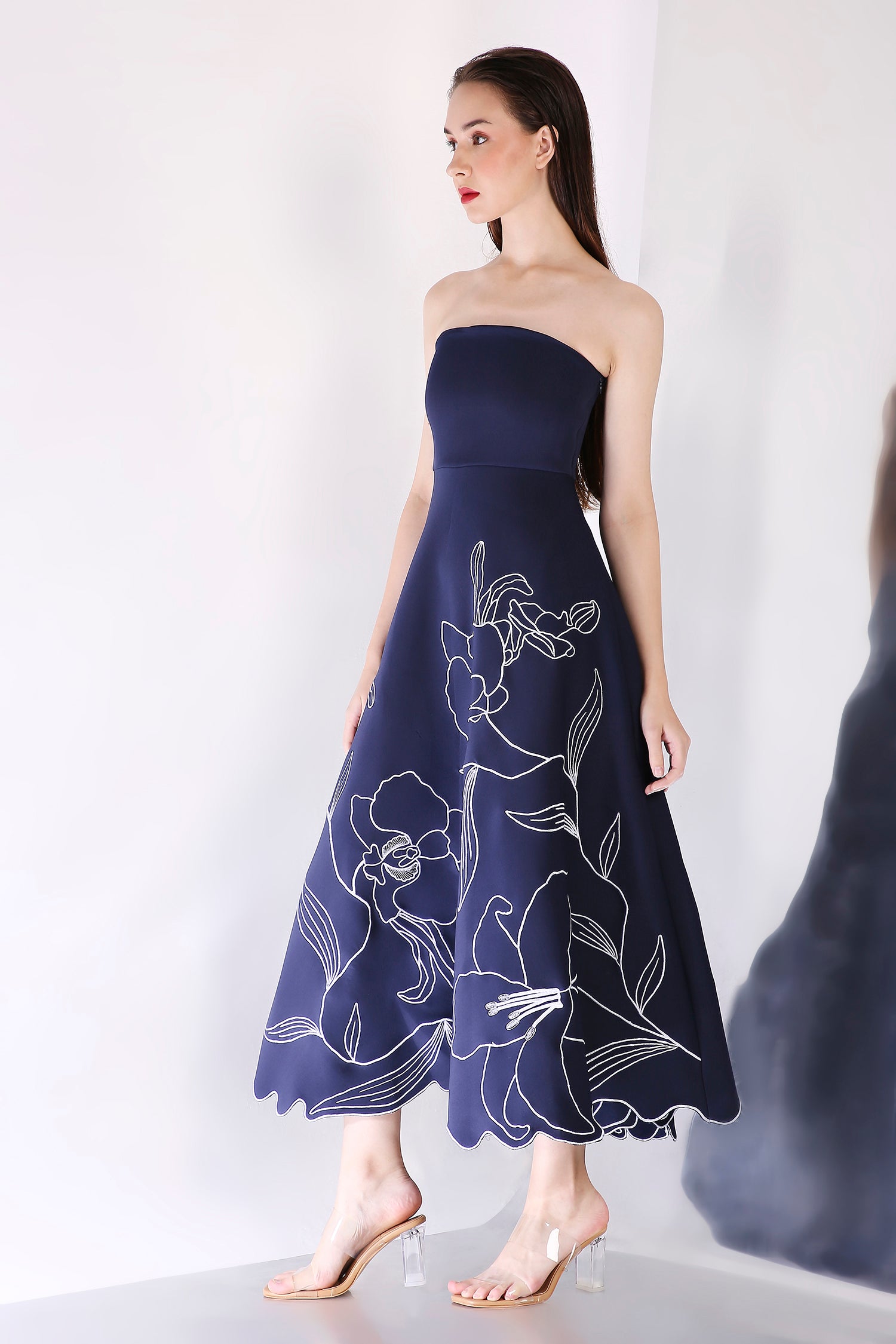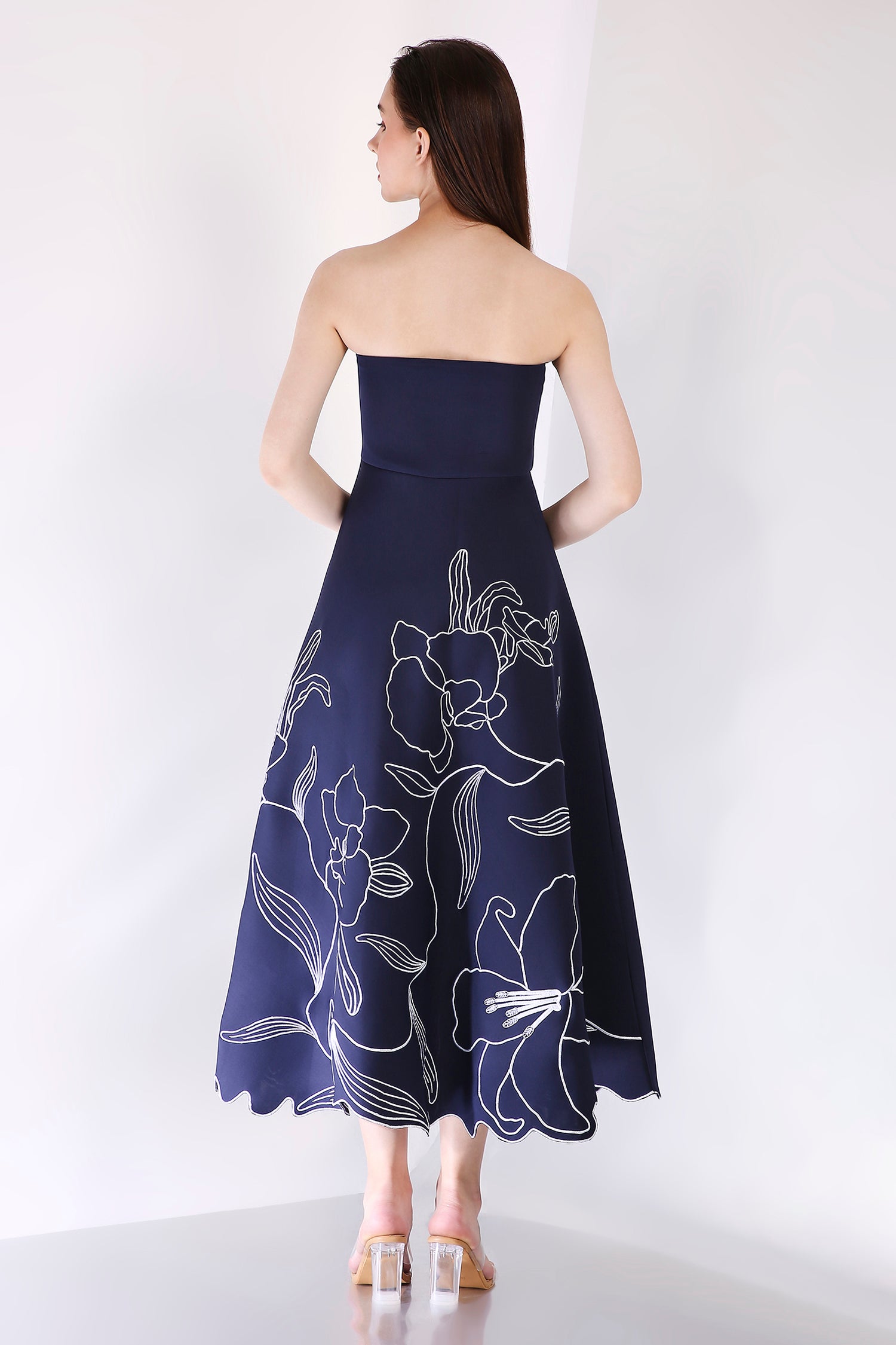 A stunning strapless fit-and-flare mid-calf length dress, crafted from premium neoprene fabric, featuring intricate floral embroidery motifs that elegantly adorn the entire silhouette. The delicate floral details elevate the dress, offering a sophisticated balance of modern design and timeless elegance—perfect for any formal occasion.