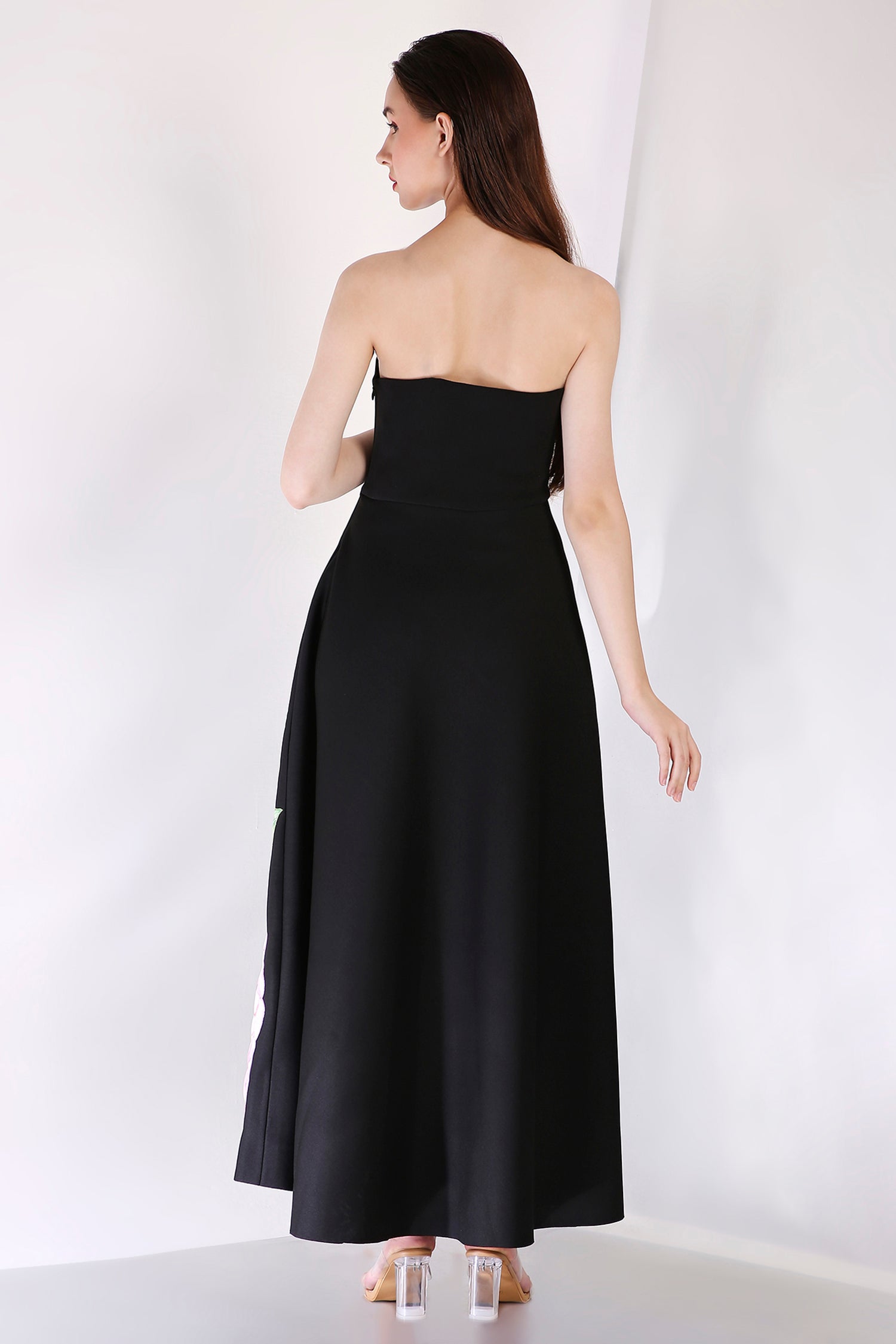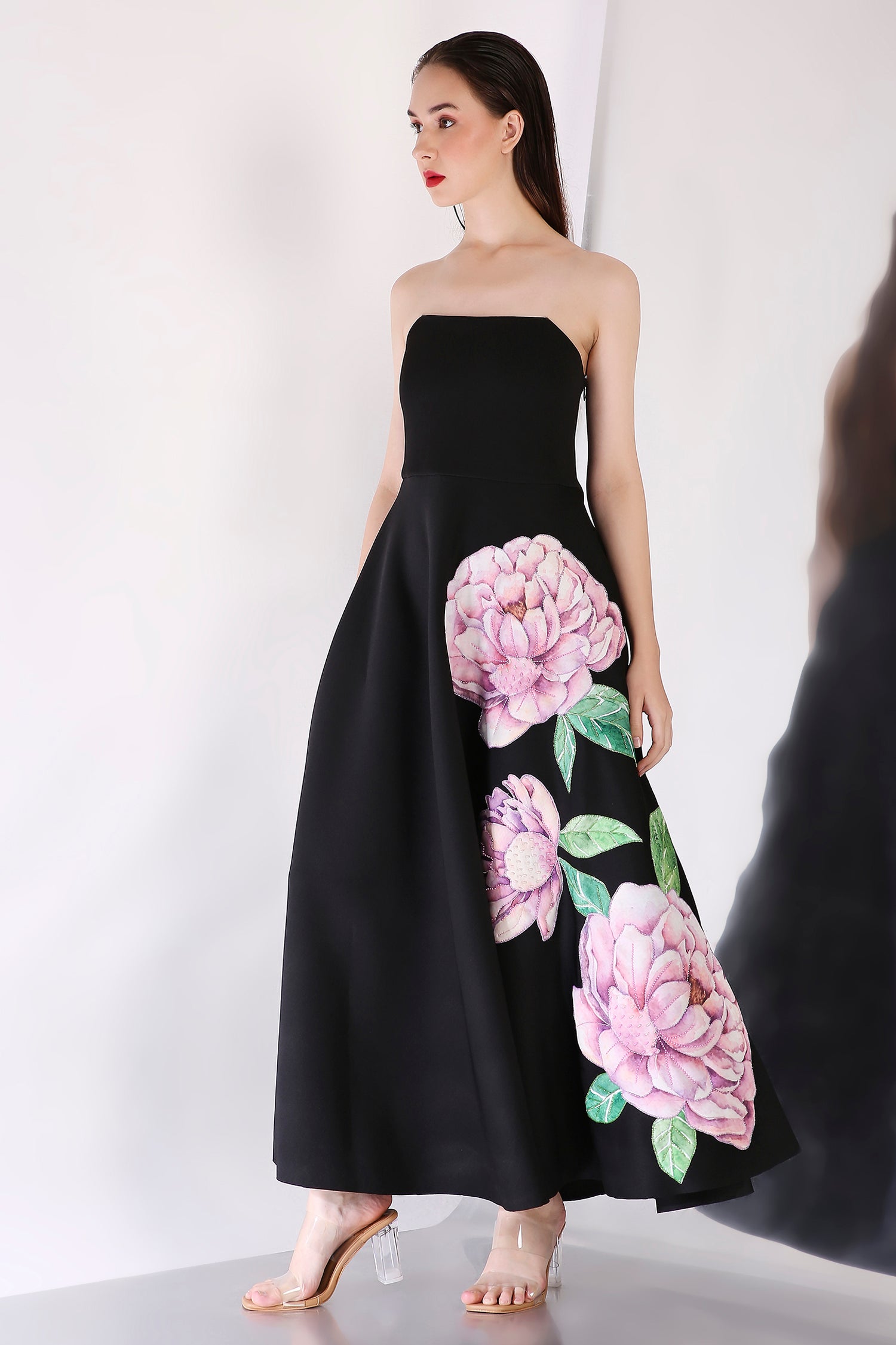 Discover the Nyra dress—a mid-calf silhouette adorned with a stunning lavender floral placement print. This elegant design effortlessly combines sophistication and charm, making it an ideal choice for any special occasion.