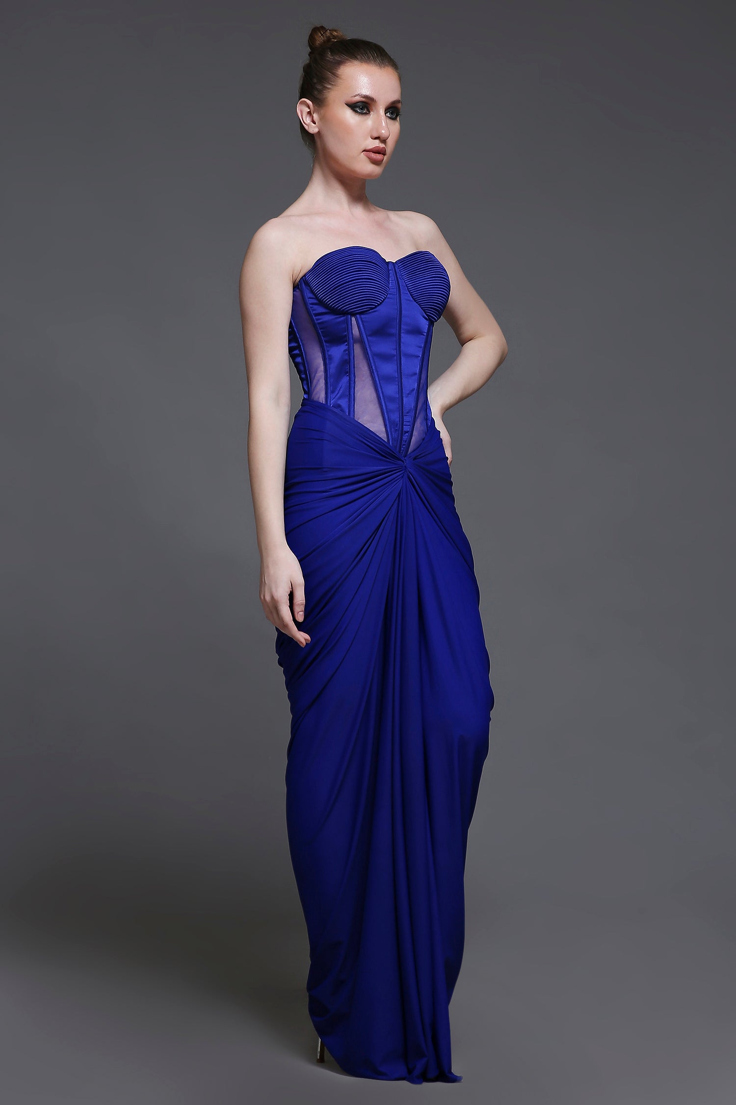 Our Georgia Set combines elegance and structure, featuring a corset with detailed cups, mesh panels, and a tie-up back for a customizable fit. The matching draped skirt is enhanced with subtle ruching for a flattering silhouette. Adding a bold touch, the set includes a one-shoulder detachable feather strap, elevating the look with a chic and playful detail. Perfect for making a statement at any special occasion.