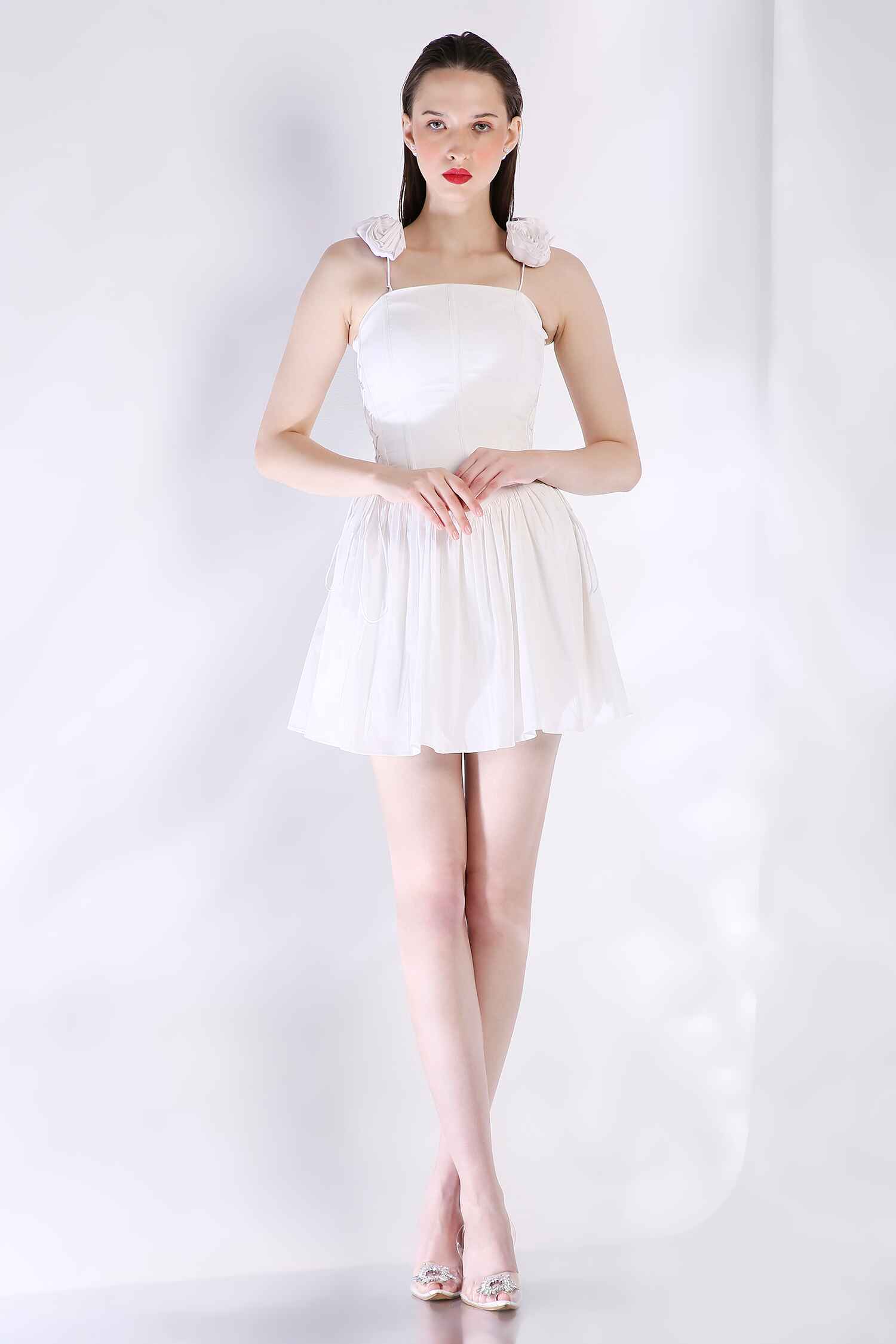 Channel modern chic with our white corset-inspired strapless short dress, featuring a flattering fitted bodice. The flowy, short ruffled skirt adds playful movement, while detachable straps adorned with 3D flowers offer versatility and a touch of elegance. Perfect for a special occasion where you want to stand out.