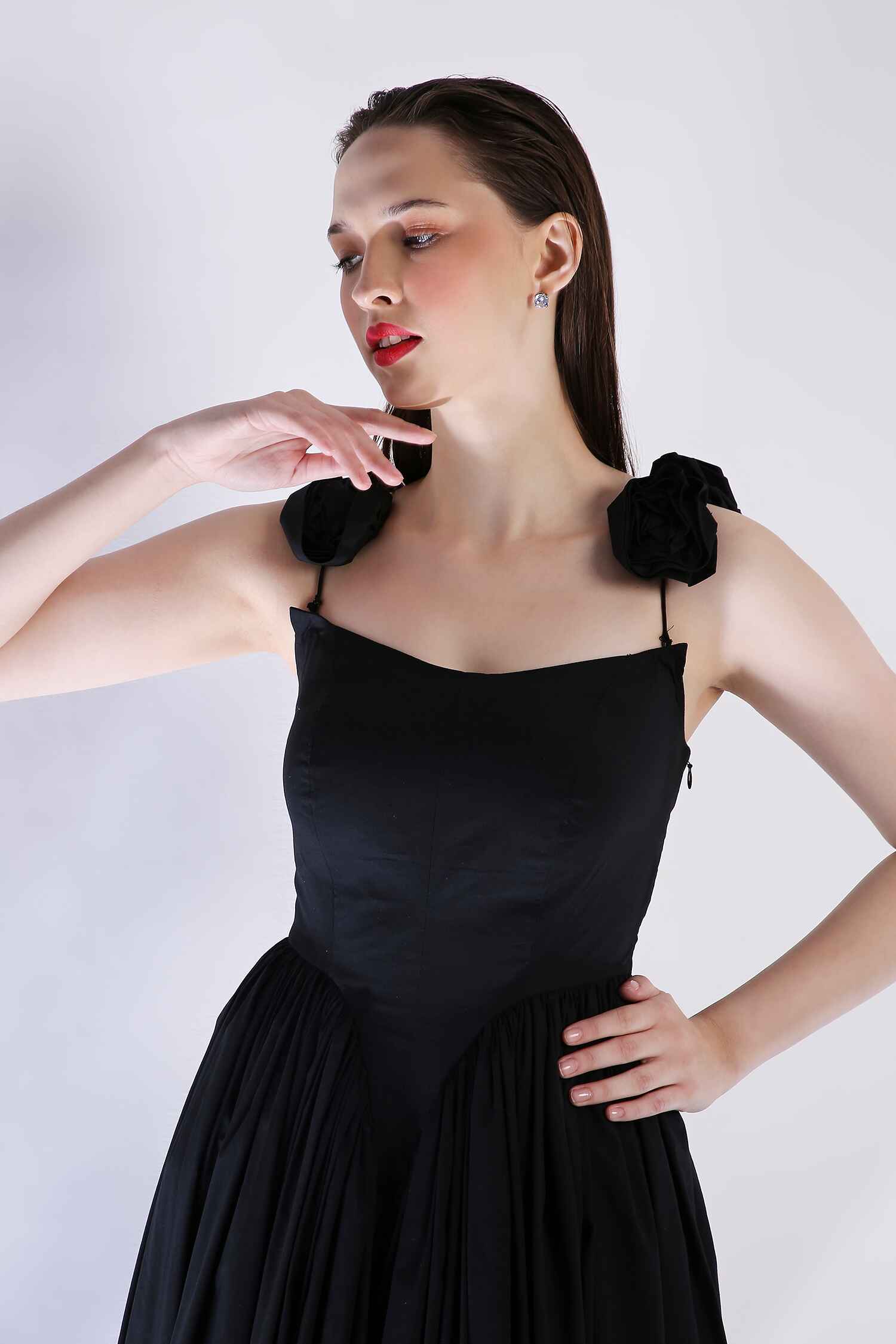 Embrace effortless elegance with our black mid-calf length dress, featuring delicate detachable straps and a gathered waistline for a flattering fit. This timeless silhouette flows gracefully, making it a versatile piece perfect for any occasion.
