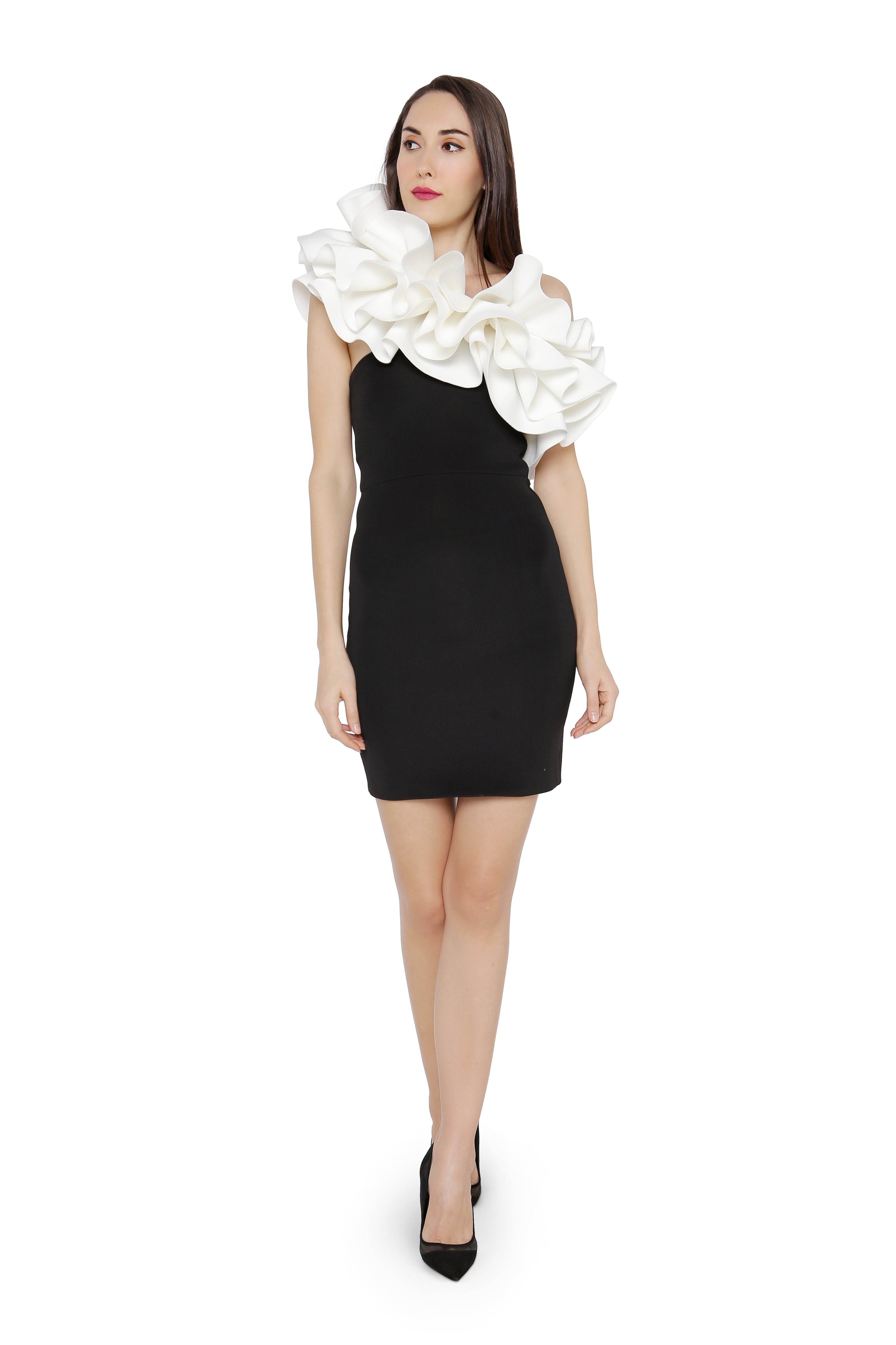 Featuring a ruffled overlay constructed from neoprene that can be worn as a one shoulder or a strapless one. Both the back and front have ruffles as depicted.