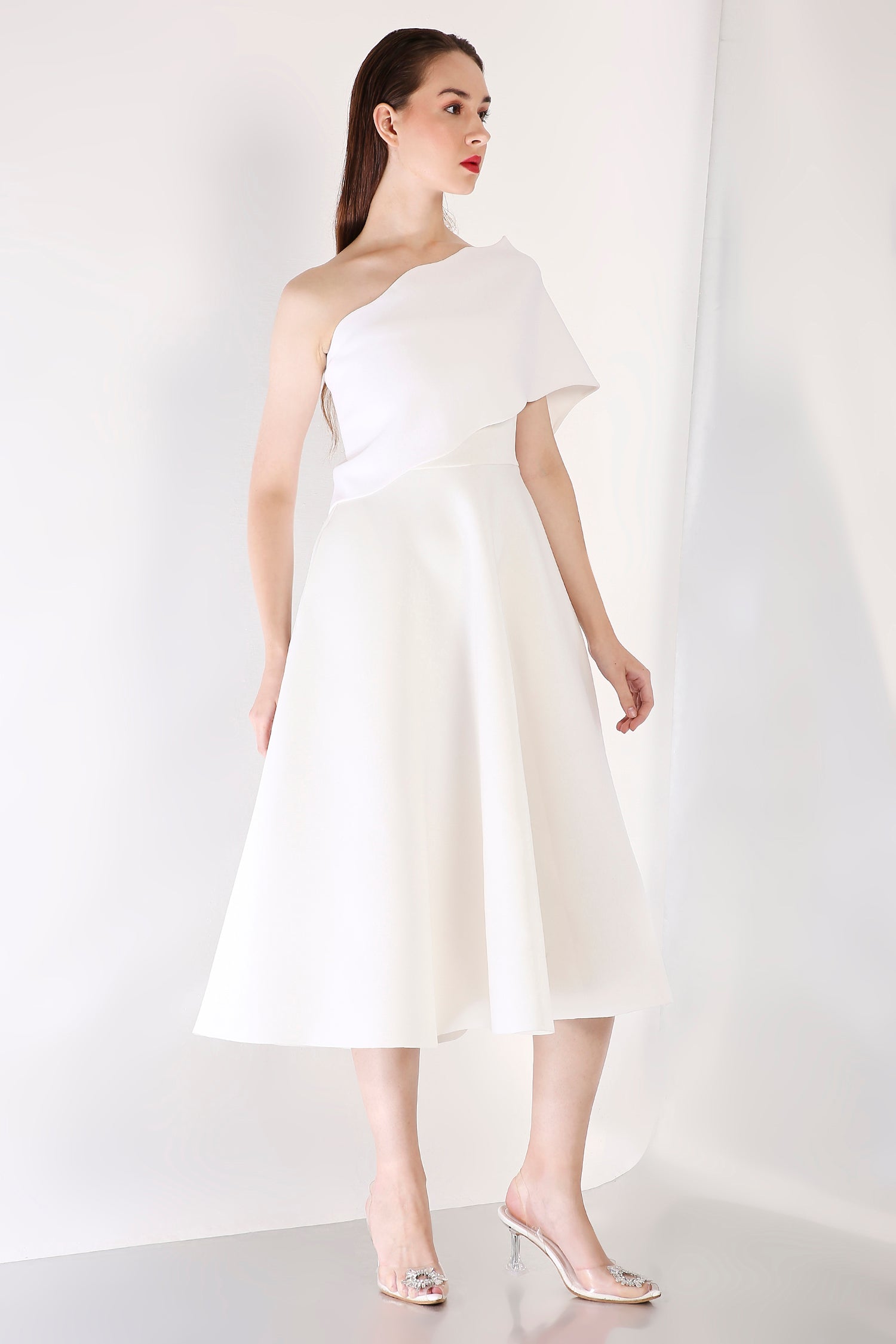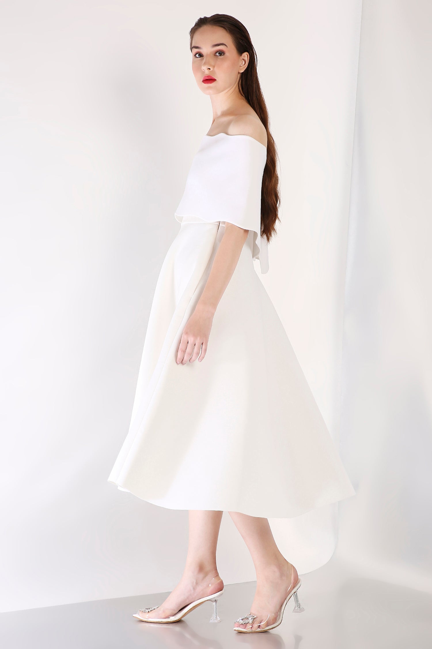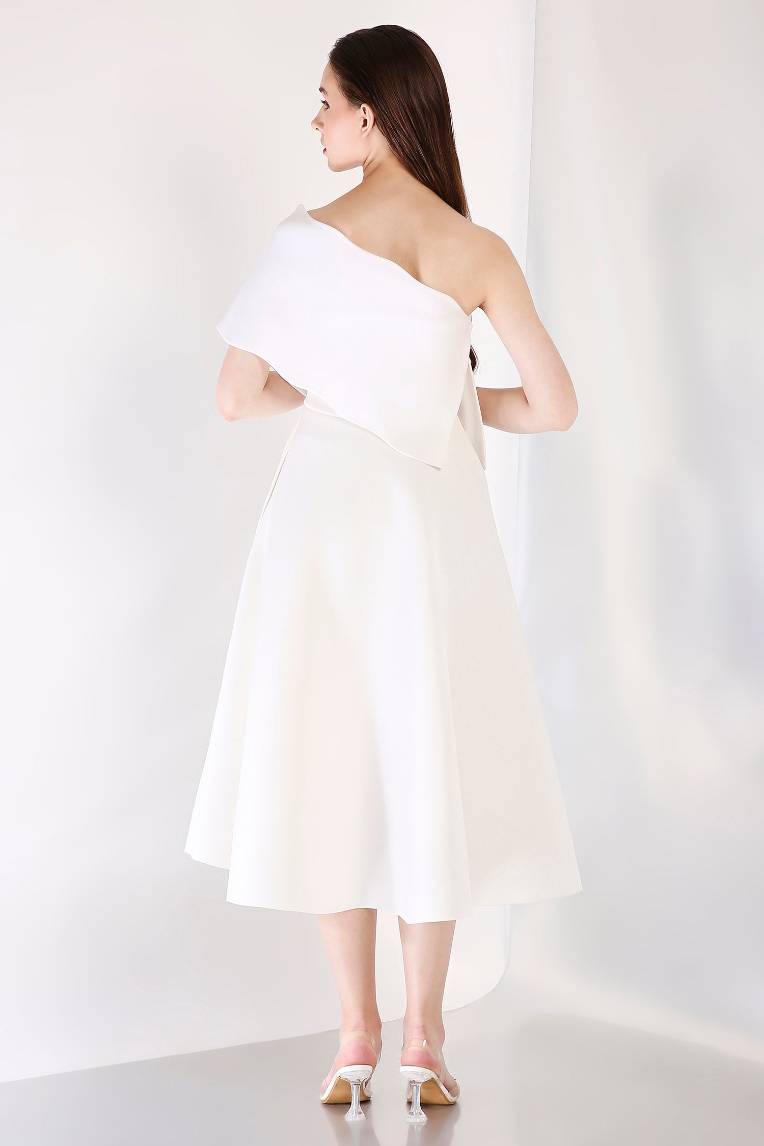 This sophisticated strapless midi dress is complemented by a stunning wave wrap that adds fluidity and movement to your look. The wrap can be styled in two ways—one-shoulder or off-shoulder—offering versatile elegance that suits any formal event.
