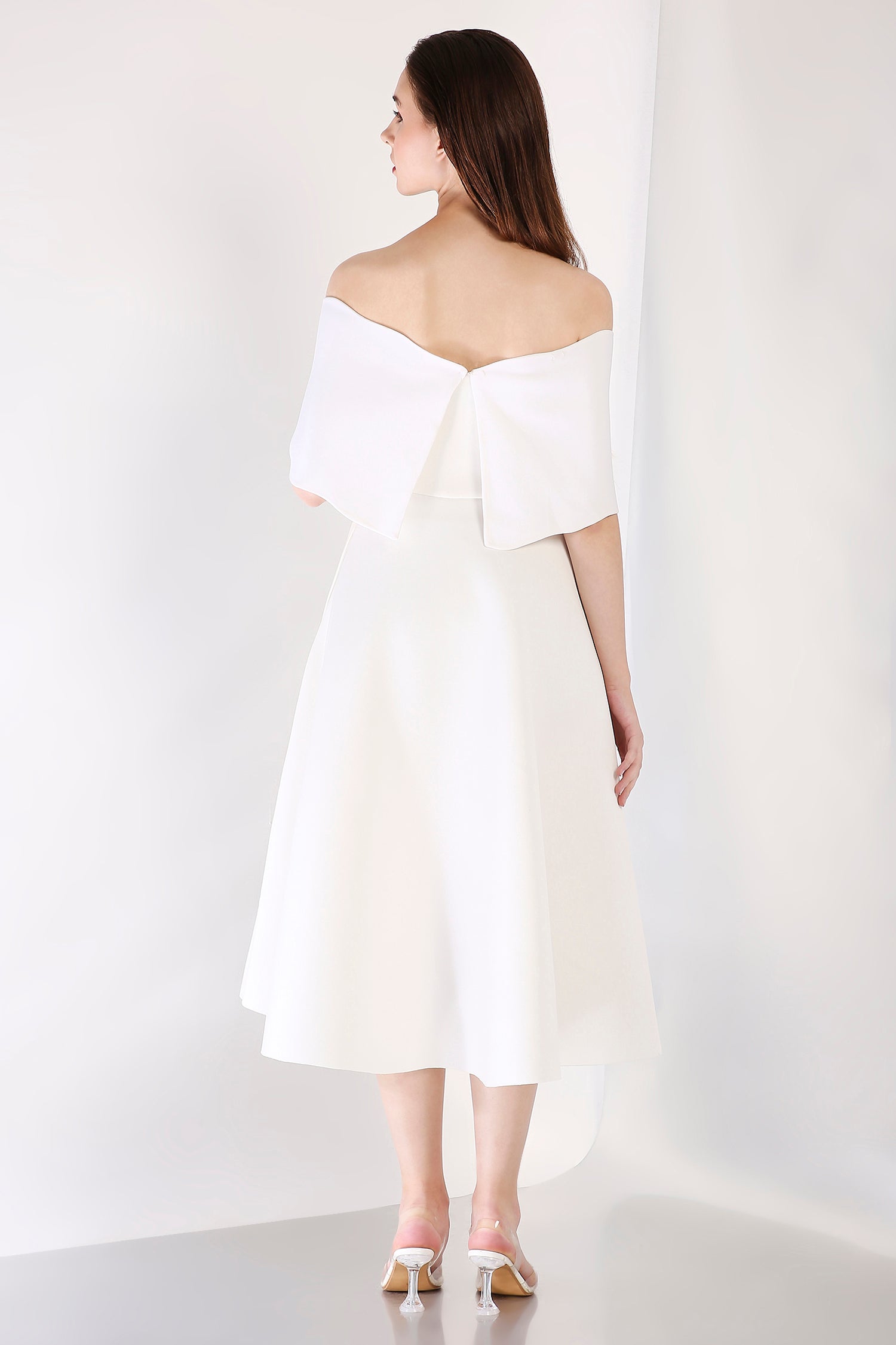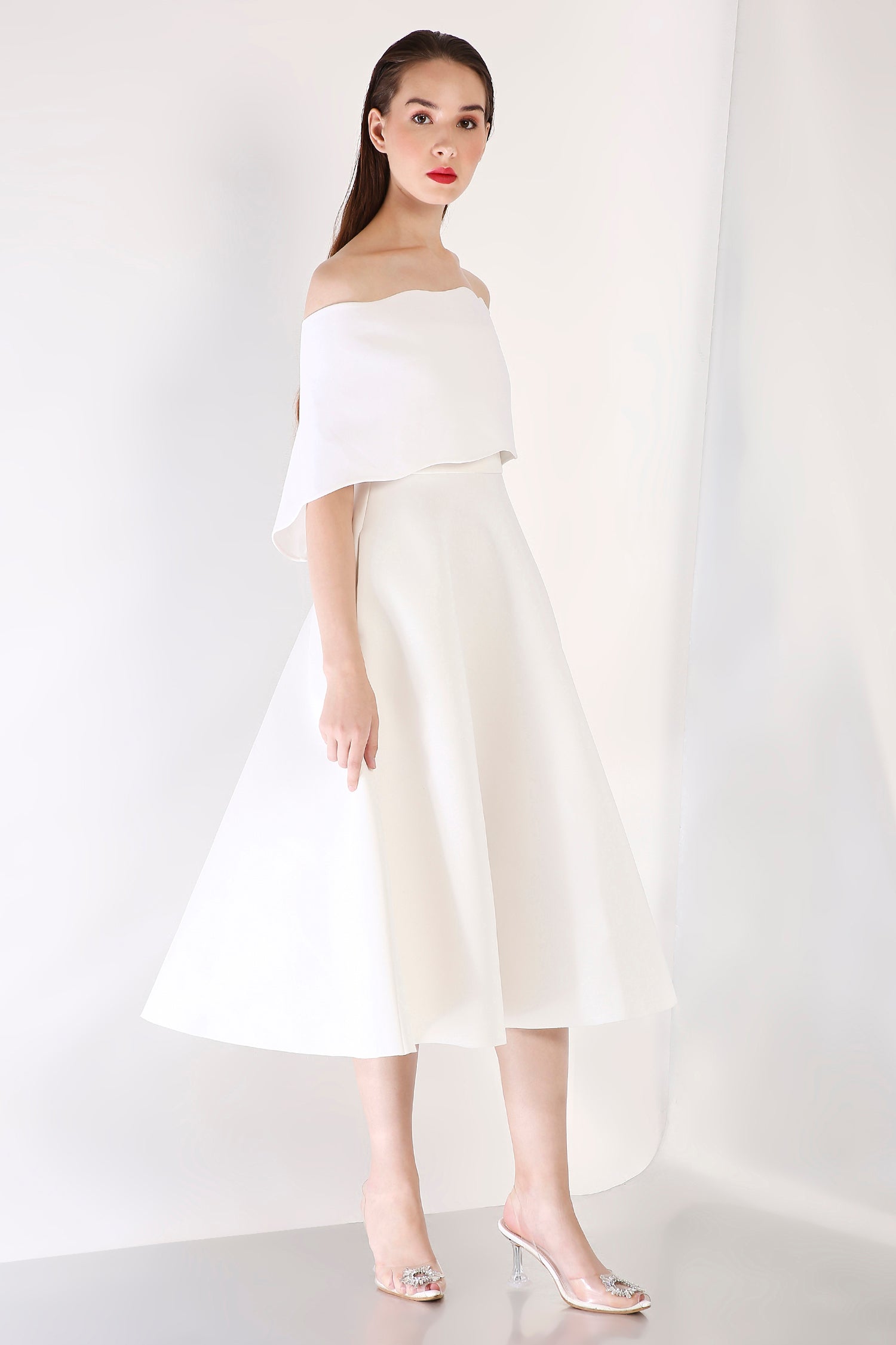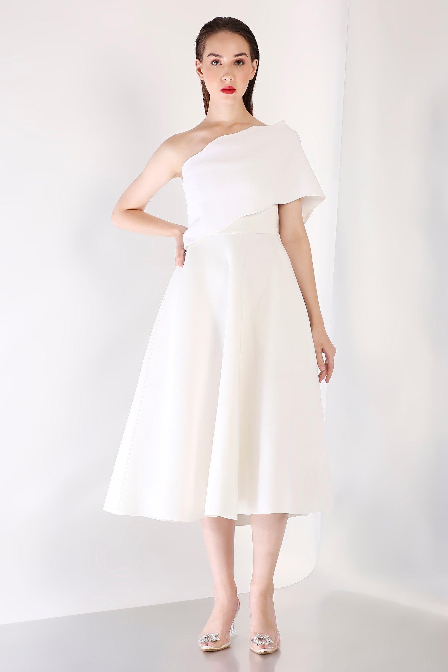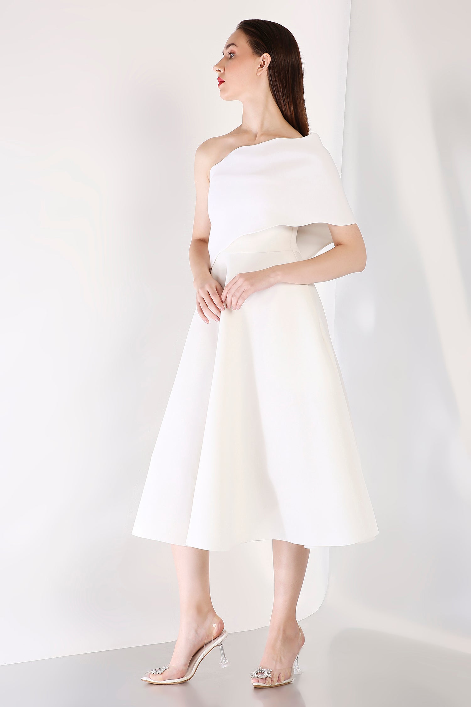 This sophisticated strapless midi dress is complemented by a stunning wave wrap that adds fluidity and movement to your look. The wrap can be styled in two ways—one-shoulder or off-shoulder—offering versatile elegance that suits any formal event.