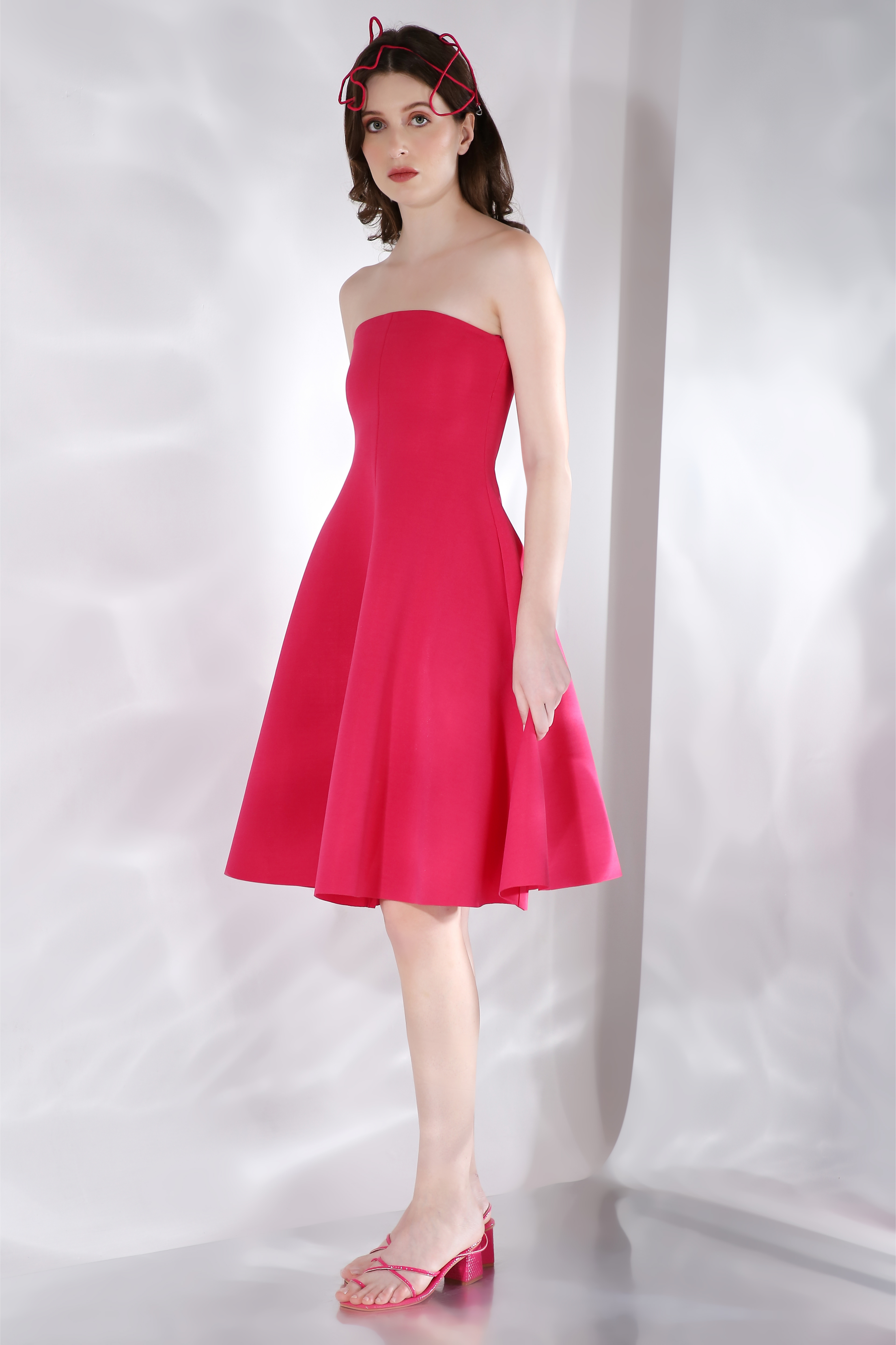 Featuring a flared knee length, strapless dress paired with a ruffled detachable accent which can be styled in different ways.