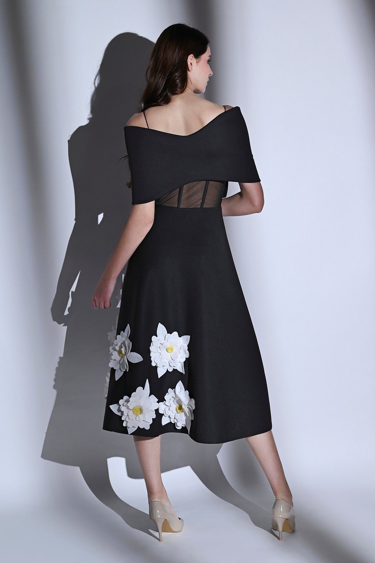 Featuring Aalika in Alyssa, a corseted fit and flare dress with 3D embroidered flowers. The bodice is sheer, with net detailing. The dress has a side zip closure.
