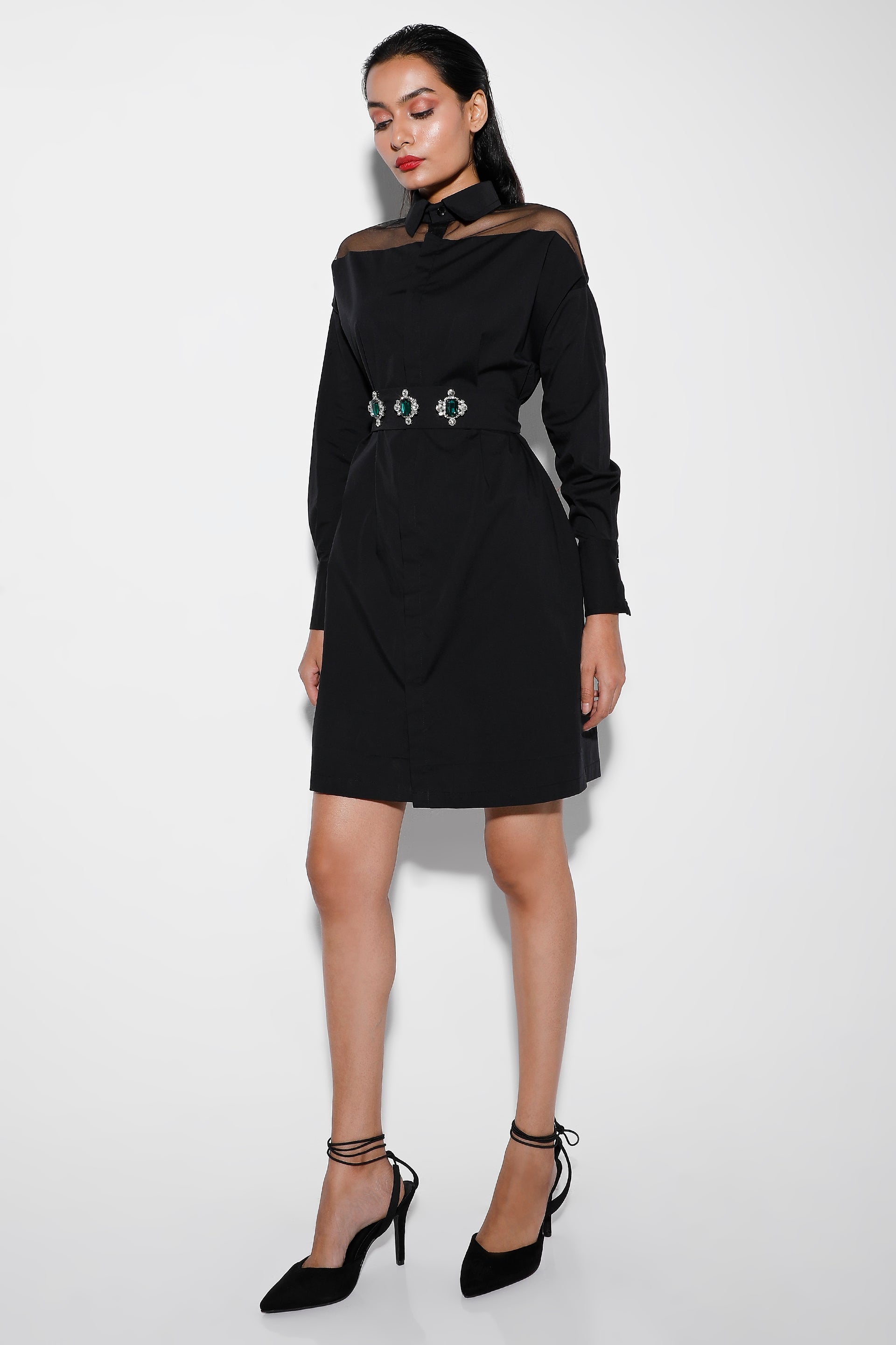 Featuring a sheer and solid shirt dress with mesh detailing on the shoulders and . The tie up belt is encrusted with stones.