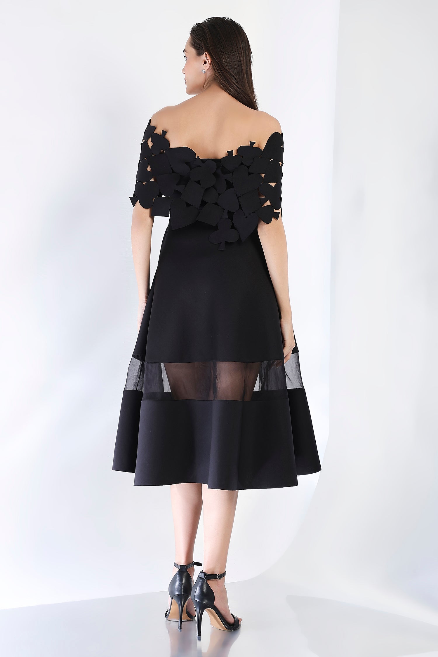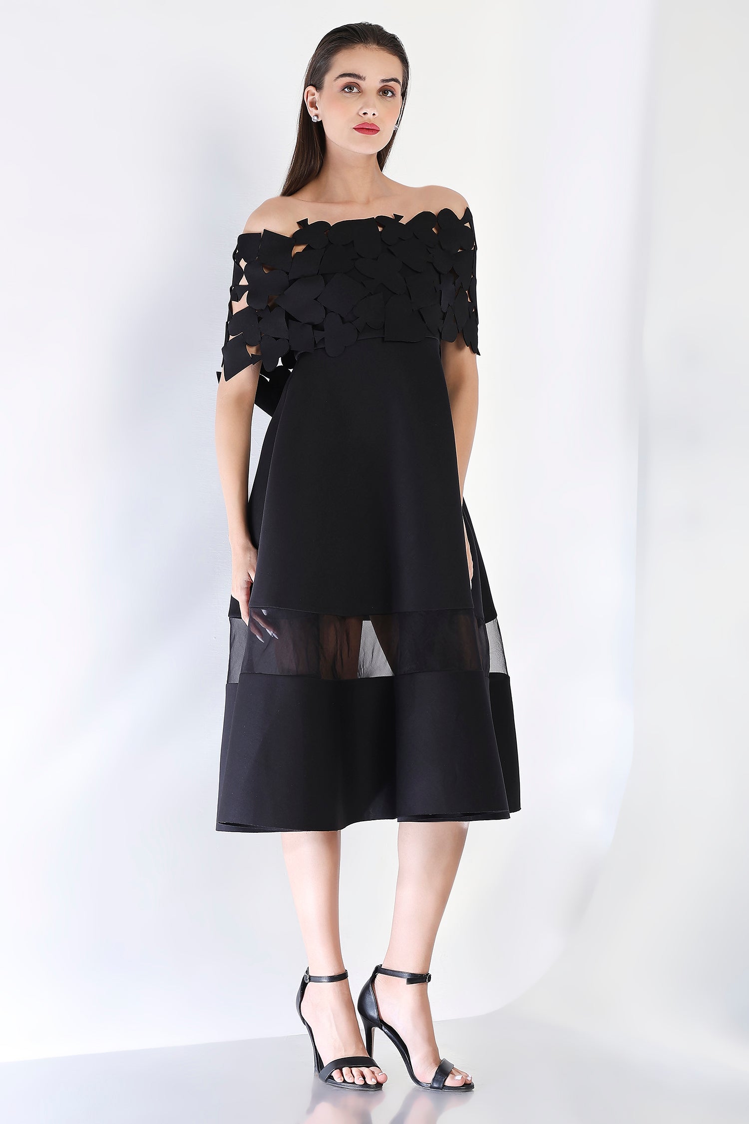 Featuring a strapless, fit and flare dress Alanna which is custom made for you, as per your height and unique measurements. The sheer panel in the base dress gives an alluring look to this classic silhouette.