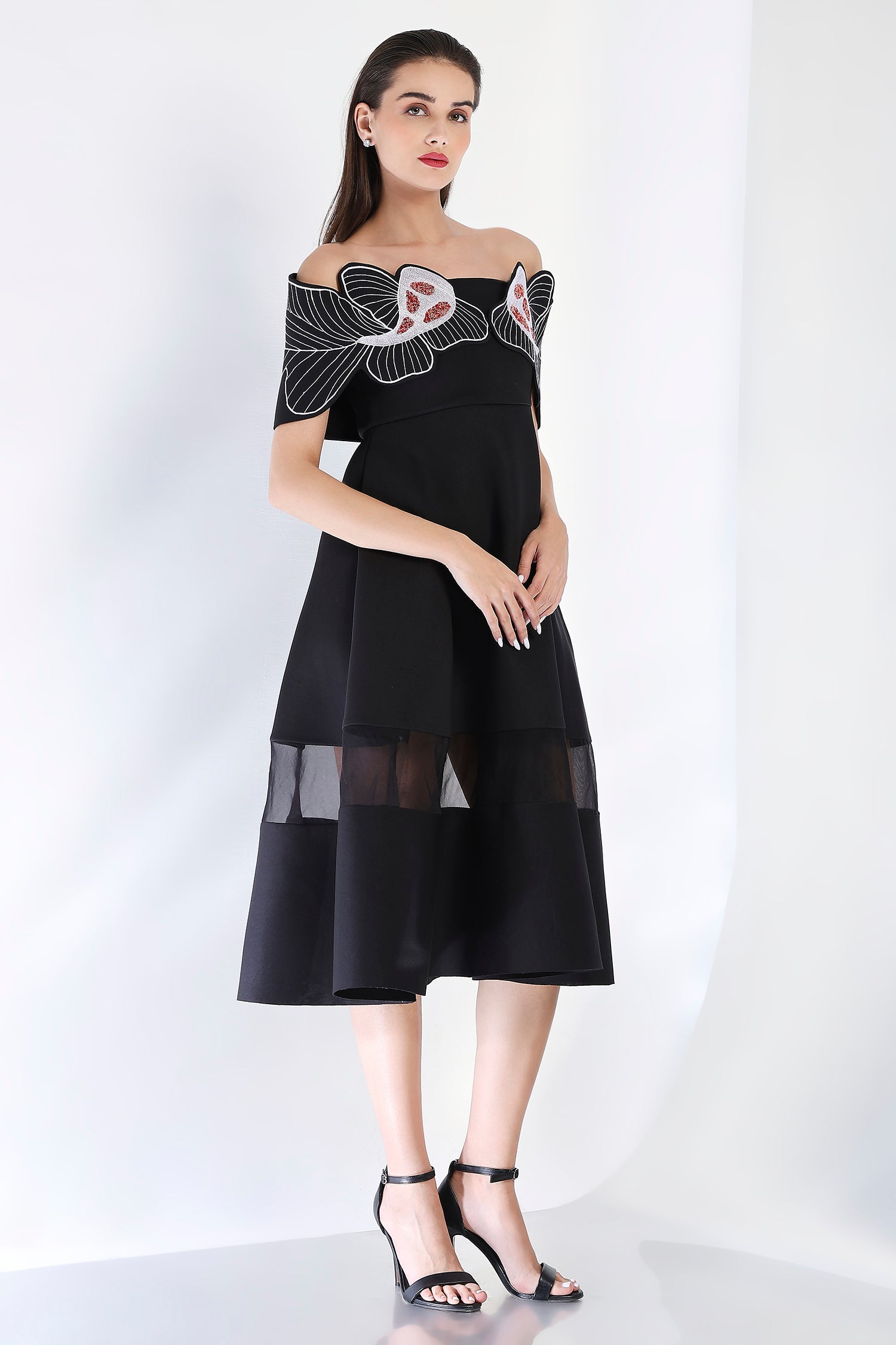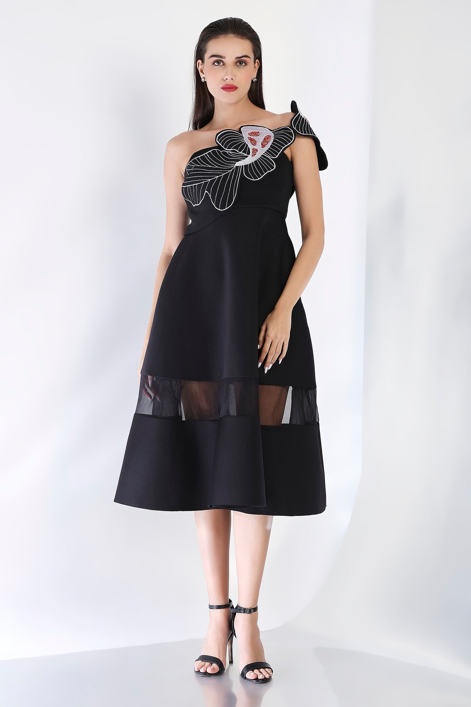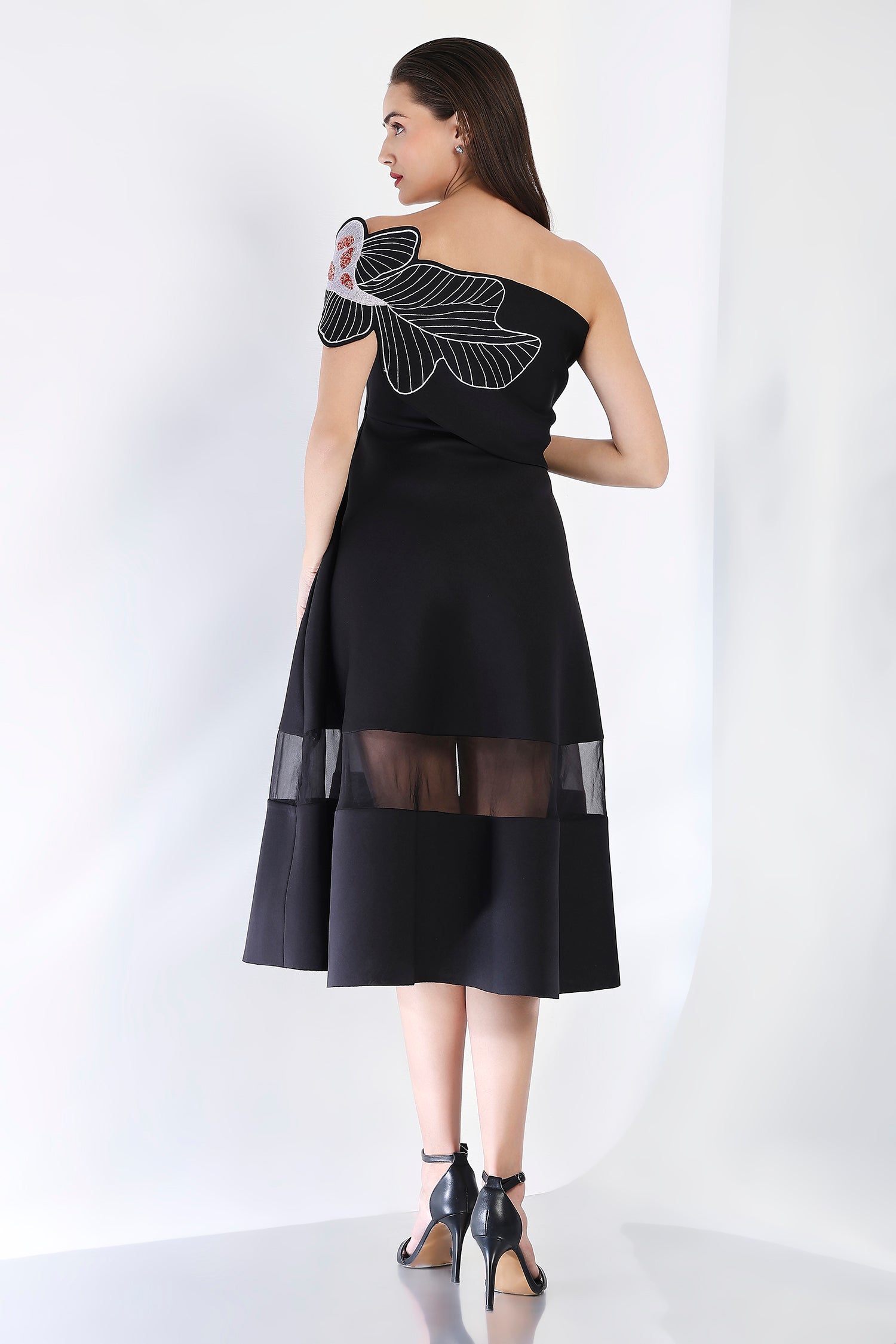 Embodying both grace and artistic flair, this strapless midi dress features sheer organza detail panels and a flattering fit-and-flare silhouette. The Koi Fish embroidered wrap, which can be styled as one-shoulder or off-shoulder, adds a striking, symbolic touch, making this dress an ideal choice for any sophisticated event.