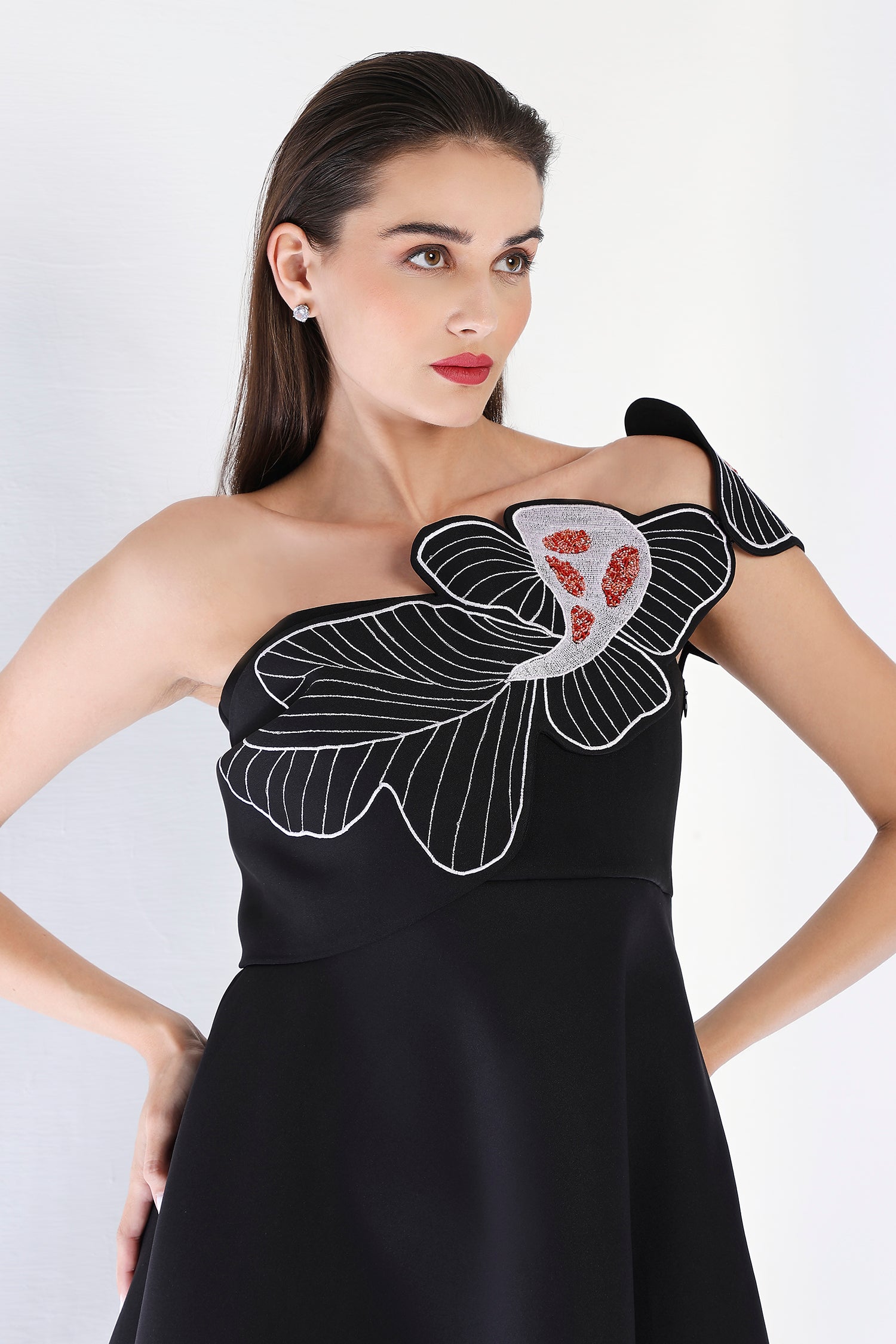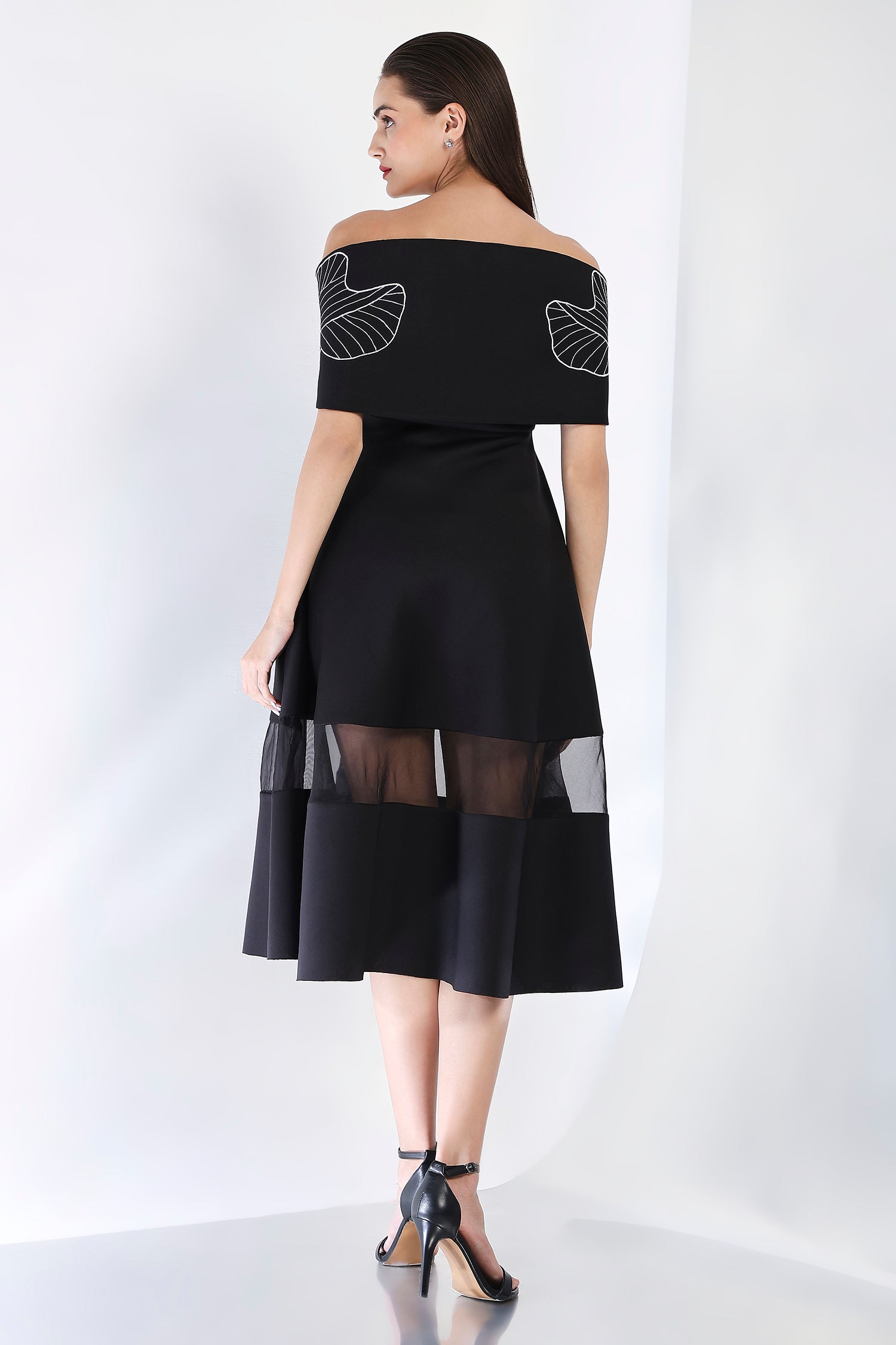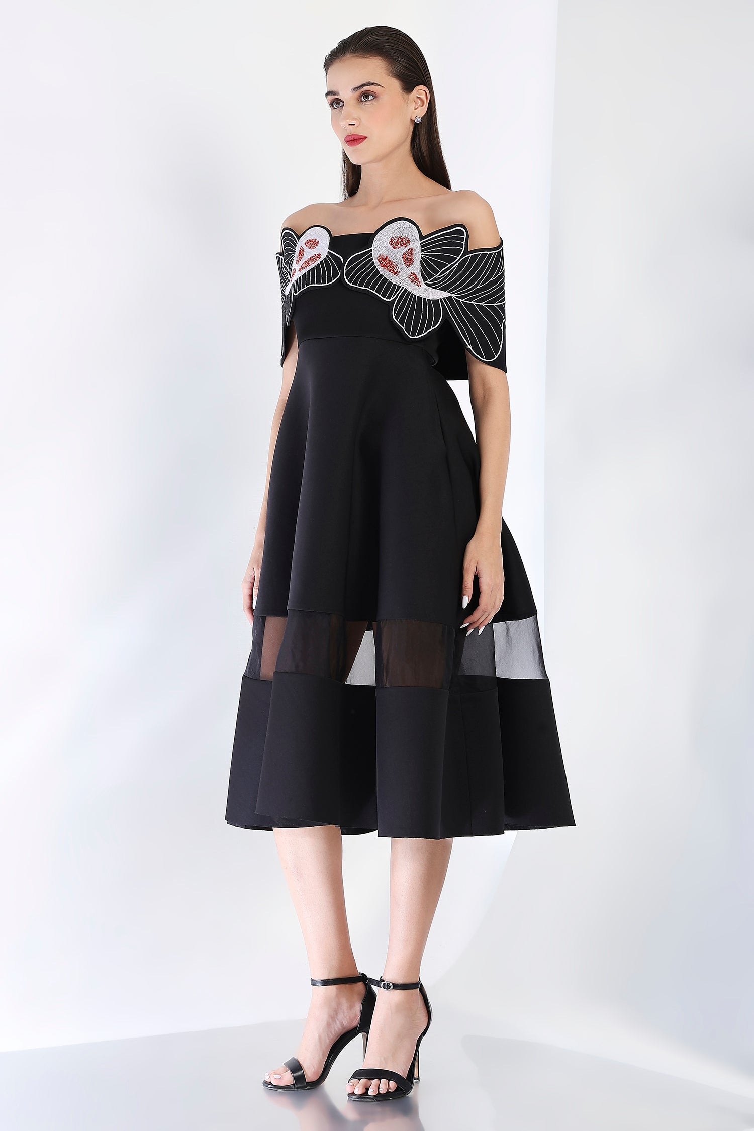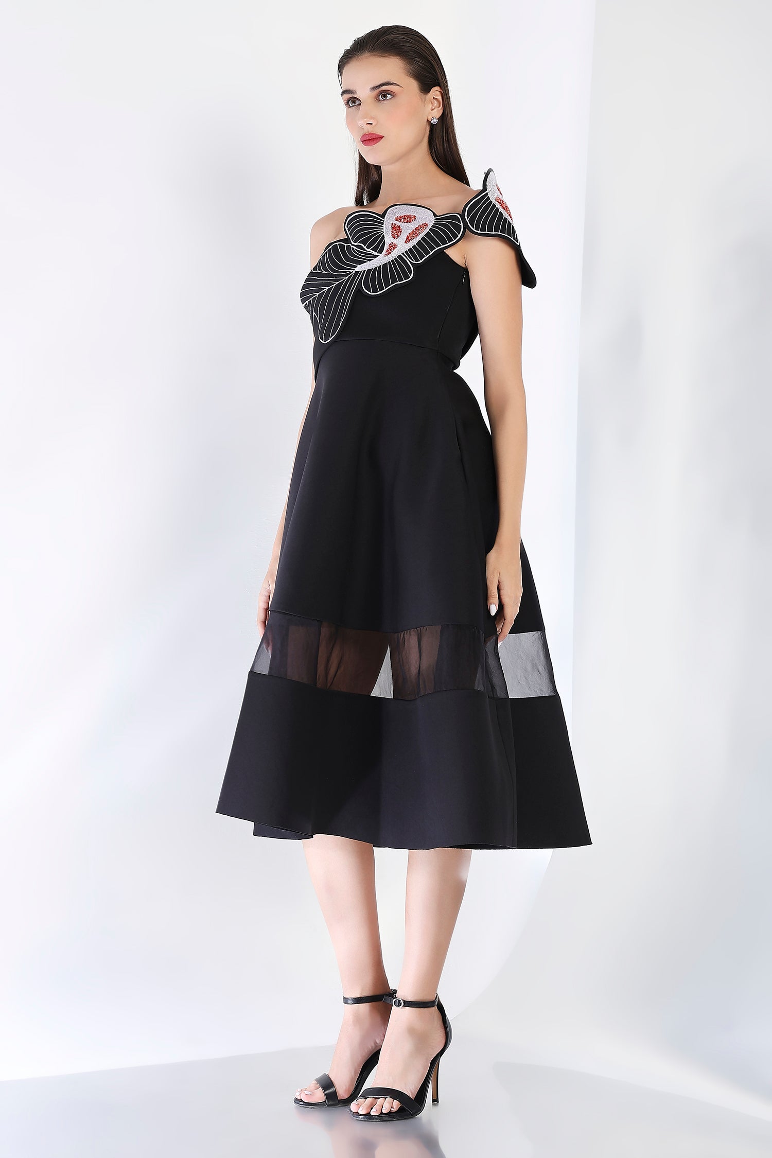 Embodying both grace and artistic flair, this strapless midi dress features sheer organza detail panels and a flattering fit-and-flare silhouette. The Koi Fish embroidered wrap, which can be styled as one-shoulder or off-shoulder, adds a striking, symbolic touch, making this dress an ideal choice for any sophisticated event.