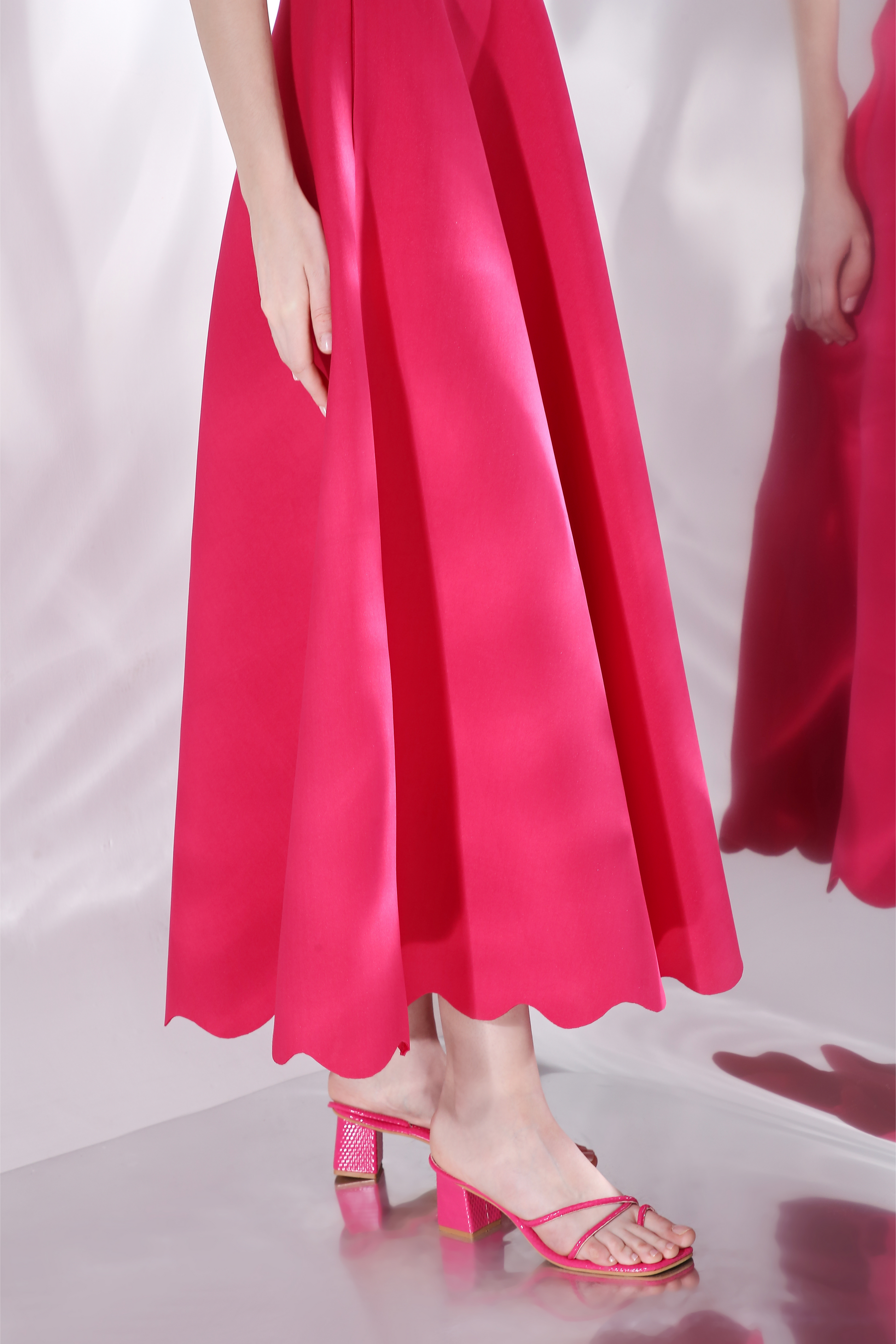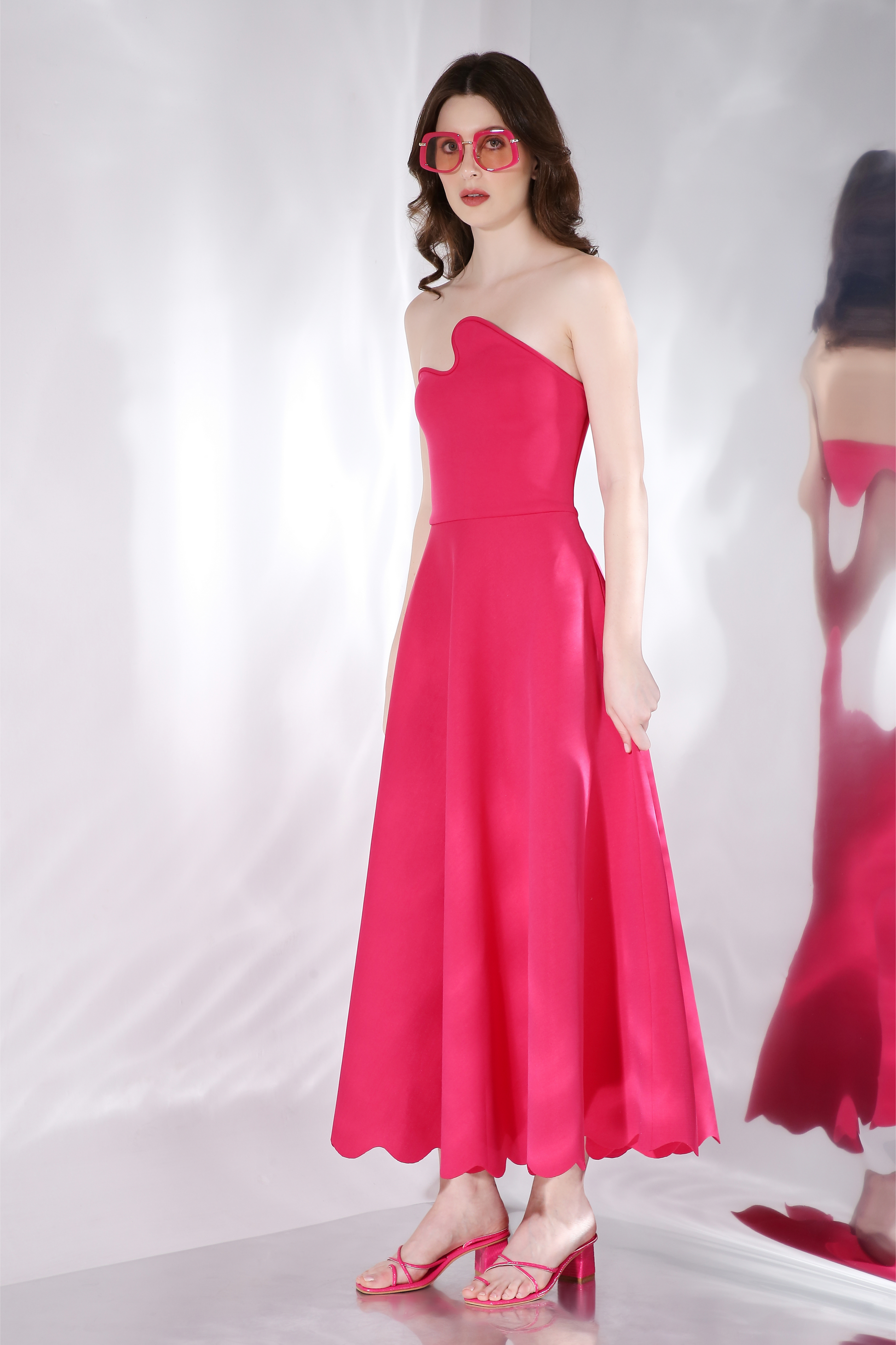 Featuring a strapless, fit and flare dress with intricately cut scallops at the edges.