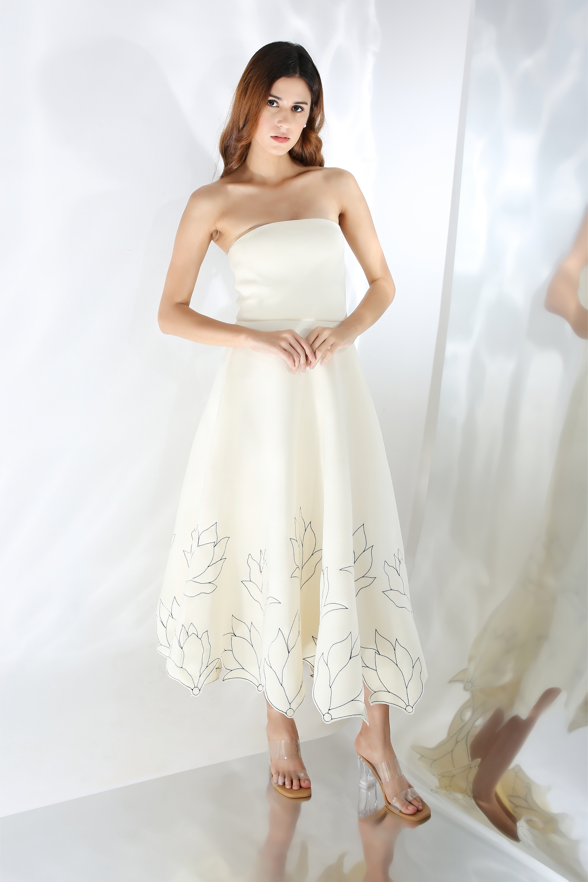 Featuring a fit and flare dress with floral hand embroidery on the base.