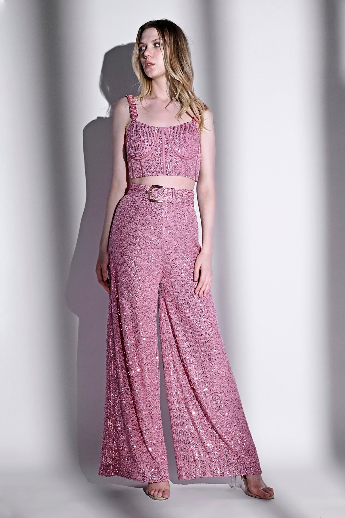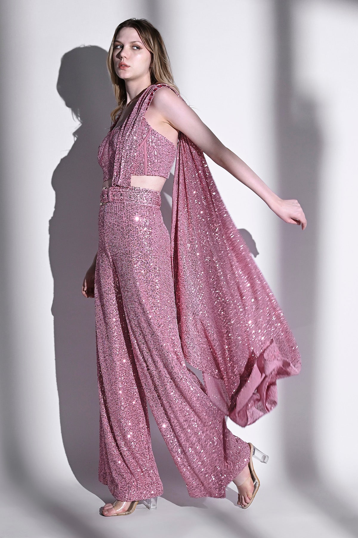 Wear the crop and pants alone or add the blazer to sizzle at a party. Convert this into a concept saree by adding the belt and the drape to an Indo-western cocktail party.
