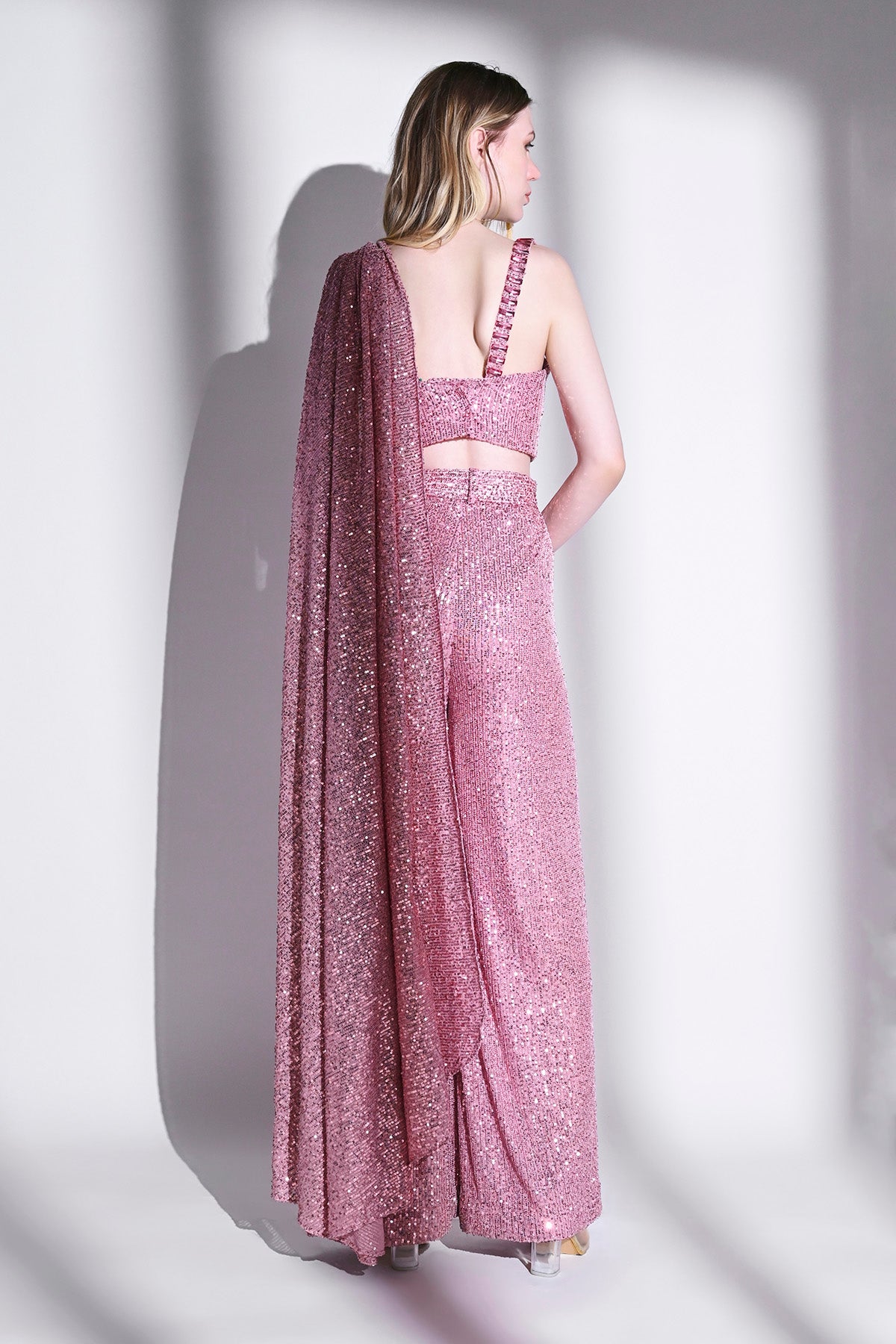 Featuring a bustier and pant set that transitions from a blazer set to a pant saree. This set includes the following pieces: