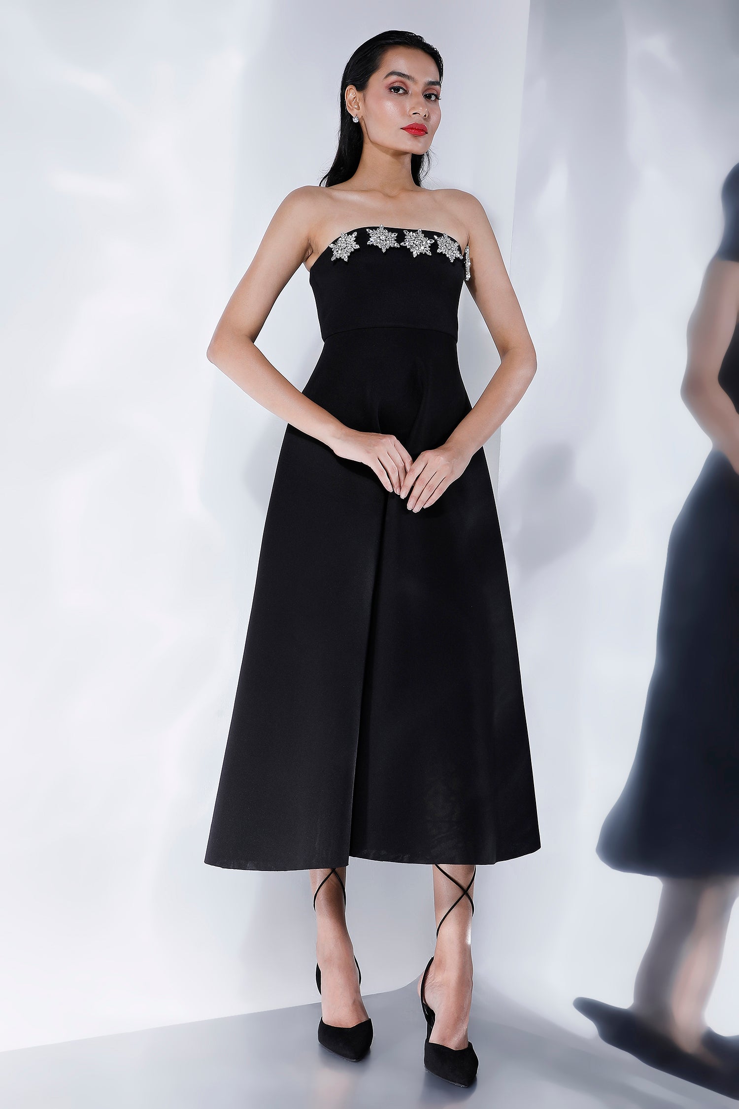 Featuring a strapless, fit and flare dress which is custom made for you, as per your height and unique measurements.