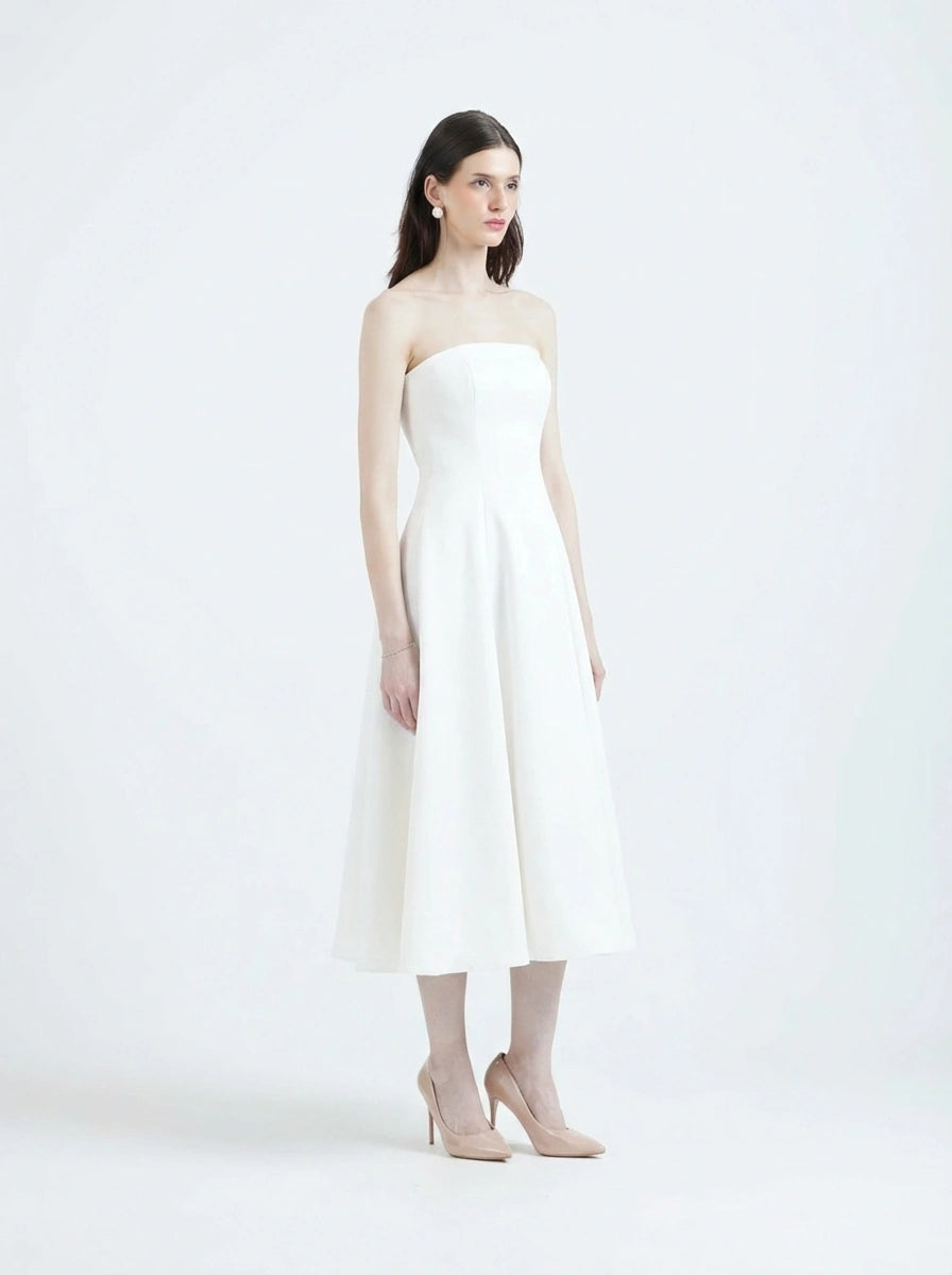 As seen on Hanna Khan, featuring a strapless dress with a sheer and opaque hem, pockets and a structured flare.