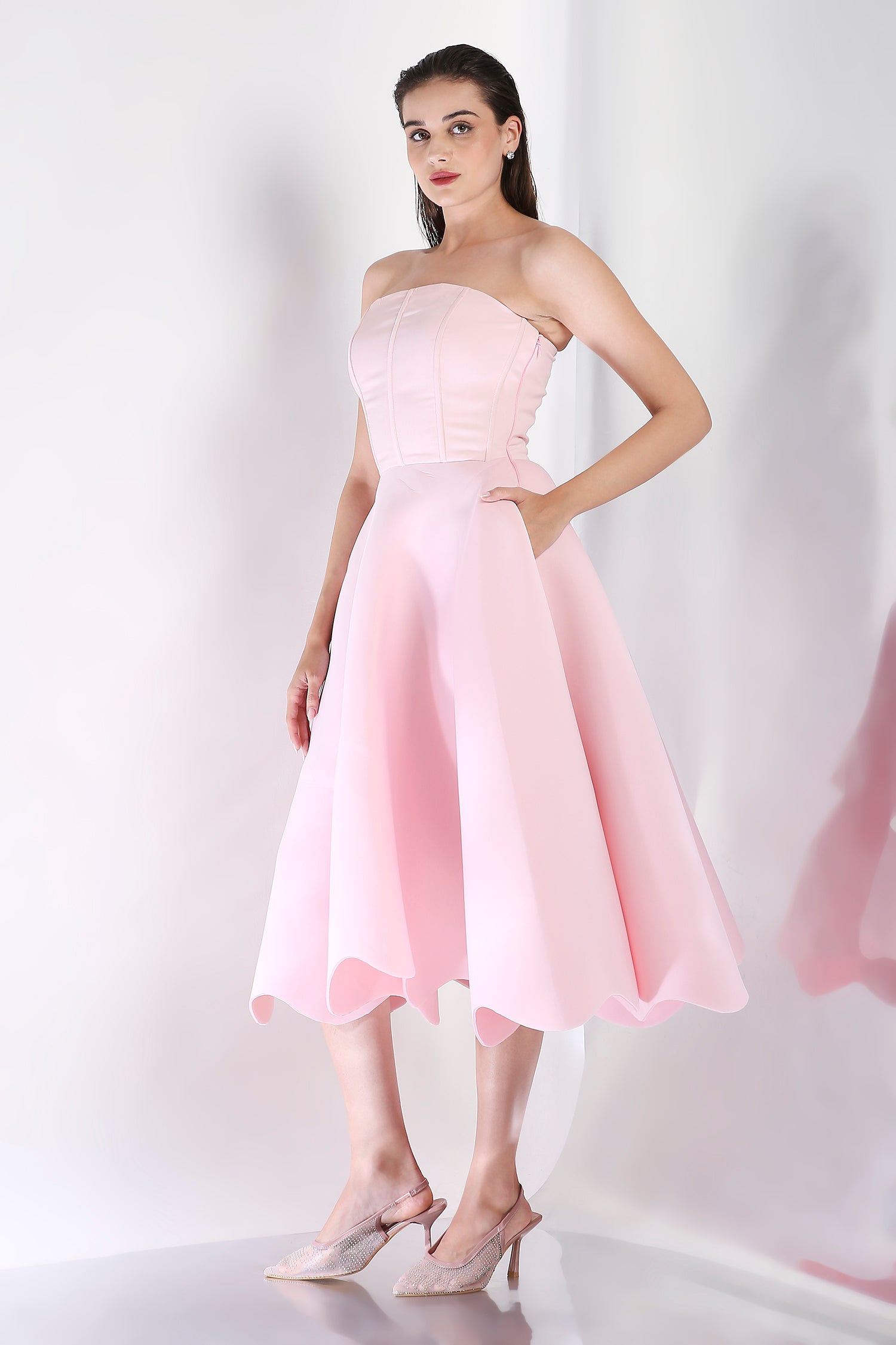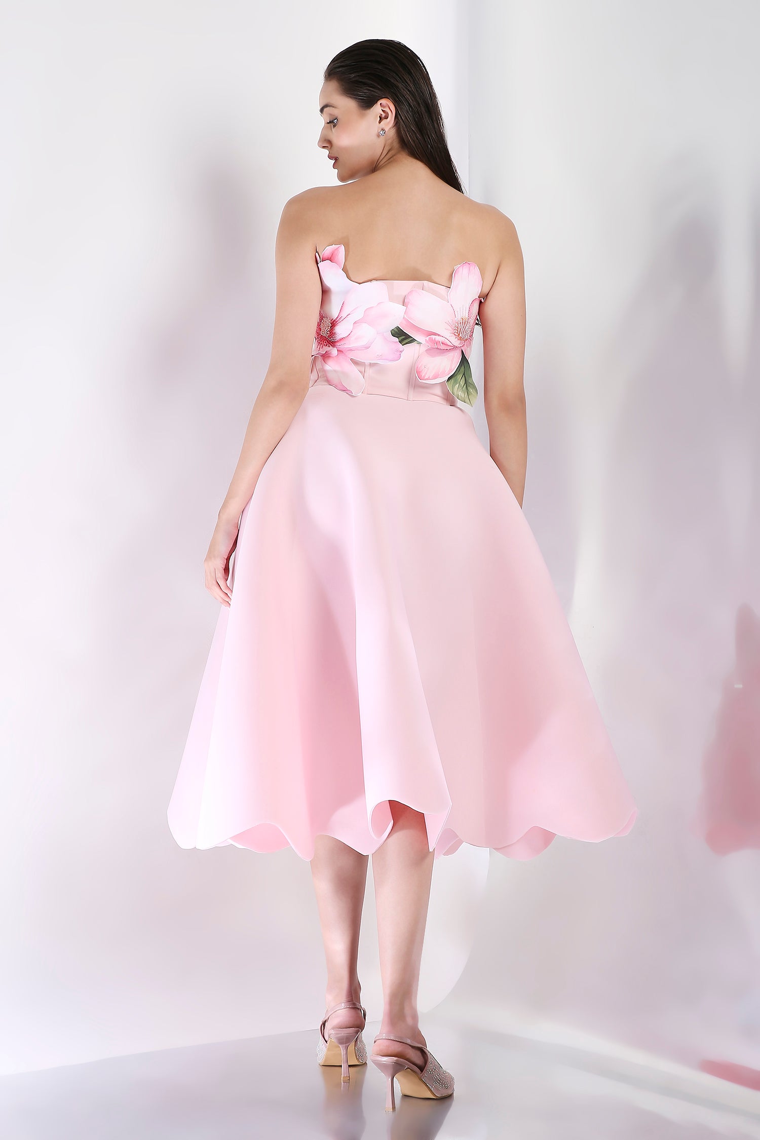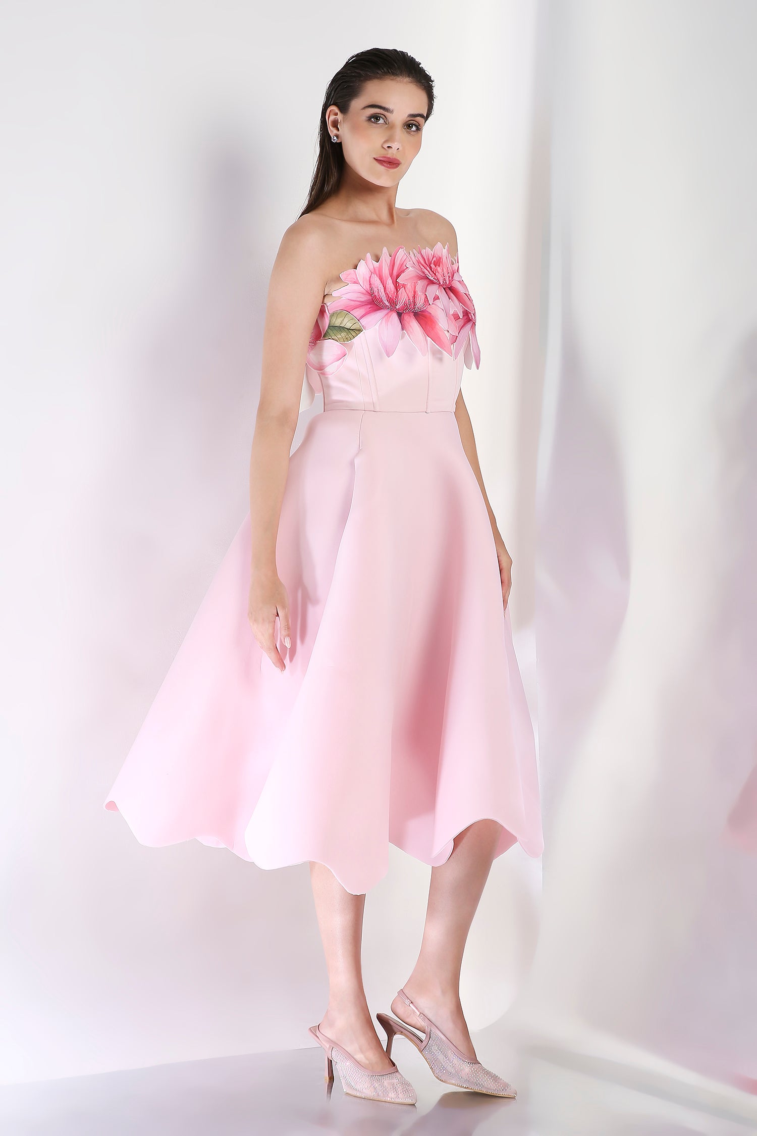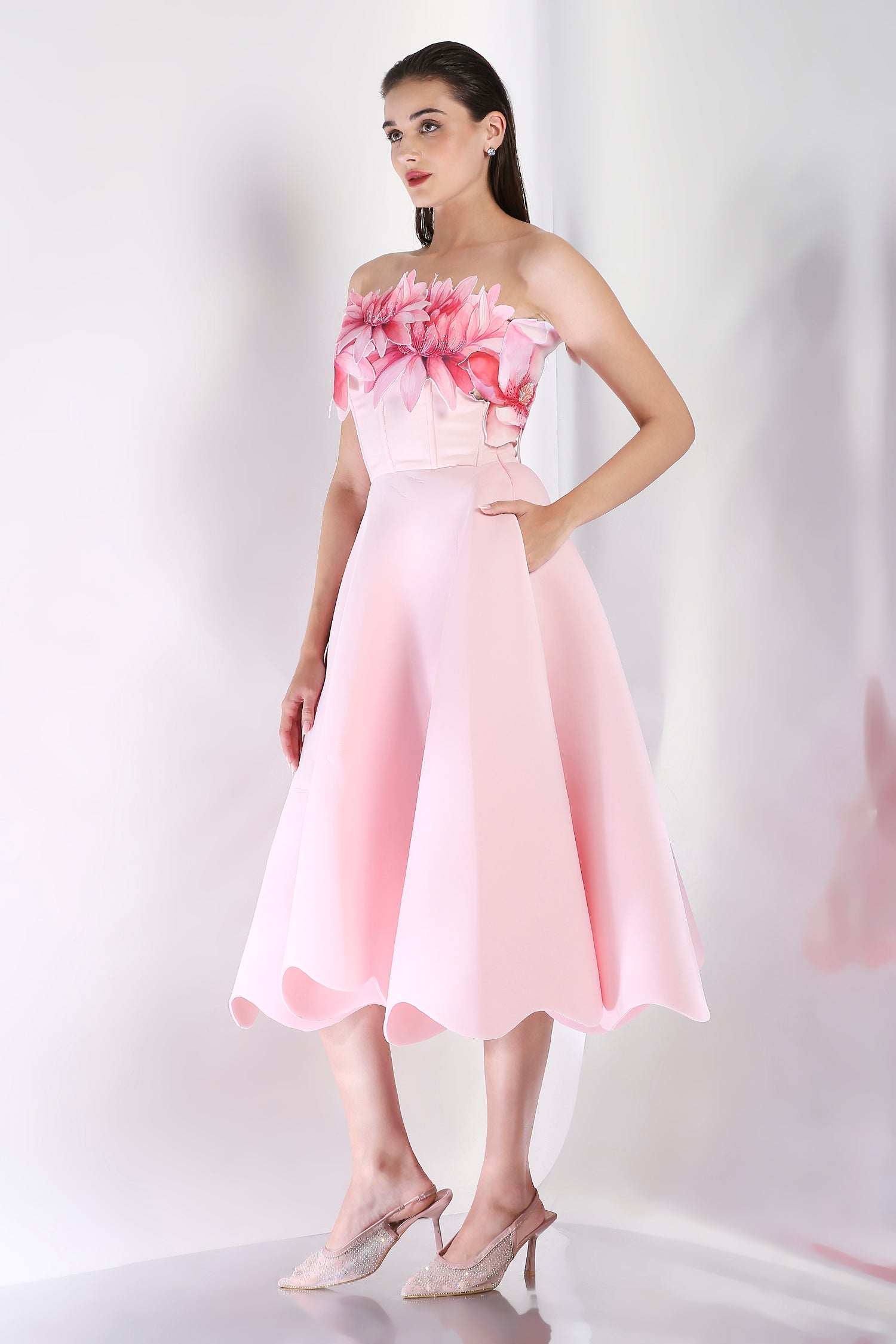 Featuring a fit and flare dress with a corseted bodice and detachable floral add-on