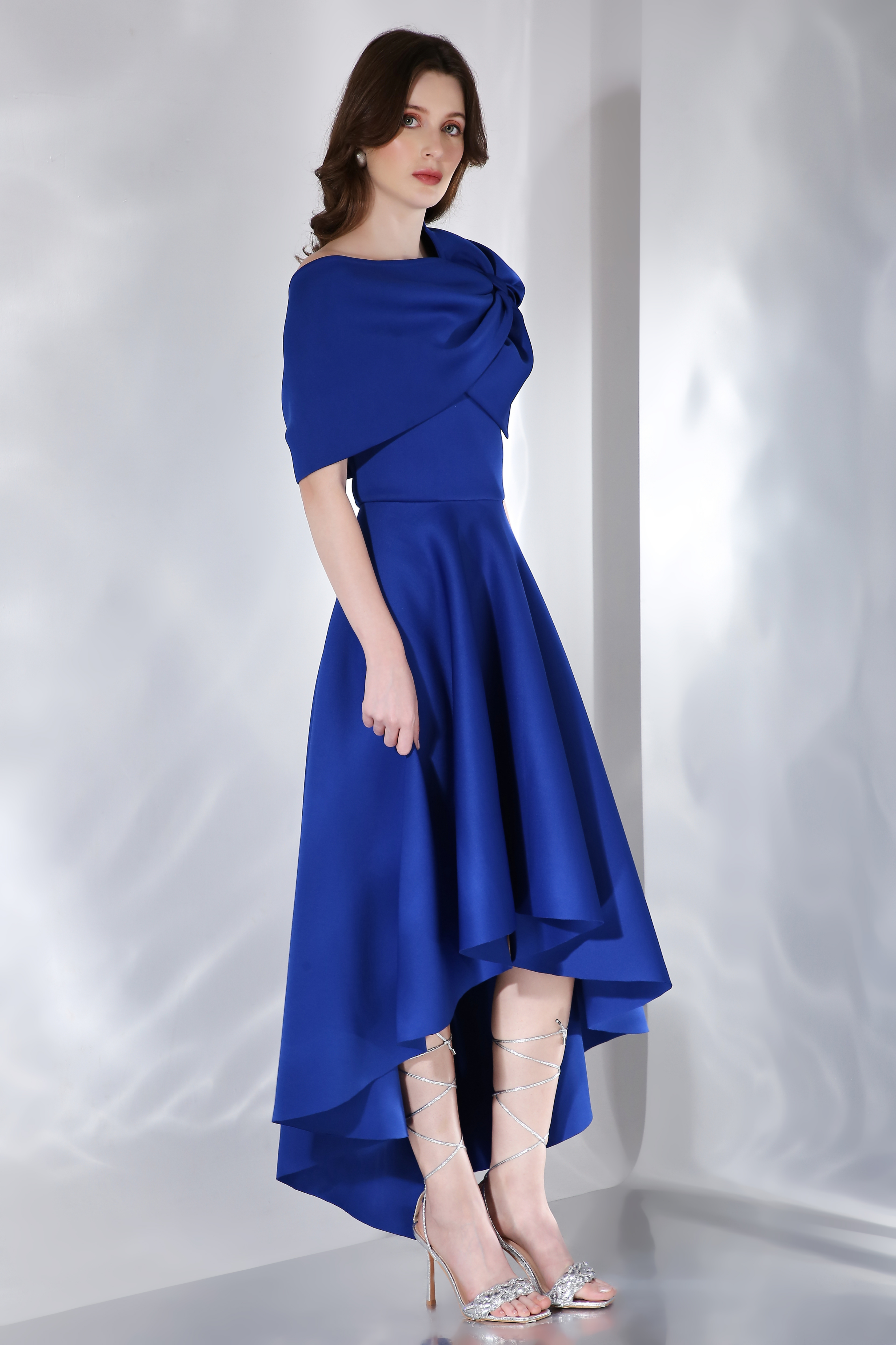 Featuring our best-selling silhouette, a strapless dress which is fitted upto the bust and flares out thereafter in a high-low fashion.