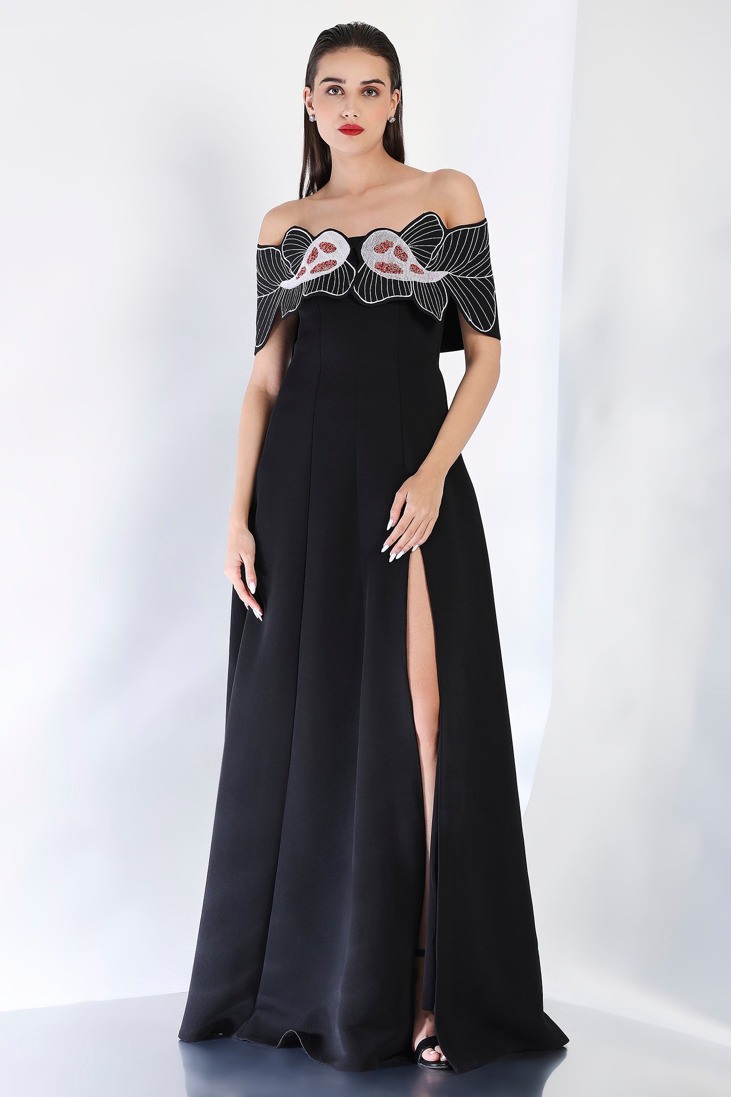 Elegant and unique, this strapless panel dress features a figure-enhancing fit and a dramatic front slit. The Koia Fish embroidered wrap, which can be styled as one-shoulder or off-shoulder, brings a distinctive, artistic touch to the ensemble, making it perfect for those seeking a fashionable and elegant look for special events.