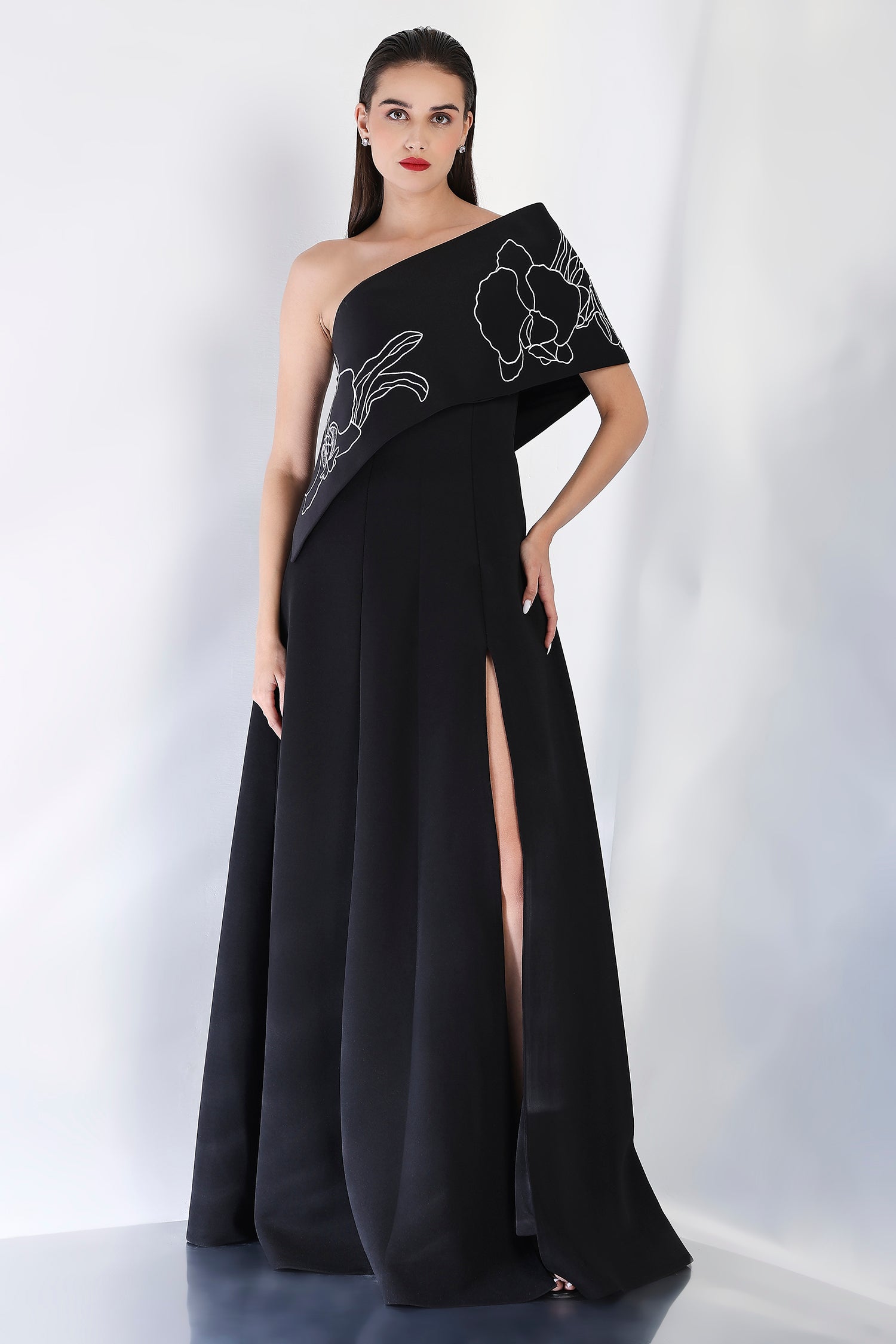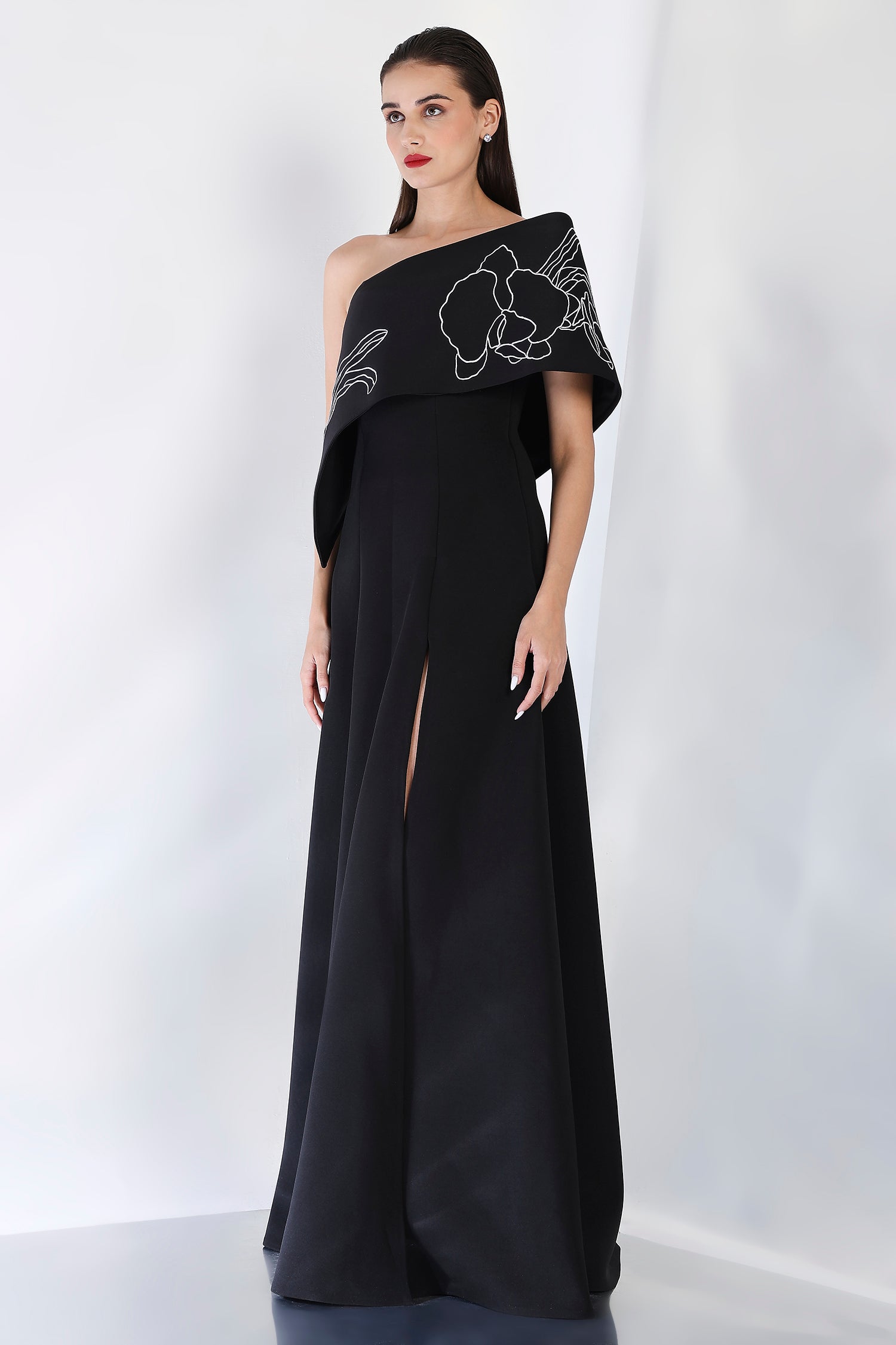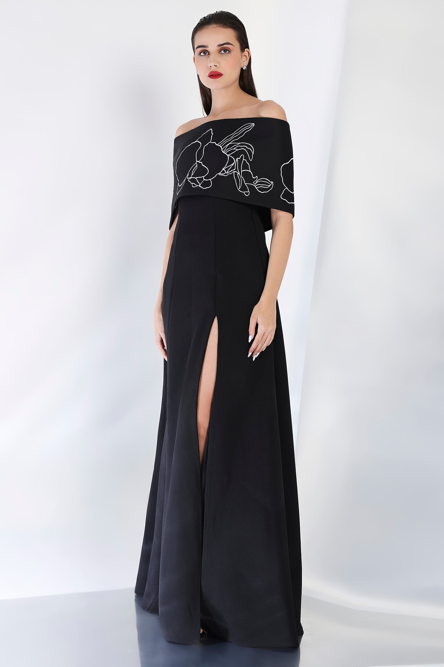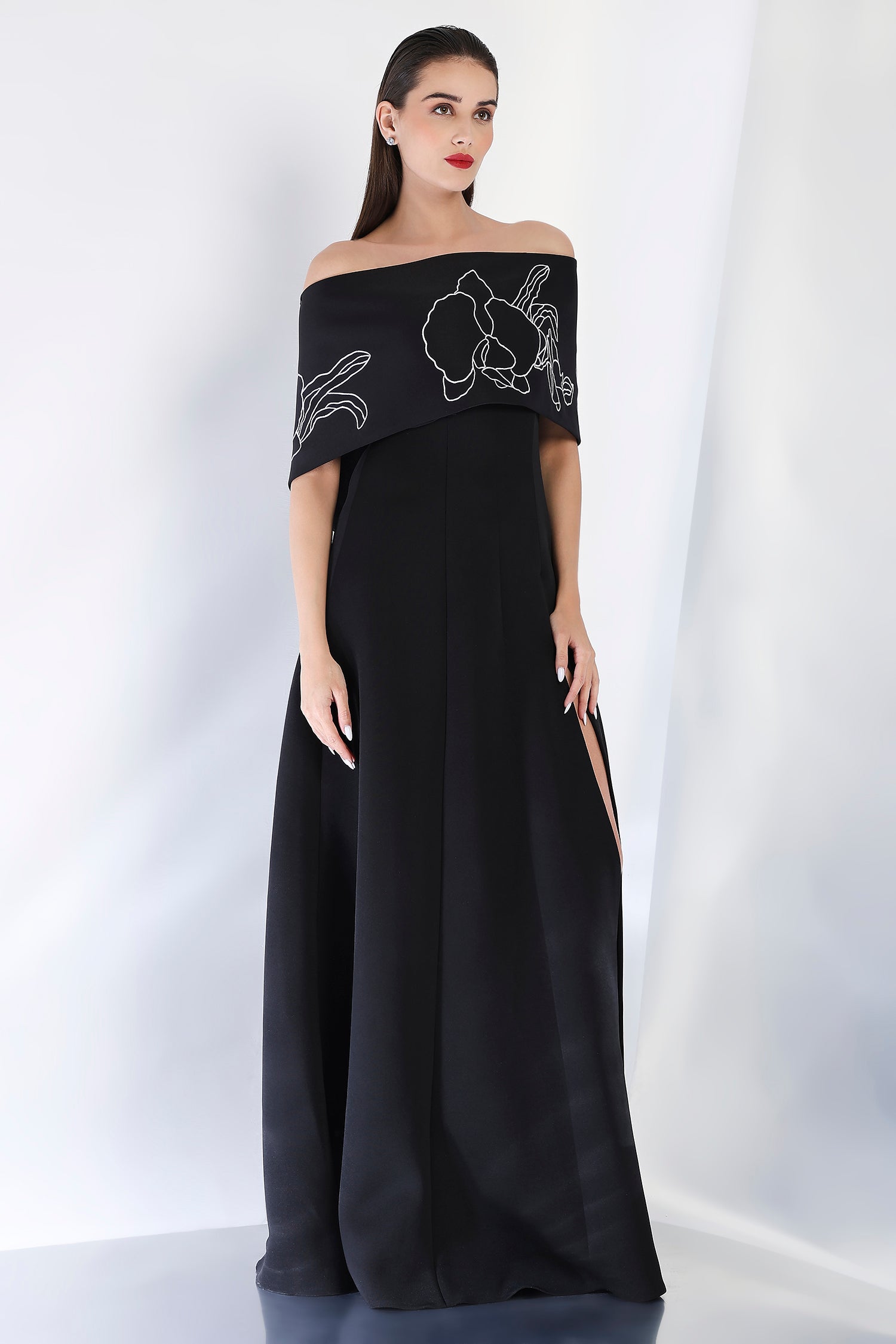 This strapless panel dress with a sultry front slit is paired with the Vero embroidered wrap, which can be styled either one-shoulder or off-shoulder. The intricate embroidery adds an element of artistry and refinement, making this an exquisite choice for an evening event where sophistication and style are a must.
