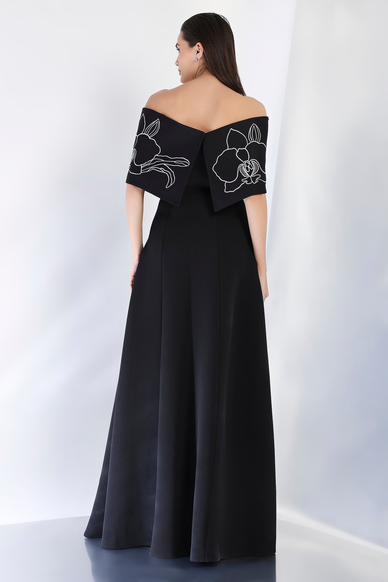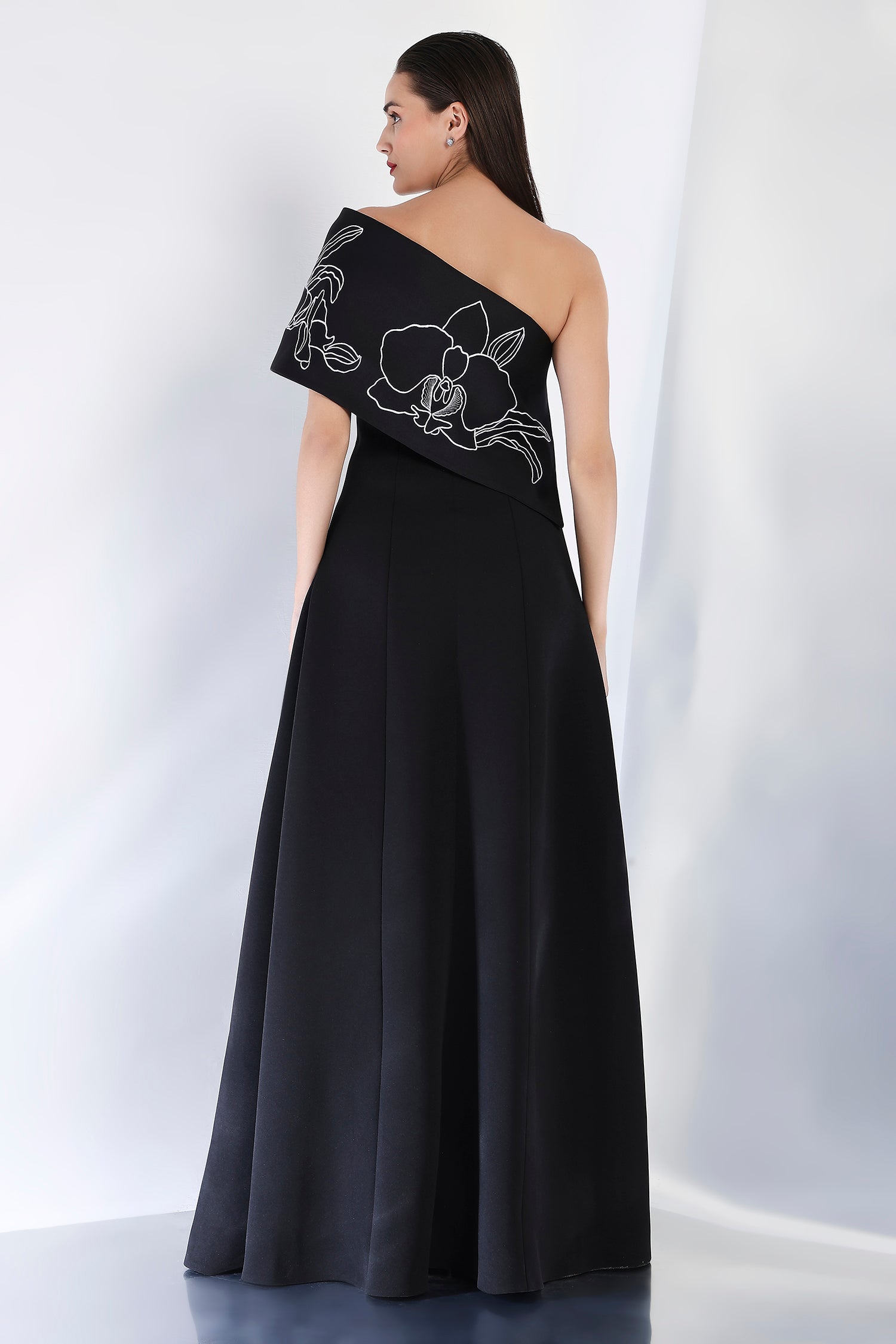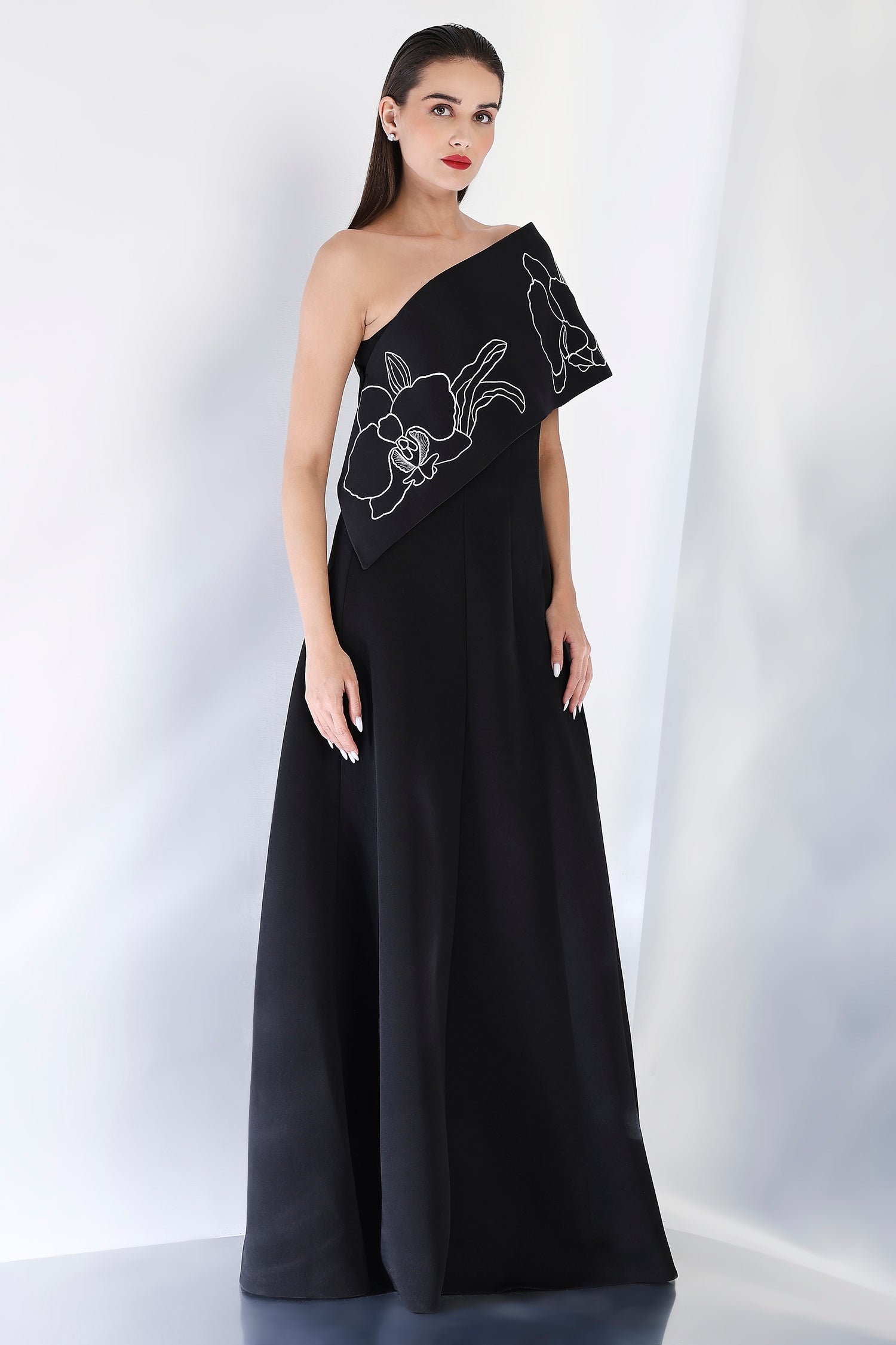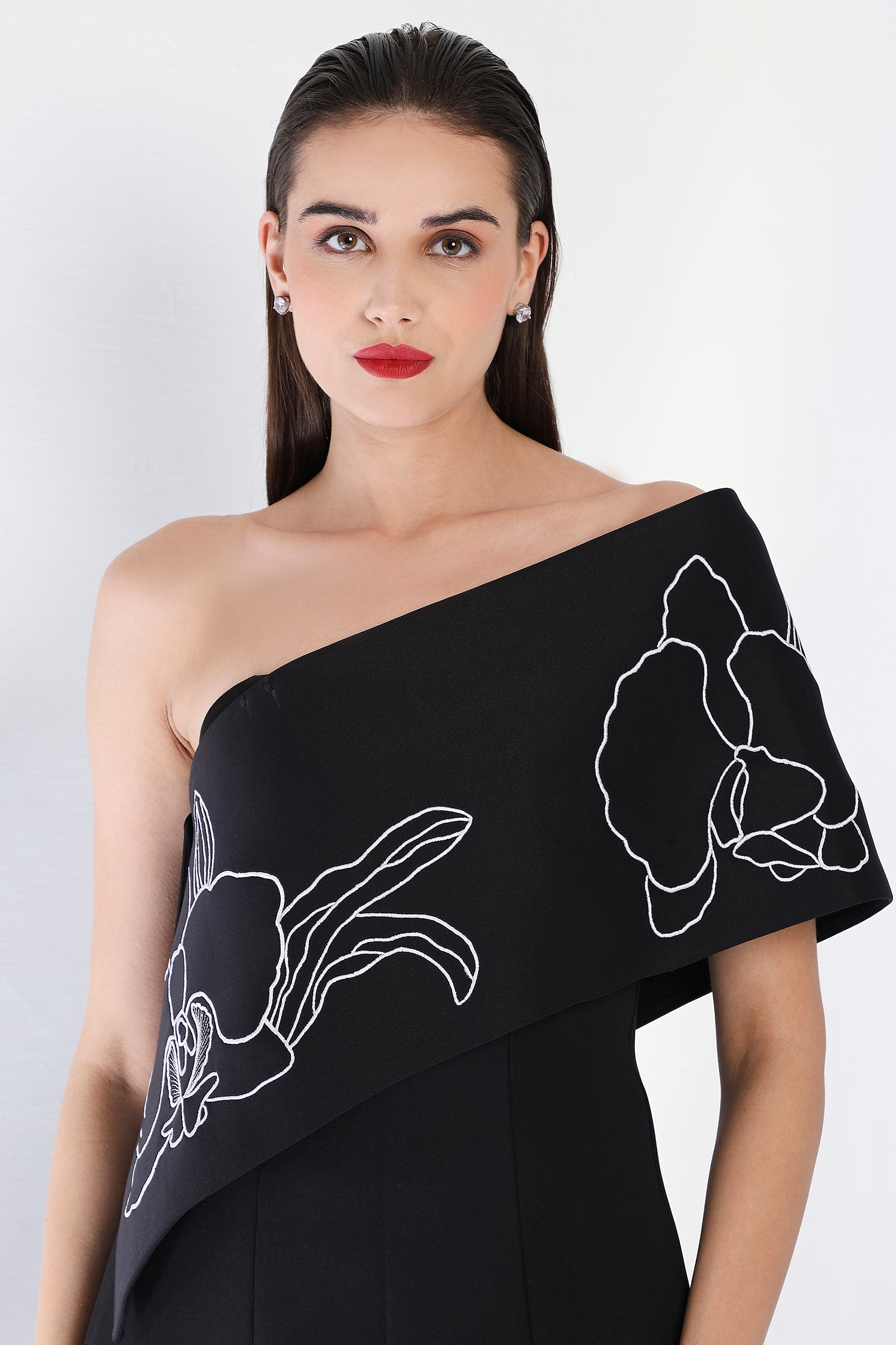 This strapless panel dress with a sultry front slit is paired with the Vero embroidered wrap, which can be styled either one-shoulder or off-shoulder. The intricate embroidery adds an element of artistry and refinement, making this an exquisite choice for an evening event where sophistication and style are a must.