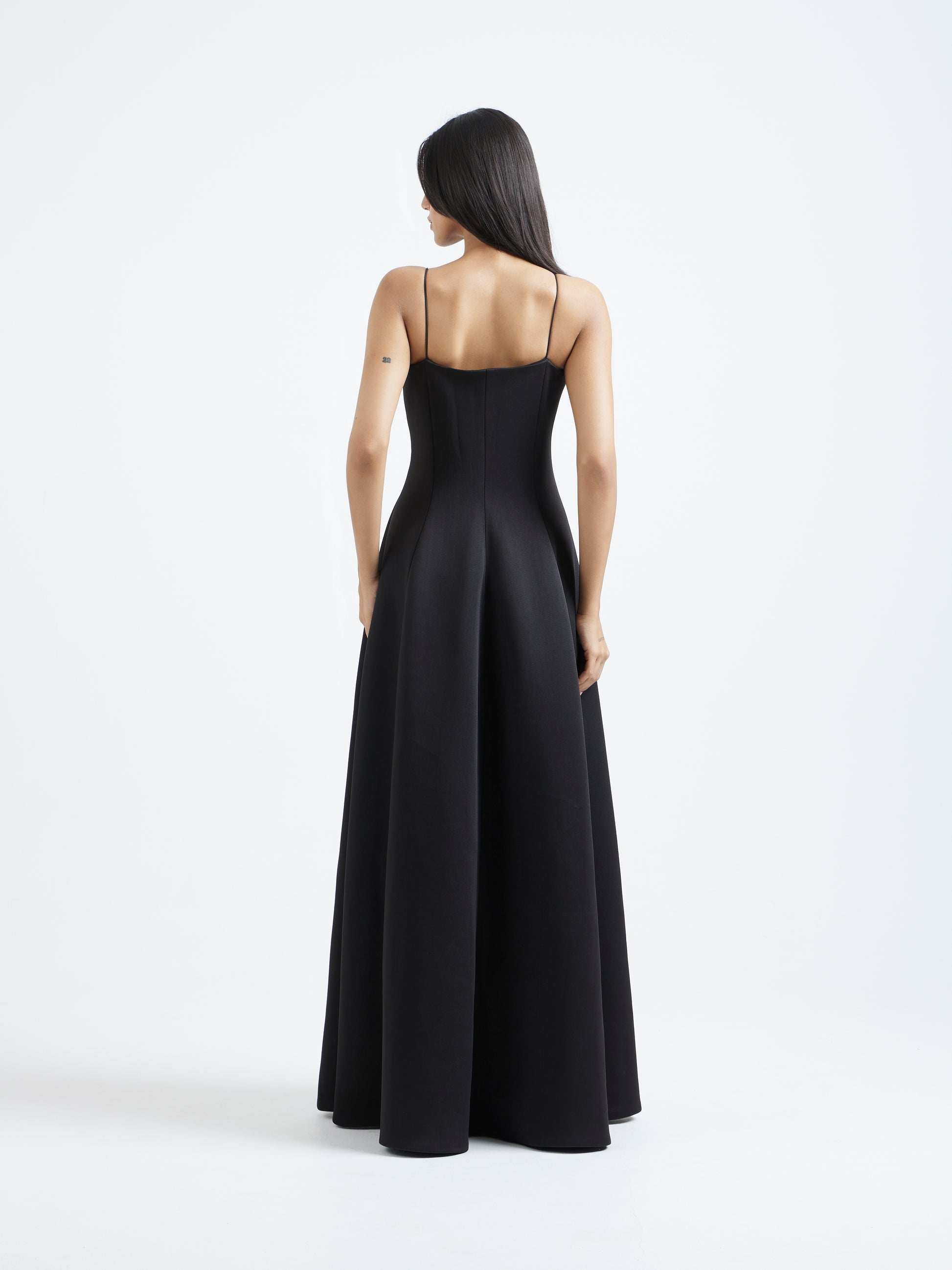 Kaira exemplifies timeless sophistication with a modern, structured finish and an optional thigh high slit.