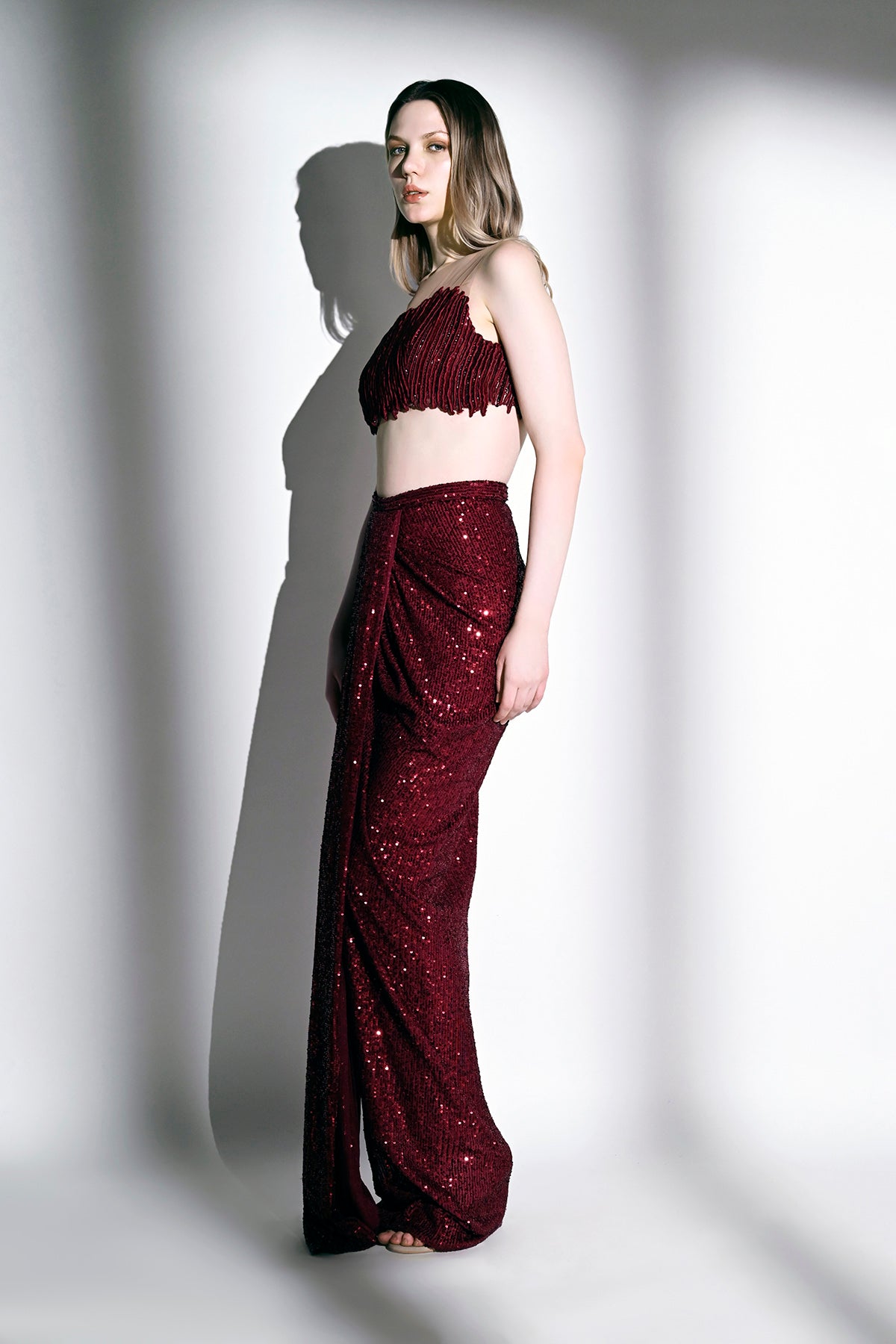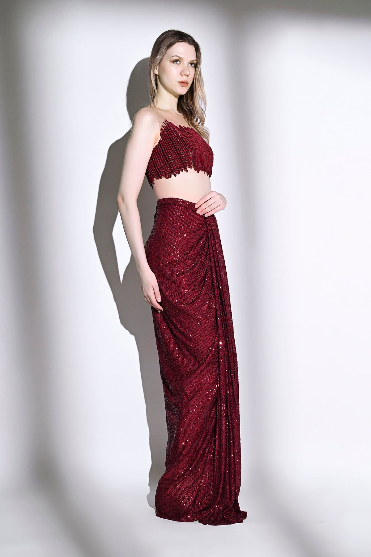 Featuring a crop and skirt set with a detachable saree drape. The hand embroidered blouse comes on a net base with asymmetric lines of beads, sequins and satin.