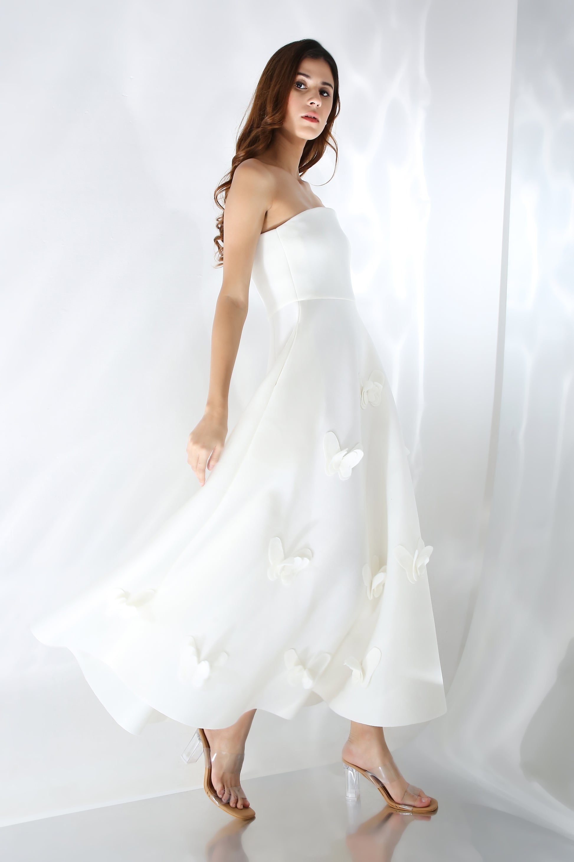 Amyra is a sculptural strapless dress crafted in smooth neoprene, designed to hold its shape while flattering yours. It features a structured flare that falls away from the body with elegance — and yes, it comes with pockets.
