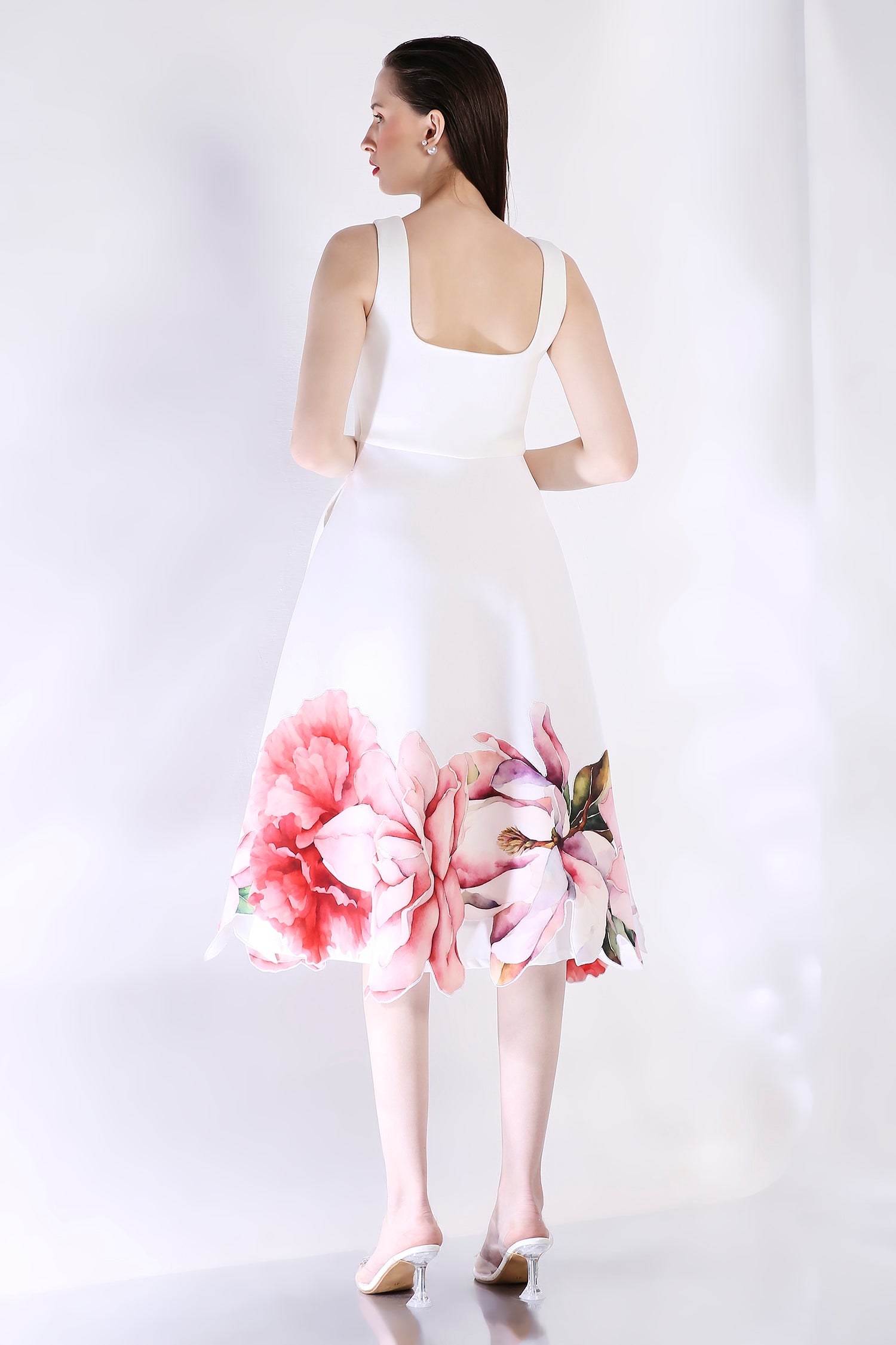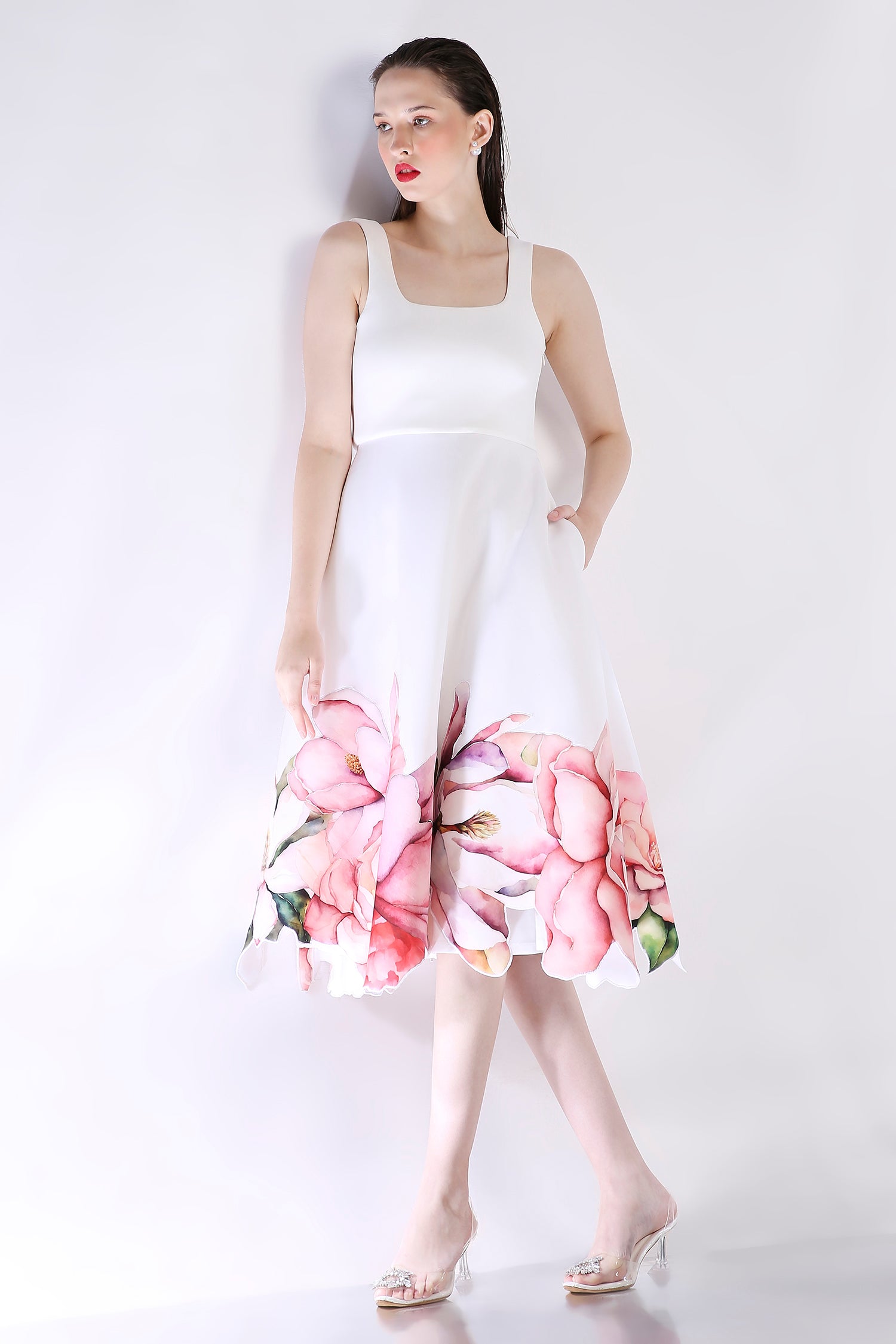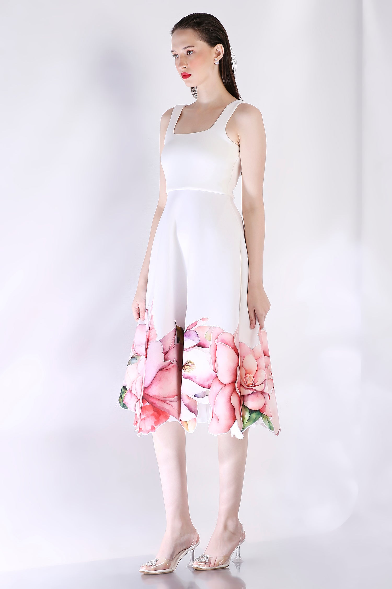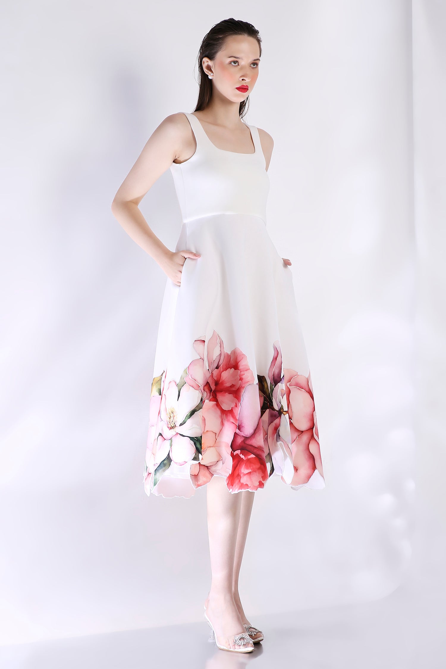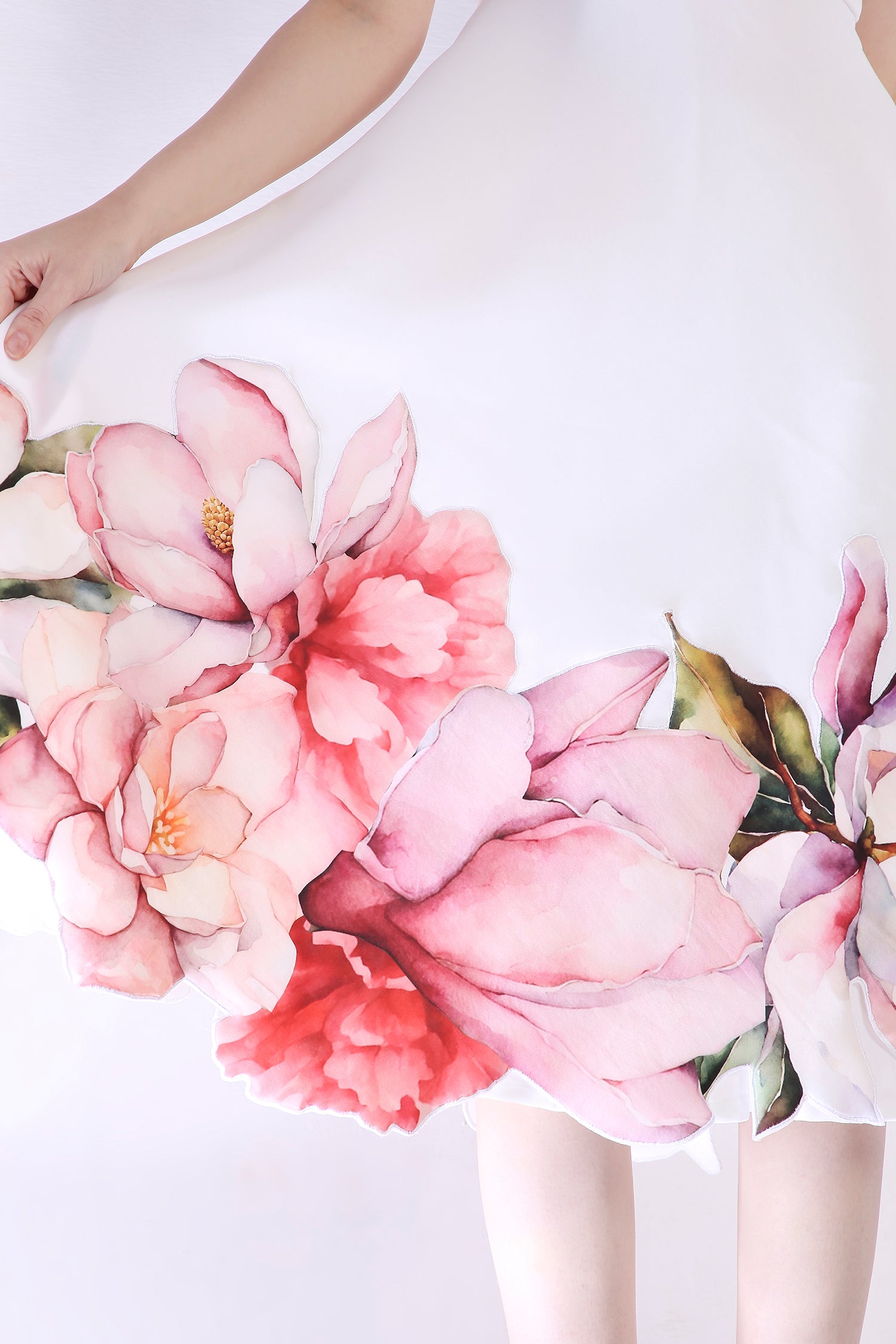 The Nushka dress is adorned with floral appliqué work, emphasised with cutwork.