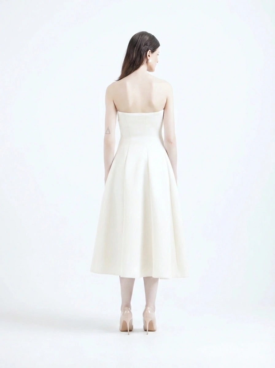 Its classic fit-and-flare silhouette is defined by a strapless bodice and a voluminous skirt, tailored to cinch at the natural waist. This versatile garment is designed to be instantly personalised using our Detachable Overlays, transitioning the sophisticated black look seamlessly across seasons and occasions.