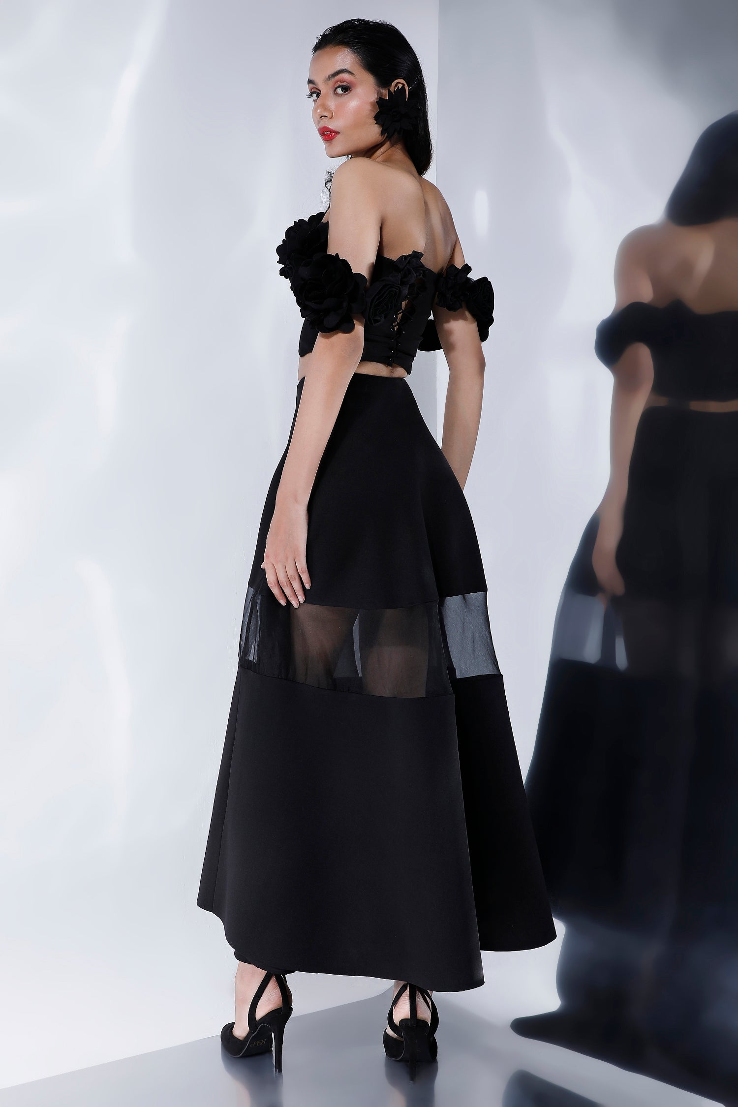 The handmade, three dimensional flowers are attached to the crop and the floral straps are detachable. They can be worn on or off the shoulder.